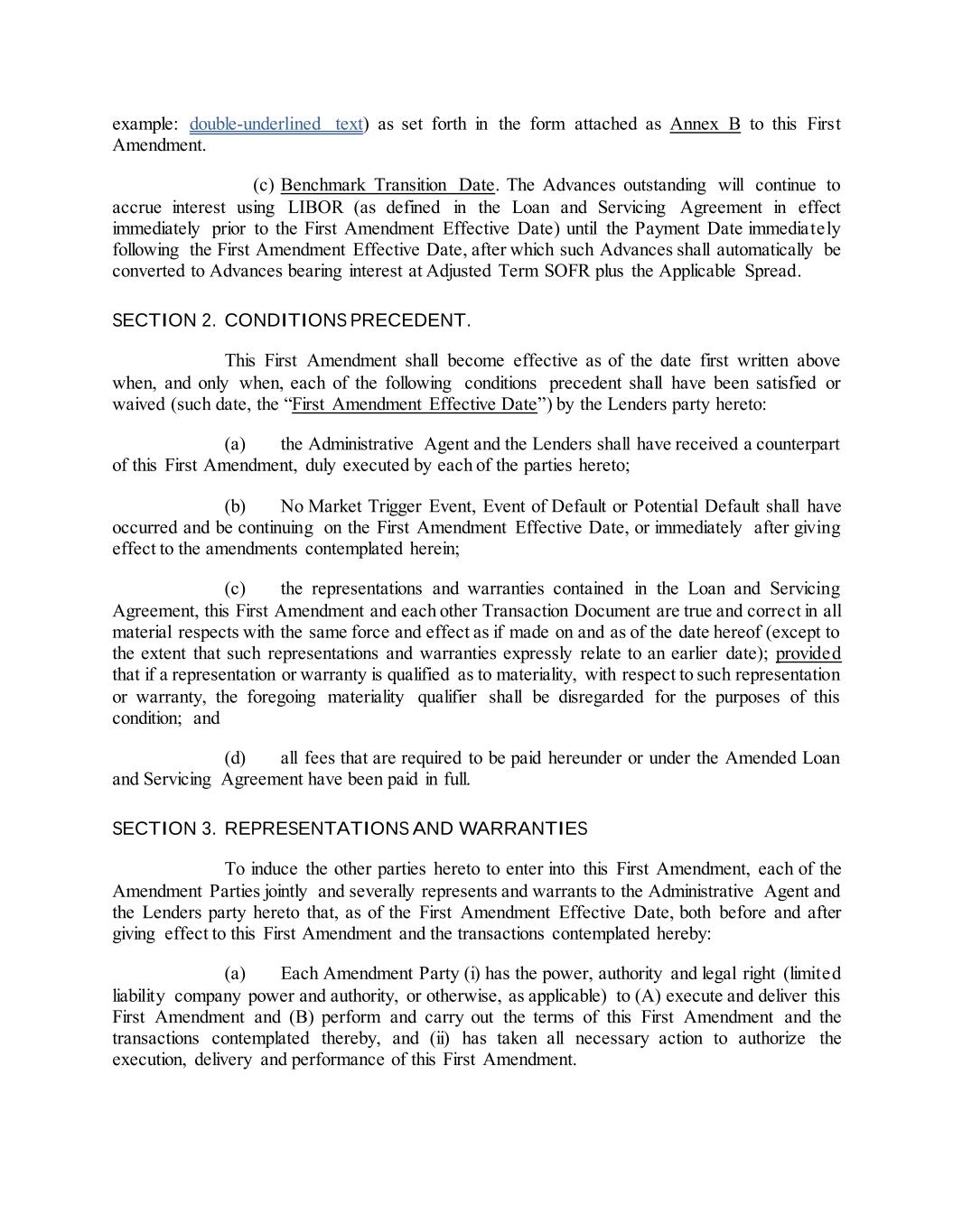 example: double‐underlined text) as set forth in the form attached as Annex B to this First Amendment. (c) Benchmark Transition Date. The Advances outstanding will continue to accrue interest using LIBOR (as defined in the Loan and Servicing Agreement in effect immediately prior to the First Amendment Effective Date) until the Payment Date immediately following the First Amendment Effective Date, after which such Advances shall automatically be converted to Advances bearing interest at Adjusted Term SOFR plus the Applicable Spread. SECTION 2. CONDITIONS PRECEDENT. This First Amendment shall become effective as of the date first written above when, and only when, each of the following conditions precedent shall have been satisfied or waived (such date, the “First Amendment Effective Date”) by the Lenders party hereto: (a) the Administrative Agent and the Lenders shall have received a counterpart of this First Amendment, duly executed by each of the parties hereto; (b) No Market Trigger Event, Event of Default or Potential Default shall have occurred and be continuing on the First Amendment Effective Date, or immediately after giving effect to the amendments contemplated herein; (c) the representations and warranties contained in the Loan and Servicing Agreement, this First Amendment and each other Transaction Document are true and correct in all material respects with the same force and effect as if made on and as of the date hereof (except to the extent that such representations and warranties expressly relate to an earlier date); provided that if a representation or warranty is qualified as to materiality, with respect to such representation or warranty, the foregoing materiality qualifier shall be disregarded for the purposes of this condition; and (d) all fees that are required to be paid hereunder or under the Amended Loan and Servicing Agreement have been paid in full. SECTION 3. REPRESENTATIONS AND WARRANTIES To induce the other parties hereto to enter into this First Amendment, each of the Amendment Parties jointly and severally represents and warrants to the Administrative Agent and the Lenders party hereto that, as of the First Amendment Effective Date, both before and after giving effect to this First Amendment and the transactions contemplated hereby: (a) Each Amendment Party (i) has the power, authority and legal right (limited liability company power and authority, or otherwise, as applicable) to (A) execute and deliver this First Amendment and (B) perform and carry out the terms of this First Amendment and the transactions contemplated thereby, and (ii) has taken all necessary action to authorize the execution, delivery and performance of this First Amendment.