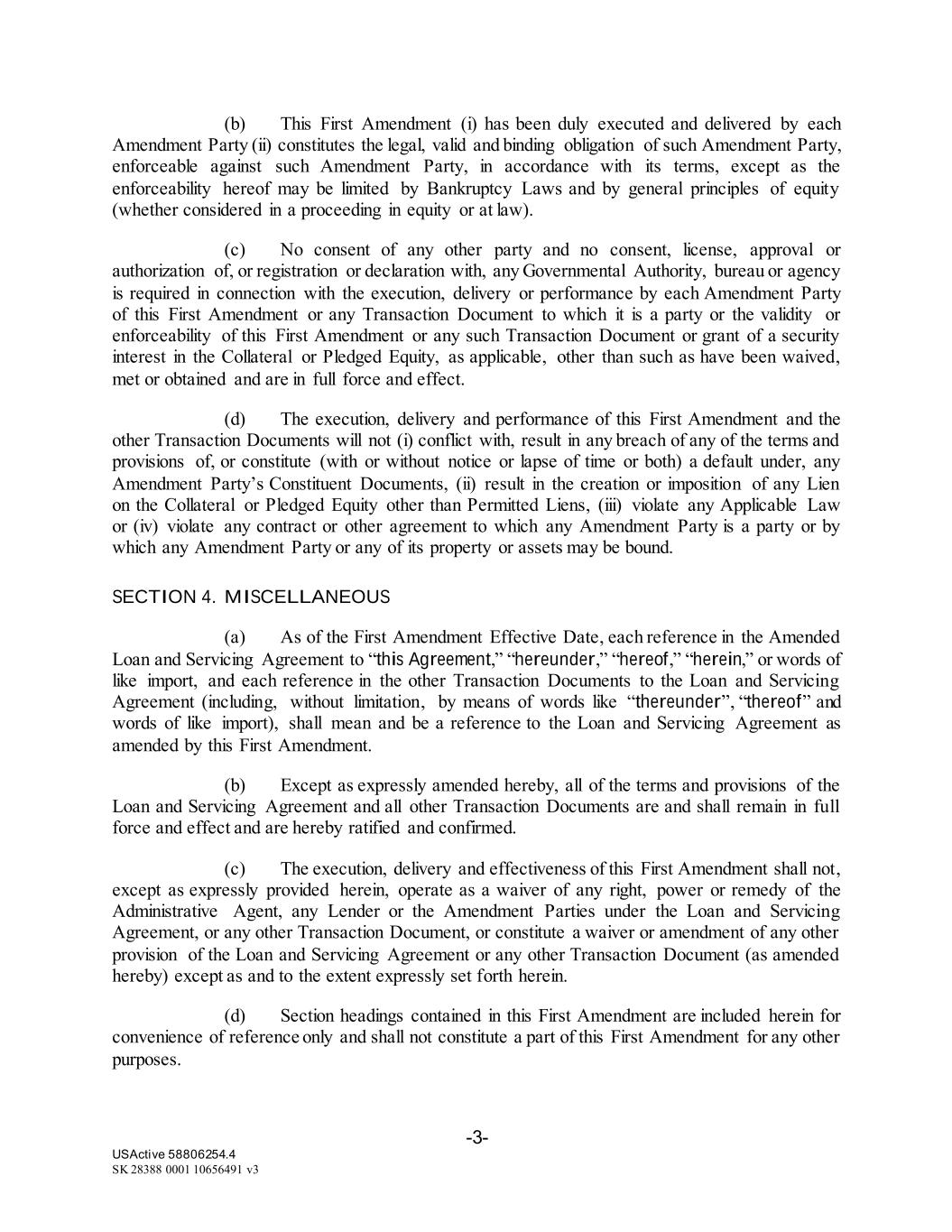 -3- USActive 58806254.4 SK 28388 0001 10656491 v3 (b) This First Amendment (i) has been duly executed and delivered by each Amendment Party (ii) constitutes the legal, valid and binding obligation of such Amendment Party, enforceable against such Amendment Party, in accordance with its terms, except as the enforceability hereof may be limited by Bankruptcy Laws and by general principles of equity (whether considered in a proceeding in equity or at law). (c) No consent of any other party and no consent, license, approval or authorization of, or registration or declaration with, any Governmental Authority, bureau or agency is required in connection with the execution, delivery or performance by each Amendment Party of this First Amendment or any Transaction Document to which it is a party or the validity or enforceability of this First Amendment or any such Transaction Document or grant of a security interest in the Collateral or Pledged Equity, as applicable, other than such as have been waived, met or obtained and are in full force and effect. (d) The execution, delivery and performance of this First Amendment and the other Transaction Documents will not (i) conflict with, result in any breach of any of the terms and provisions of, or constitute (with or without notice or lapse of time or both) a default under, any Amendment Party’s Constituent Documents, (ii) result in the creation or imposition of any Lien on the Collateral or Pledged Equity other than Permitted Liens, (iii) violate any Applicable Law or (iv) violate any contract or other agreement to which any Amendment Party is a party or by which any Amendment Party or any of its property or assets may be bound. SECTION 4. MISCELLANEOUS (a) As of the First Amendment Effective Date, each reference in the Amended Loan and Servicing Agreement to “this Agreement,” “hereunder,” “hereof,” “herein,” or words of like import, and each reference in the other Transaction Documents to the Loan and Servicing Agreement (including, without limitation, by means of words like “thereunder”, “thereof” and words of like import), shall mean and be a reference to the Loan and Servicing Agreement as amended by this First Amendment. (b) Except as expressly amended hereby, all of the terms and provisions of the Loan and Servicing Agreement and all other Transaction Documents are and shall remain in full force and effect and are hereby ratified and confirmed. (c) The execution, delivery and effectiveness of this First Amendment shall not, except as expressly provided herein, operate as a waiver of any right, power or remedy of the Administrative Agent, any Lender or the Amendment Parties under the Loan and Servicing Agreement, or any other Transaction Document, or constitute a waiver or amendment of any other provision of the Loan and Servicing Agreement or any other Transaction Document (as amended hereby) except as and to the extent expressly set forth herein. (d) Section headings contained in this First Amendment are included herein for convenience of reference only and shall not constitute a part of this First Amendment for any other purposes.