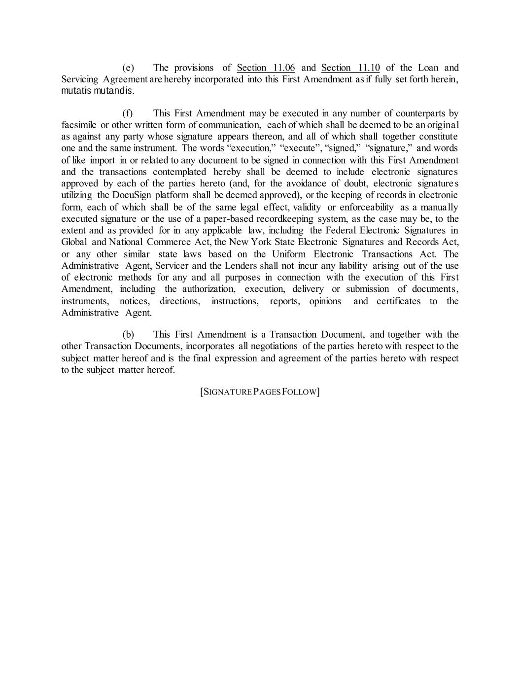 (e) The provisions of Section 11.06 and Section 11.10 of the Loan and Servicing Agreement are hereby incorporated into this First Amendment as if fully set forth herein, mutatis mutandis. (f) This First Amendment may be executed in any number of counterparts by facsimile or other written form of communication, each of which shall be deemed to be an original as against any party whose signature appears thereon, and all of which shall together constitute one and the same instrument. The words “execution,” “execute”, “signed,” “signature,” and words of like import in or related to any document to be signed in connection with this First Amendment and the transactions contemplated hereby shall be deemed to include electronic signatures approved by each of the parties hereto (and, for the avoidance of doubt, electronic signature s utilizing the DocuSign platform shall be deemed approved), or the keeping of records in electronic form, each of which shall be of the same legal effect, validity or enforceability as a manually executed signature or the use of a paper-based recordkeeping system, as the case may be, to the extent and as provided for in any applicable law, including the Federal Electronic Signatures in Global and National Commerce Act, the New York State Electronic Signatures and Records Act, or any other similar state laws based on the Uniform Electronic Transactions Act. The Administrative Agent, Servicer and the Lenders shall not incur any liability arising out of the use of electronic methods for any and all purposes in connection with the execution of this First Amendment, including the authorization, execution, delivery or submission of documents, instruments, notices, directions, instructions, reports, opinions and certificates to the Administrative Agent. (b) This First Amendment is a Transaction Document, and together with the other Transaction Documents, incorporates all negotiations of the parties hereto with respect to the subject matter hereof and is the final expression and agreement of the parties hereto with respect to the subject matter hereof. [SIGNATURE PAGES FOLLOW]