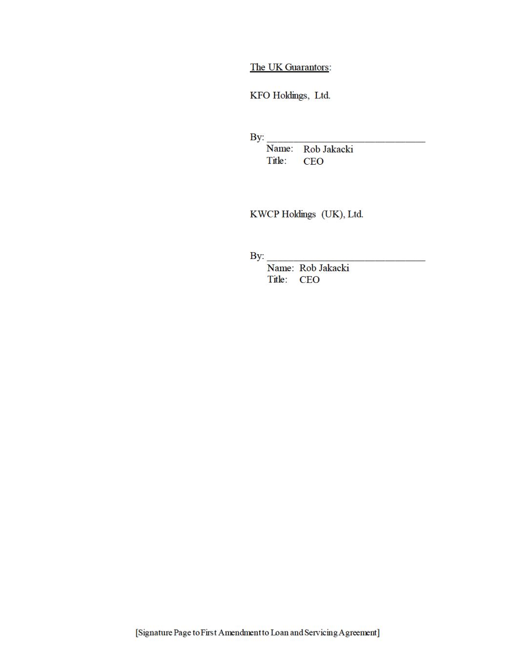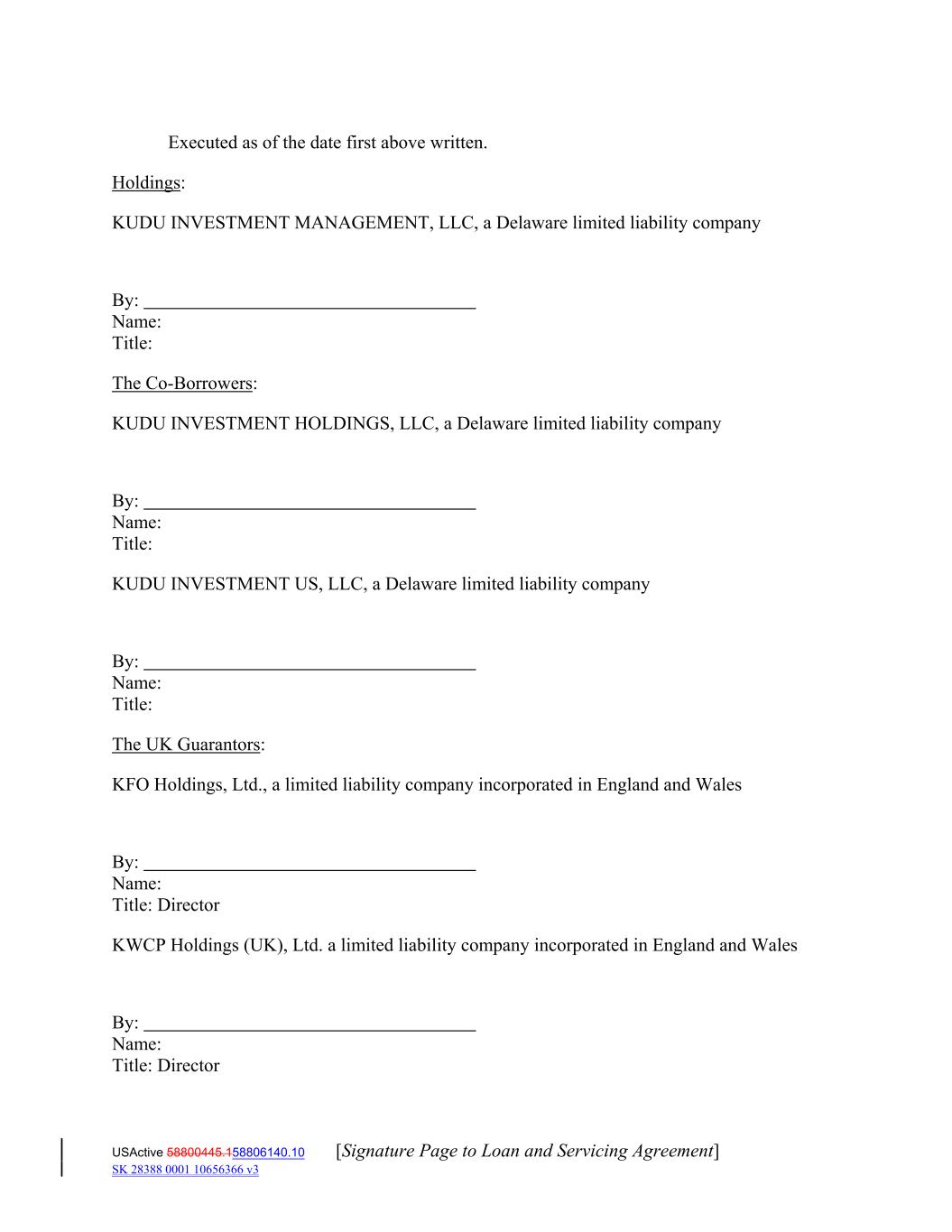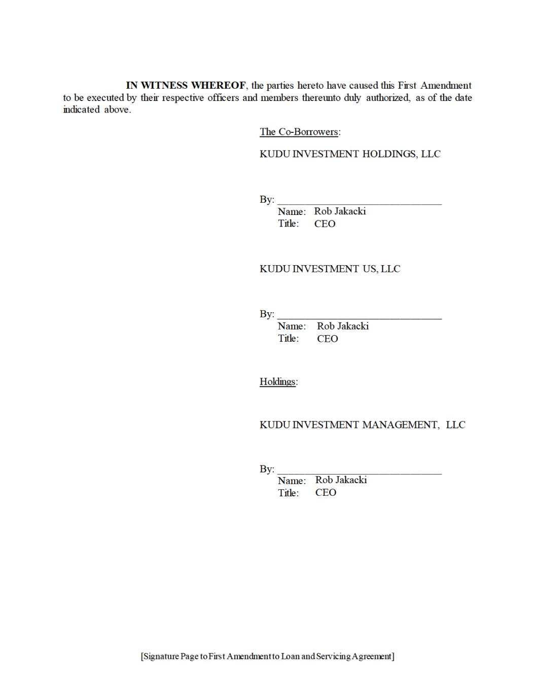 Executed as of the date first above written. Holdings: KUDU INVESTMENT MANAGEMENT, LLC, a Delaware limited liability company By: Name: Title: The Co‐Borrowers: KUDU INVESTMENT HOLDINGS, LLC, a Delaware limited liability company By: Name: Title: KUDU INVESTMENT US, LLC, a Delaware limited liability company By: Name: Title: The UK Guarantors: KFO Holdings, Ltd., a limited liability company incorporated in England and Wales By: Name: Title: Director KWCP Holdings (UK), Ltd. a limited liability company incorporated in England and Wales By: Name: Title: Director USActive 58800445.158806140.10 [Signature Page to Loan and Servicing Agreement] SK 28388 0001 10656366 v3