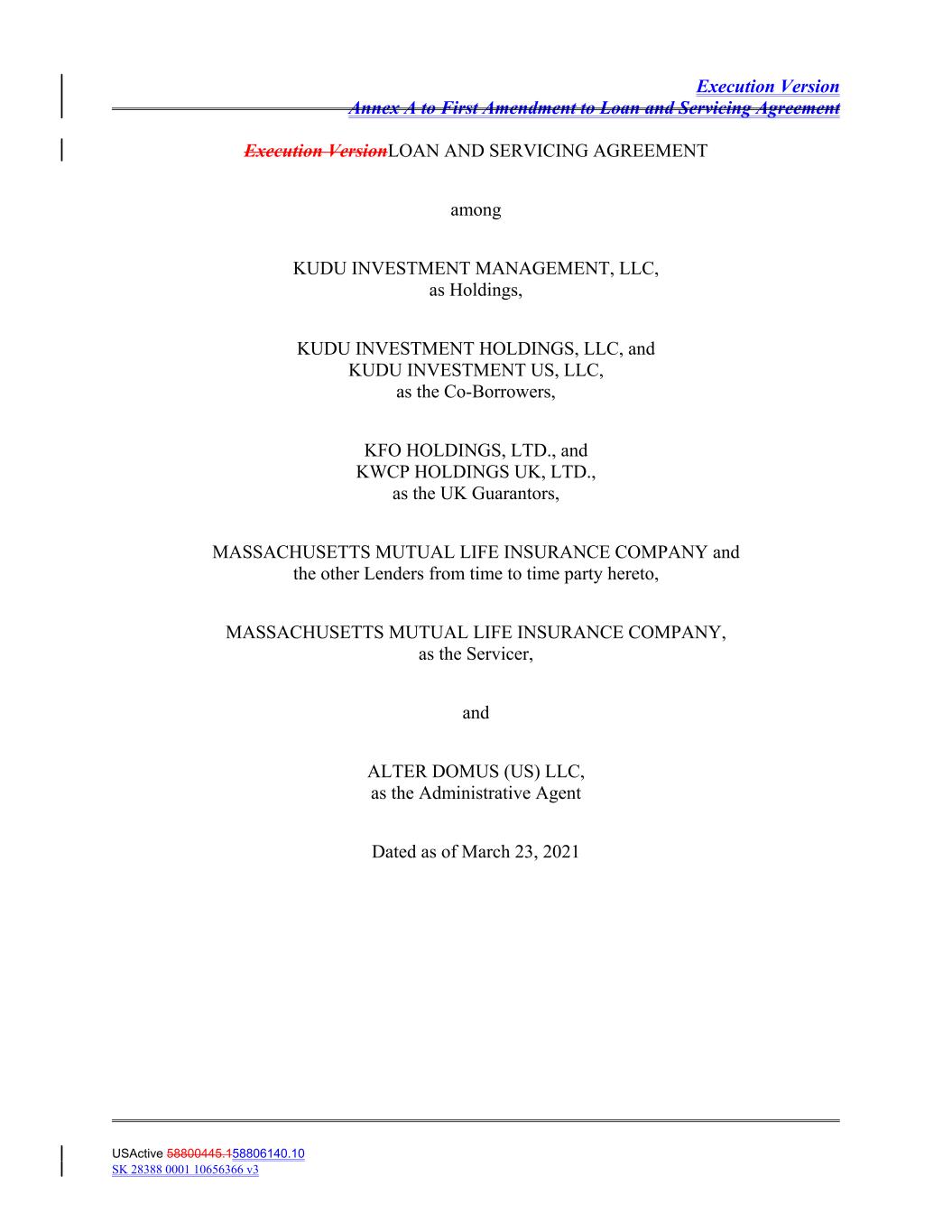 Execution Version Annex A to First Amendment to Loan and Servicing Agreement Execution VersionLOAN AND SERVICING AGREEMENT among KUDU INVESTMENT MANAGEMENT, LLC, as Holdings, KUDU INVESTMENT HOLDINGS, LLC, and KUDU INVESTMENT US, LLC, as the Co‐Borrowers, KFO HOLDINGS, LTD., and KWCP HOLDINGS UK, LTD., as the UK Guarantors, MASSACHUSETTS MUTUAL LIFE INSURANCE COMPANY and the other Lenders from time to time party hereto, MASSACHUSETTS MUTUAL LIFE INSURANCE COMPANY, as the Servicer, and ALTER DOMUS (US) LLC, as the Administrative Agent Dated as of March 23, 2021 USActive 58800445.158806140.10 SK 28388 0001 10656366 v3