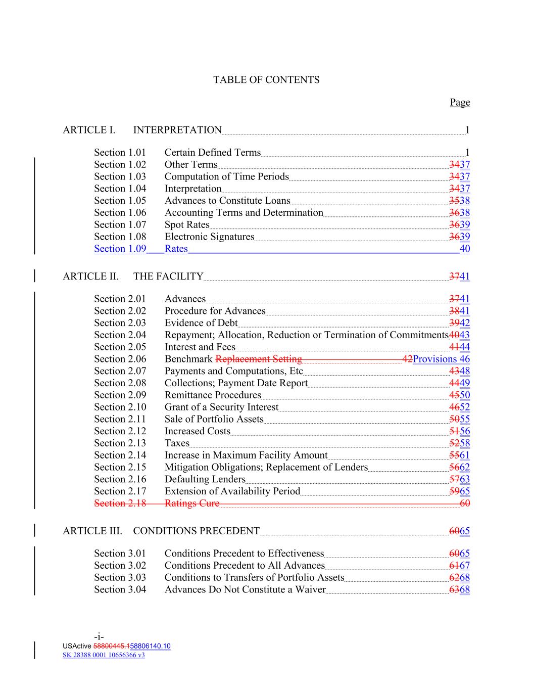 TABLE OF CONTENTS Page ARTICLE I. INTERPRETATION 1 Section 1.01 Certain Defined Terms 1 Section 1.02 Other Terms 3437 Section 1.03 Computation of Time Periods 3437 Section 1.04 Interpretation 3437 Section 1.05 Advances to Constitute Loans 3538 Section 1.06 Accounting Terms and Determination 3638 Section 1.07 Spot Rates 3639 Section 1.08 Electronic Signatures 3639 Section 1.09 Rates 40 ARTICLE II. THE FACILITY 3741 Section 2.01 Advances 3741 Section 2.02 Procedure for Advances 3841 Section 2.03 Evidence of Debt 3942 Section 2.04 Repayment; Allocation, Reduction or Termination of Commitments4043 Section 2.05 Interest and Fees 4144 Section 2.06 Benchmark Replacement Setting 42Provisions 46 Section 2.07 Payments and Computations, Etc 4348 Section 2.08 Collections; Payment Date Report 4449 Section 2.09 Remittance Procedures 4550 Section 2.10 Grant of a Security Interest 4652 Section 2.11 Sale of Portfolio Assets 5055 Section 2.12 Increased Costs 5156 Section 2.13 Taxes 5258 Section 2.14 Increase in Maximum Facility Amount 5561 Section 2.15 Mitigation Obligations; Replacement of Lenders 5662 Section 2.16 Defaulting Lenders 5763 Section 2.17 Extension of Availability Period 5965 Section 2.18 Ratings Cure 60 ARTICLE III. CONDITIONS PRECEDENT 6065 Section 3.01 Conditions Precedent to Effectiveness 6065 Section 3.02 Conditions Precedent to All Advances 6167 Section 3.03 Conditions to Transfers of Portfolio Assets 6268 Section 3.04 Advances Do Not Constitute a Waiver 6368 -i- USActive 58800445.158806140.10 SK 28388 0001 10656366 v3