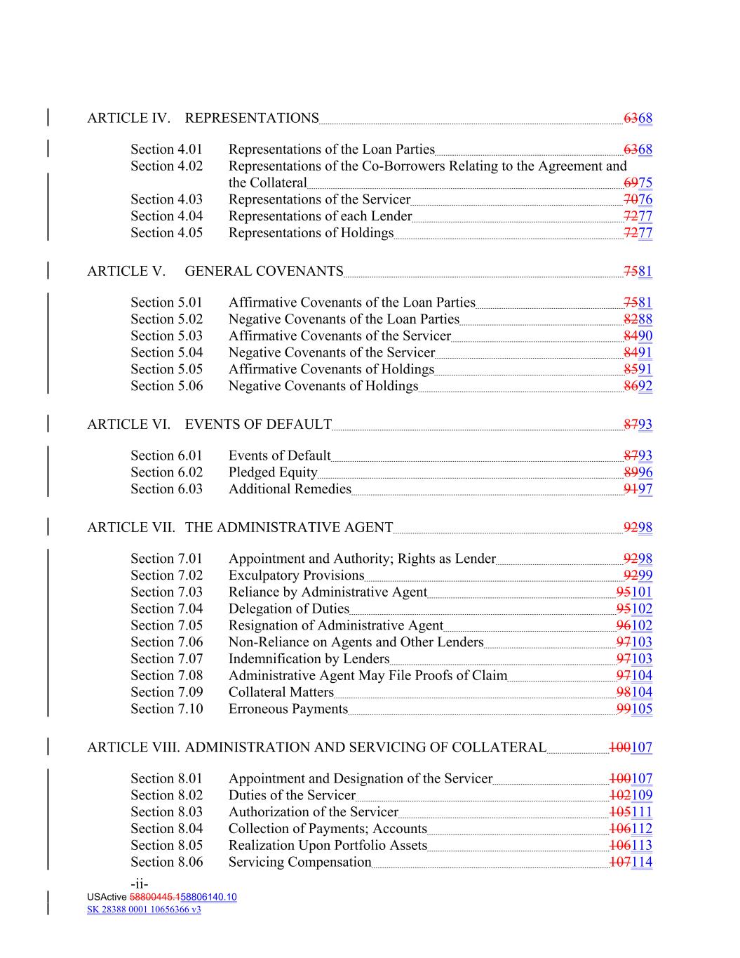 ARTICLE IV. REPRESENTATIONS 6368 Section 4.01 Representations of the Loan Parties 6368 Section 4.02 Representations of the Co‐Borrowers Relating to the Agreement and the Collateral 6975 Section 4.03 Representations of the Servicer 7076 Section 4.04 Representations of each Lender 7277 Section 4.05 Representations of Holdings 7277 ARTICLE V. GENERAL COVENANTS 7581 Section 5.01 Affirmative Covenants of the Loan Parties 7581 Section 5.02 Negative Covenants of the Loan Parties 8288 Section 5.03 Affirmative Covenants of the Servicer 8490 Section 5.04 Negative Covenants of the Servicer 8491 Section 5.05 Affirmative Covenants of Holdings 8591 Section 5.06 Negative Covenants of Holdings 8692 ARTICLE VI. EVENTS OF DEFAULT 8793 Section 6.01 Events of Default 8793 Section 6.02 Pledged Equity 8996 Section 6.03 Additional Remedies 9197 ARTICLE VII. THE ADMINISTRATIVE AGENT 9298 Section 7.01 Appointment and Authority; Rights as Lender 9298 Section 7.02 Exculpatory Provisions 9299 Section 7.03 Reliance by Administrative Agent 95101 Section 7.04 Delegation of Duties 95102 Section 7.05 Resignation of Administrative Agent 96102 Section 7.06 Non‐Reliance on Agents and Other Lenders 97103 Section 7.07 Indemnification by Lenders 97103 Section 7.08 Administrative Agent May File Proofs of Claim 97104 Section 7.09 Collateral Matters 98104 Section 7.10 Erroneous Payments 99105 ARTICLE VIII. ADMINISTRATION AND SERVICING OF COLLATERAL 100107 Section 8.01 Appointment and Designation of the Servicer 100107 Section 8.02 Duties of the Servicer 102109 Section 8.03 Authorization of the Servicer 105111 Section 8.04 Collection of Payments; Accounts 106112 Section 8.05 Realization Upon Portfolio Assets 106113 Section 8.06 Servicing Compensation 107114 -ii- USActive 58800445.158806140.10 SK 28388 0001 10656366 v3