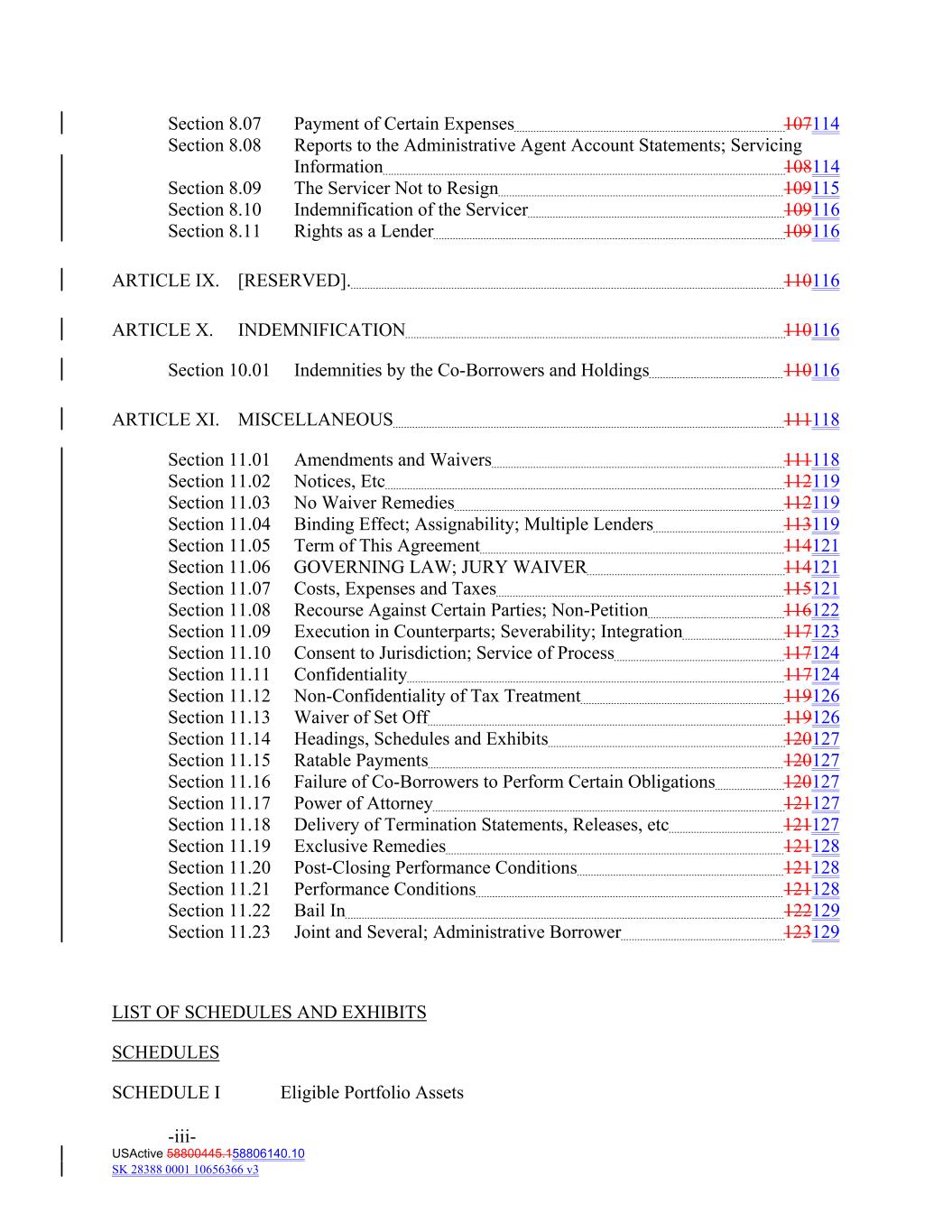Section 8.07 Payment of Certain Expenses 107114 Section 8.08 Reports to the Administrative Agent Account Statements; Servicing Information 108114 Section 8.09 The Servicer Not to Resign 109115 Section 8.10 Indemnification of the Servicer 109116 Section 8.11 Rights as a Lender 109116 ARTICLE IX. [RESERVED]. 110116 ARTICLE X. INDEMNIFICATION 110116 Section 10.01 Indemnities by the Co‐Borrowers and Holdings 110116 ARTICLE XI. MISCELLANEOUS 111118 Section 11.01 Amendments and Waivers 111118 Section 11.02 Notices, Etc 112119 Section 11.03 No Waiver Remedies 112119 Section 11.04 Binding Effect; Assignability; Multiple Lenders 113119 Section 11.05 Term of This Agreement 114121 Section 11.06 GOVERNING LAW; JURY WAIVER 114121 Section 11.07 Costs, Expenses and Taxes 115121 Section 11.08 Recourse Against Certain Parties; Non‐Petition 116122 Section 11.09 Execution in Counterparts; Severability; Integration 117123 Section 11.10 Consent to Jurisdiction; Service of Process 117124 Section 11.11 Confidentiality 117124 Section 11.12 Non‐Confidentiality of Tax Treatment 119126 Section 11.13 Waiver of Set Off 119126 Section 11.14 Headings, Schedules and Exhibits 120127 Section 11.15 Ratable Payments 120127 Section 11.16 Failure of Co‐Borrowers to Perform Certain Obligations 120127 Section 11.17 Power of Attorney 121127 Section 11.18 Delivery of Termination Statements, Releases, etc 121127 Section 11.19 Exclusive Remedies 121128 Section 11.20 Post‐Closing Performance Conditions 121128 Section 11.21 Performance Conditions 121128 Section 11.22 Bail In 122129 Section 11.23 Joint and Several; Administrative Borrower 123129 LIST OF SCHEDULES AND EXHIBITS SCHEDULES SCHEDULE I Eligible Portfolio Assets -iii- USActive 58800445.158806140.10 SK 28388 0001 10656366 v3
