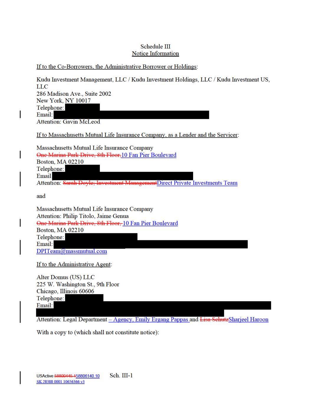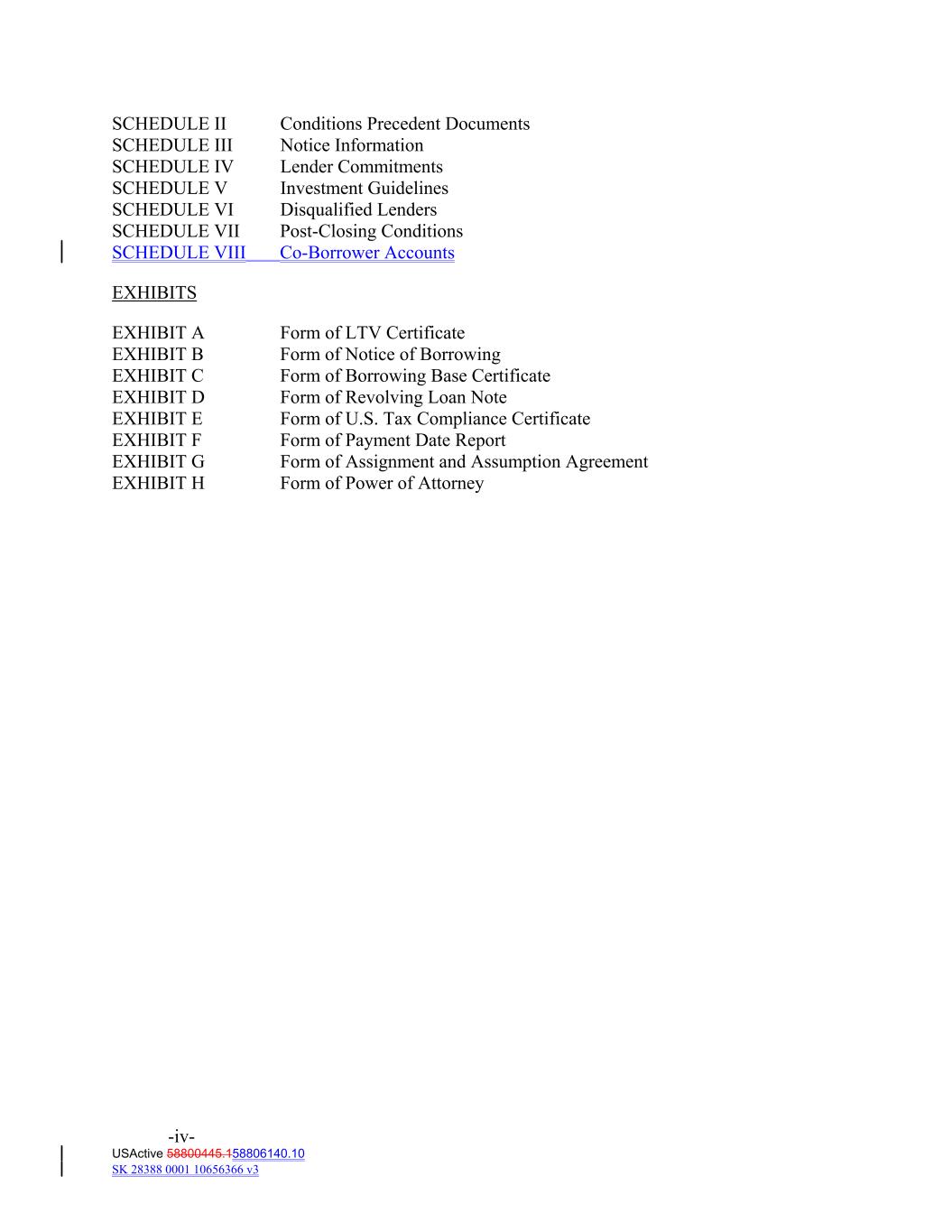 SCHEDULE II Conditions Precedent Documents SCHEDULE III Notice Information SCHEDULE IV Lender Commitments SCHEDULE V Investment Guidelines SCHEDULE VI Disqualified Lenders SCHEDULE VII Post‐Closing Conditions SCHEDULE VIII Co-Borrower Accounts EXHIBITS EXHIBIT A Form of LTV Certificate EXHIBIT B Form of Notice of Borrowing EXHIBIT C Form of Borrowing Base Certificate EXHIBIT D Form of Revolving Loan Note EXHIBIT E Form of U.S. Tax Compliance Certificate EXHIBIT F Form of Payment Date Report EXHIBIT G Form of Assignment and Assumption Agreement EXHIBIT H Form of Power of Attorney -iv- USActive 58800445.158806140.10 SK 28388 0001 10656366 v3