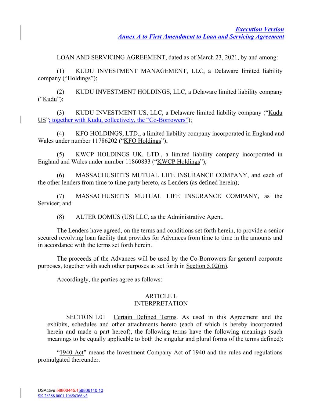 Execution Version Annex A to First Amendment to Loan and Servicing Agreement LOAN AND SERVICING AGREEMENT, dated as of March 23, 2021, by and among: (1) KUDU INVESTMENT MANAGEMENT, LLC, a Delaware limited liability company (“Holdings”); (2) KUDU INVESTMENT HOLDINGS, LLC, a Delaware limited liability company (“Kudu”); (3) KUDU INVESTMENT US, LLC, a Delaware limited liability company (“Kudu US”; together with Kudu, collectively, the “Co-Borrowers”); (4) KFO HOLDINGS, LTD., a limited liability company incorporated in England and Wales under number 11786202 (“KFO Holdings”); (5) KWCP HOLDINGS UK, LTD., a limited liability company incorporated in England and Wales under number 11860833 (“KWCP Holdings”); (6) MASSACHUSETTS MUTUAL LIFE INSURANCE COMPANY, and each of the other lenders from time to time party hereto, as Lenders (as defined herein); (7) MASSACHUSETTS MUTUAL LIFE INSURANCE COMPANY, as the Servicer; and (8) ALTER DOMUS (US) LLC, as the Administrative Agent. The Lenders have agreed, on the terms and conditions set forth herein, to provide a senior secured revolving loan facility that provides for Advances from time to time in the amounts and in accordance with the terms set forth herein. The proceeds of the Advances will be used by the Co‐Borrowers for general corporate purposes, together with such other purposes as set forth in Section 5.02(m). Accordingly, the parties agree as follows: ARTICLE I. INTERPRETATION SECTION 1.01 Certain Defined Terms. As used in this Agreement and the exhibits, schedules and other attachments hereto (each of which is hereby incorporated herein and made a part hereof), the following terms have the following meanings (such meanings to be equally applicable to both the singular and plural forms of the terms defined): “1940 Act” means the Investment Company Act of 1940 and the rules and regulations promulgated thereunder. USActive 58800445.158806140.10 SK 28388 0001 10656366 v3
