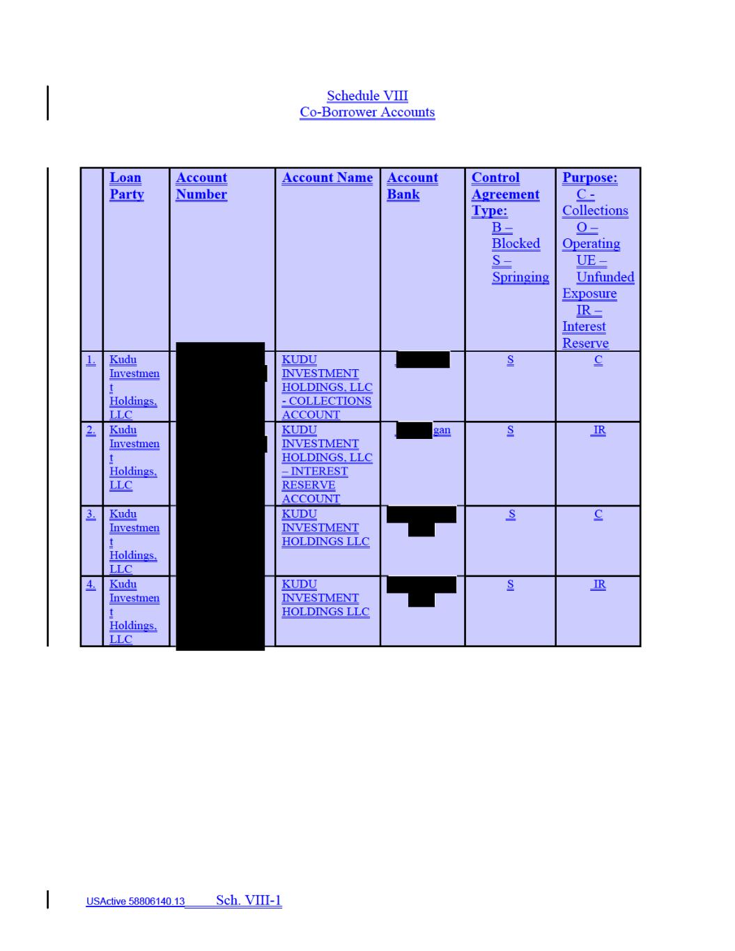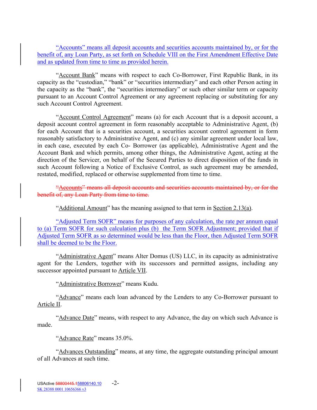 “Accounts” means all deposit accounts and securities accounts maintained by, or for the benefit of, any Loan Party, as set forth on Schedule VIII on the First Amendment Effective Date and as updated from time to time as provided herein. “Account Bank” means with respect to each Co‐Borrower, First Republic Bank, in its capacity as the “custodian,” “bank” or “securities intermediary” and each other Person acting in the capacity as the “bank”, the “securities intermediary” or such other similar term or capacity pursuant to an Account Control Agreement or any agreement replacing or substituting for any such Account Control Agreement. “Account Control Agreement” means (a) for each Account that is a deposit account, a deposit account control agreement in form reasonably acceptable to Administrative Agent, (b) for each Account that is a securities account, a securities account control agreement in form reasonably satisfactory to Administrative Agent, and (c) any similar agreement under local law, in each case, executed by each Co‐ Borrower (as applicable), Administrative Agent and the Account Bank and which permits, among other things, the Administrative Agent, acting at the direction of the Servicer, on behalf of the Secured Parties to direct disposition of the funds in such Account following a Notice of Exclusive Control, as such agreement may be amended, restated, modified, replaced or otherwise supplemented from time to time. “Accounts” means all deposit accounts and securities accounts maintained by, or for the benefit of, any Loan Party from time to time. “Additional Amount” has the meaning assigned to that term in Section 2.13(a). “Adjusted Term SOFR” means for purposes of any calculation, the rate per annum equal to (a) Term SOFR for such calculation plus (b) the Term SOFR Adjustment; provided that if Adjusted Term SOFR as so determined would be less than the Floor, then Adjusted Term SOFR shall be deemed to be the Floor. “Administrative Agent” means Alter Domus (US) LLC, in its capacity as administrative agent for the Lenders, together with its successors and permitted assigns, including any successor appointed pursuant to Article VII. “Administrative Borrower” means Kudu. “Advance” means each loan advanced by the Lenders to any Co‐Borrower pursuant to Article II. “Advance Date” means, with respect to any Advance, the day on which such Advance is made. “Advance Rate” means 35.0%. “Advances Outstanding” means, at any time, the aggregate outstanding principal amount of all Advances at such time. USActive 58800445.158806140.10 -2- SK 28388 0001 10656366 v3