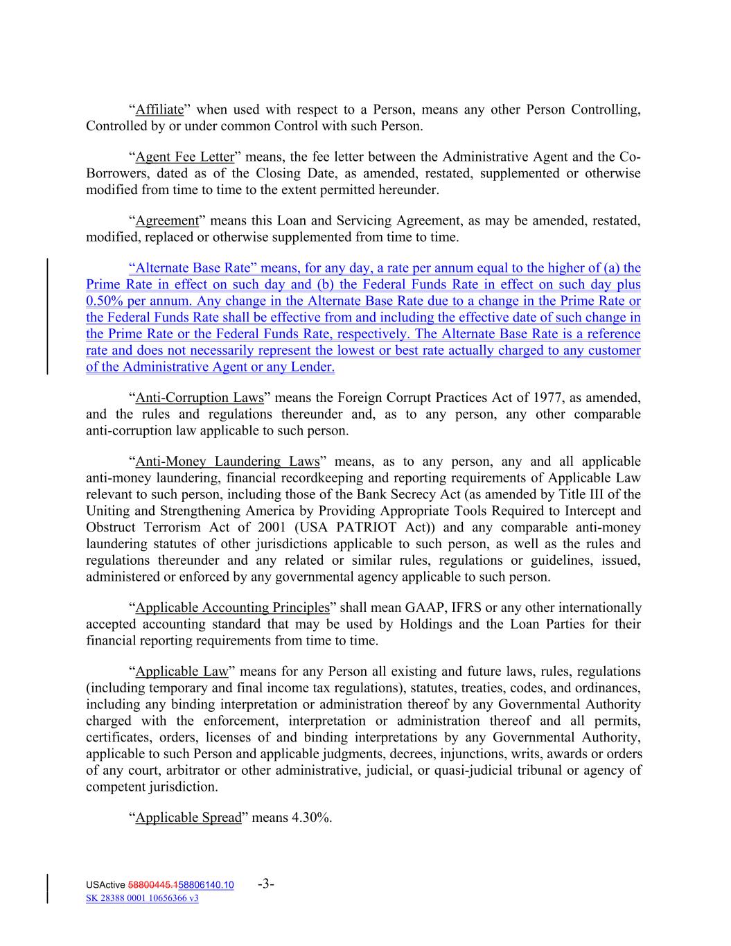 “Affiliate” when used with respect to a Person, means any other Person Controlling, Controlled by or under common Control with such Person. “Agent Fee Letter” means, the fee letter between the Administrative Agent and the Co‐ Borrowers, dated as of the Closing Date, as amended, restated, supplemented or otherwise modified from time to time to the extent permitted hereunder. “Agreement” means this Loan and Servicing Agreement, as may be amended, restated, modified, replaced or otherwise supplemented from time to time. “Alternate Base Rate” means, for any day, a rate per annum equal to the higher of (a) the Prime Rate in effect on such day and (b) the Federal Funds Rate in effect on such day plus 0.50% per annum. Any change in the Alternate Base Rate due to a change in the Prime Rate or the Federal Funds Rate shall be effective from and including the effective date of such change in the Prime Rate or the Federal Funds Rate, respectively. The Alternate Base Rate is a reference rate and does not necessarily represent the lowest or best rate actually charged to any customer of the Administrative Agent or any Lender. “Anti‐Corruption Laws” means the Foreign Corrupt Practices Act of 1977, as amended, and the rules and regulations thereunder and, as to any person, any other comparable anti‐corruption law applicable to such person. “Anti‐Money Laundering Laws” means, as to any person, any and all applicable anti‐money laundering, financial recordkeeping and reporting requirements of Applicable Law relevant to such person, including those of the Bank Secrecy Act (as amended by Title III of the Uniting and Strengthening America by Providing Appropriate Tools Required to Intercept and Obstruct Terrorism Act of 2001 (USA PATRIOT Act)) and any comparable anti‐money laundering statutes of other jurisdictions applicable to such person, as well as the rules and regulations thereunder and any related or similar rules, regulations or guidelines, issued, administered or enforced by any governmental agency applicable to such person. “Applicable Accounting Principles” shall mean GAAP, IFRS or any other internationally accepted accounting standard that may be used by Holdings and the Loan Parties for their financial reporting requirements from time to time. “Applicable Law” means for any Person all existing and future laws, rules, regulations (including temporary and final income tax regulations), statutes, treaties, codes, and ordinances, including any binding interpretation or administration thereof by any Governmental Authority charged with the enforcement, interpretation or administration thereof and all permits, certificates, orders, licenses of and binding interpretations by any Governmental Authority, applicable to such Person and applicable judgments, decrees, injunctions, writs, awards or orders of any court, arbitrator or other administrative, judicial, or quasi‐judicial tribunal or agency of competent jurisdiction. “Applicable Spread” means 4.30%. USActive 58800445.158806140.10 -3- SK 28388 0001 10656366 v3