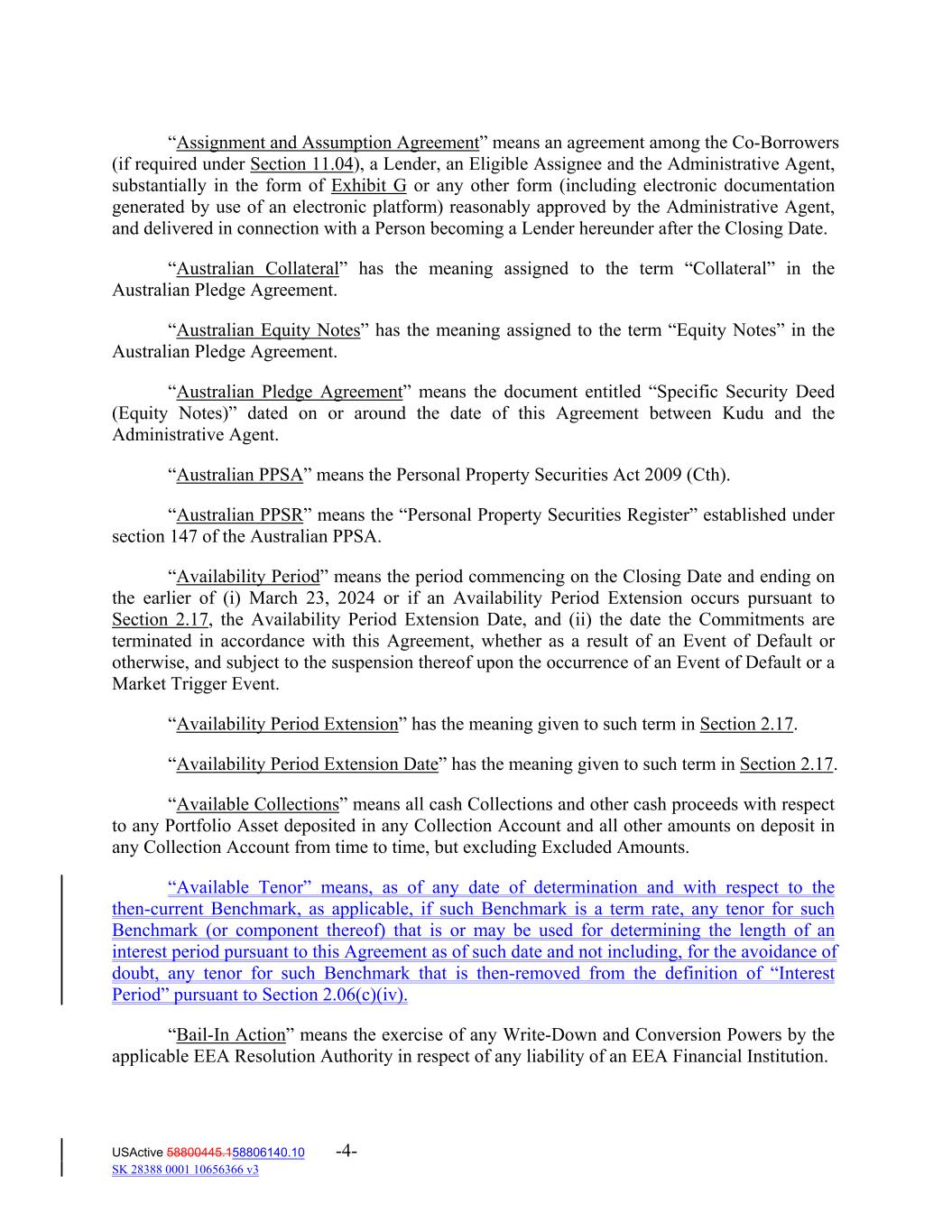 “Assignment and Assumption Agreement” means an agreement among the Co‐Borrowers (if required under Section 11.04), a Lender, an Eligible Assignee and the Administrative Agent, substantially in the form of Exhibit G or any other form (including electronic documentation generated by use of an electronic platform) reasonably approved by the Administrative Agent, and delivered in connection with a Person becoming a Lender hereunder after the Closing Date. “Australian Collateral” has the meaning assigned to the term “Collateral” in the Australian Pledge Agreement. “Australian Equity Notes” has the meaning assigned to the term “Equity Notes” in the Australian Pledge Agreement. “Australian Pledge Agreement” means the document entitled “Specific Security Deed (Equity Notes)” dated on or around the date of this Agreement between Kudu and the Administrative Agent. “Australian PPSA” means the Personal Property Securities Act 2009 (Cth). “Australian PPSR” means the “Personal Property Securities Register” established under section 147 of the Australian PPSA. “Availability Period” means the period commencing on the Closing Date and ending on the earlier of (i) March 23, 2024 or if an Availability Period Extension occurs pursuant to Section 2.17, the Availability Period Extension Date, and (ii) the date the Commitments are terminated in accordance with this Agreement, whether as a result of an Event of Default or otherwise, and subject to the suspension thereof upon the occurrence of an Event of Default or a Market Trigger Event. “Availability Period Extension” has the meaning given to such term in Section 2.17. “Availability Period Extension Date” has the meaning given to such term in Section 2.17. “Available Collections” means all cash Collections and other cash proceeds with respect to any Portfolio Asset deposited in any Collection Account and all other amounts on deposit in any Collection Account from time to time, but excluding Excluded Amounts. “Available Tenor” means, as of any date of determination and with respect to the then-current Benchmark, as applicable, if such Benchmark is a term rate, any tenor for such Benchmark (or component thereof) that is or may be used for determining the length of an interest period pursuant to this Agreement as of such date and not including, for the avoidance of doubt, any tenor for such Benchmark that is then-removed from the definition of “Interest Period” pursuant to Section 2.06(c)(iv). “Bail‐In Action” means the exercise of any Write‐Down and Conversion Powers by the applicable EEA Resolution Authority in respect of any liability of an EEA Financial Institution. USActive 58800445.158806140.10 -4- SK 28388 0001 10656366 v3