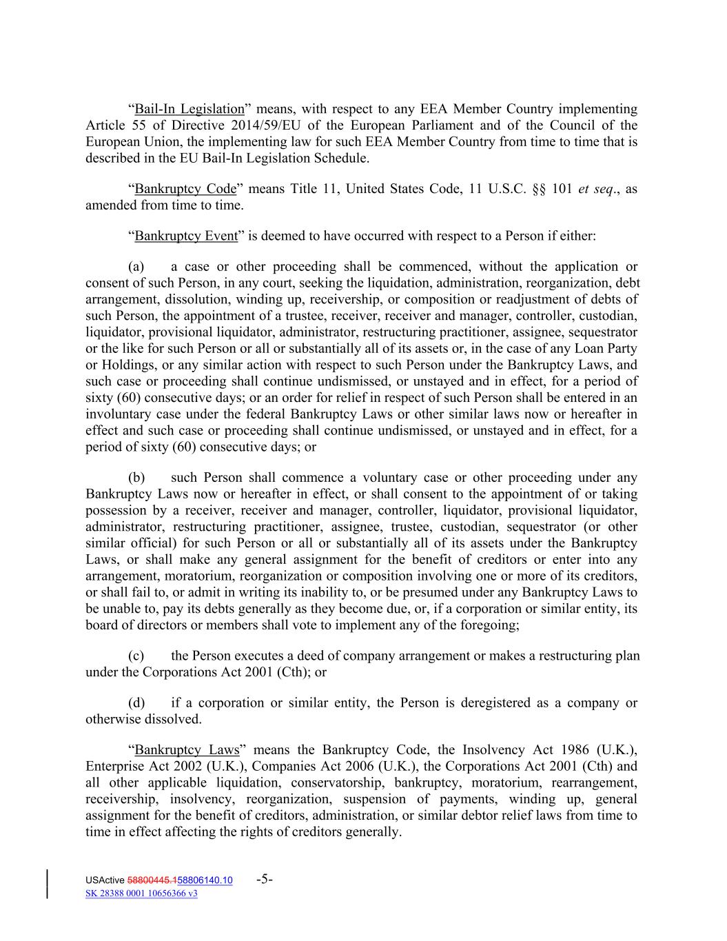 “Bail‐In Legislation” means, with respect to any EEA Member Country implementing Article 55 of Directive 2014/59/EU of the European Parliament and of the Council of the European Union, the implementing law for such EEA Member Country from time to time that is described in the EU Bail‐In Legislation Schedule. “Bankruptcy Code” means Title 11, United States Code, 11 U.S.C. §§ 101 et seq., as amended from time to time. “Bankruptcy Event” is deemed to have occurred with respect to a Person if either: (a) a case or other proceeding shall be commenced, without the application or consent of such Person, in any court, seeking the liquidation, administration, reorganization, debt arrangement, dissolution, winding up, receivership, or composition or readjustment of debts of such Person, the appointment of a trustee, receiver, receiver and manager, controller, custodian, liquidator, provisional liquidator, administrator, restructuring practitioner, assignee, sequestrator or the like for such Person or all or substantially all of its assets or, in the case of any Loan Party or Holdings, or any similar action with respect to such Person under the Bankruptcy Laws, and such case or proceeding shall continue undismissed, or unstayed and in effect, for a period of sixty (60) consecutive days; or an order for relief in respect of such Person shall be entered in an involuntary case under the federal Bankruptcy Laws or other similar laws now or hereafter in effect and such case or proceeding shall continue undismissed, or unstayed and in effect, for a period of sixty (60) consecutive days; or (b) such Person shall commence a voluntary case or other proceeding under any Bankruptcy Laws now or hereafter in effect, or shall consent to the appointment of or taking possession by a receiver, receiver and manager, controller, liquidator, provisional liquidator, administrator, restructuring practitioner, assignee, trustee, custodian, sequestrator (or other similar official) for such Person or all or substantially all of its assets under the Bankruptcy Laws, or shall make any general assignment for the benefit of creditors or enter into any arrangement, moratorium, reorganization or composition involving one or more of its creditors, or shall fail to, or admit in writing its inability to, or be presumed under any Bankruptcy Laws to be unable to, pay its debts generally as they become due, or, if a corporation or similar entity, its board of directors or members shall vote to implement any of the foregoing; (c) the Person executes a deed of company arrangement or makes a restructuring plan under the Corporations Act 2001 (Cth); or (d) if a corporation or similar entity, the Person is deregistered as a company or otherwise dissolved. “Bankruptcy Laws” means the Bankruptcy Code, the Insolvency Act 1986 (U.K.), Enterprise Act 2002 (U.K.), Companies Act 2006 (U.K.), the Corporations Act 2001 (Cth) and all other applicable liquidation, conservatorship, bankruptcy, moratorium, rearrangement, receivership, insolvency, reorganization, suspension of payments, winding up, general assignment for the benefit of creditors, administration, or similar debtor relief laws from time to time in effect affecting the rights of creditors generally. USActive 58800445.158806140.10 -5- SK 28388 0001 10656366 v3