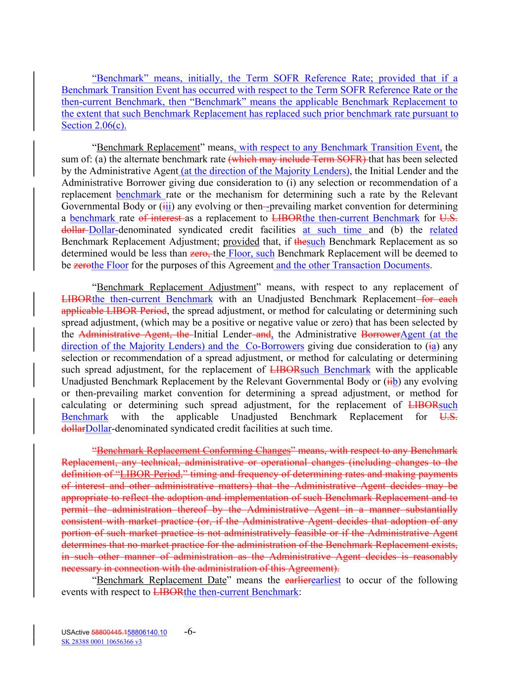 “Benchmark” means, initially, the Term SOFR Reference Rate; provided that if a Benchmark Transition Event has occurred with respect to the Term SOFR Reference Rate or the then-current Benchmark, then “Benchmark” means the applicable Benchmark Replacement to the extent that such Benchmark Replacement has replaced such prior benchmark rate pursuant to Section 2.06(c). “Benchmark Replacement” means, with respect to any Benchmark Transition Event, the sum of: (a) the alternate benchmark rate (which may include Term SOFR) that has been selected by the Administrative Agent (at the direction of the Majority Lenders), the Initial Lender and the Administrative Borrower giving due consideration to (i) any selection or recommendation of a replacement benchmark rate or the mechanism for determining such a rate by the Relevant Governmental Body or (iii) any evolving or then -prevailing market convention for determining a benchmark rate of interest as a replacement to LIBORthe then-current Benchmark for U.S. dollar Dollar-denominated syndicated credit facilities at such time and (b) the related Benchmark Replacement Adjustment; provided that, if thesuch Benchmark Replacement as so determined would be less than zero, the Floor, such Benchmark Replacement will be deemed to be zerothe Floor for the purposes of this Agreement and the other Transaction Documents. “Benchmark Replacement Adjustment” means, with respect to any replacement of LIBORthe then-current Benchmark with an Unadjusted Benchmark Replacement for each applicable LIBOR Period, the spread adjustment, or method for calculating or determining such spread adjustment, (which may be a positive or negative value or zero) that has been selected by the Administrative Agent, the Initial Lender and, the Administrative BorrowerAgent (at the direction of the Majority Lenders) and the Co-Borrowers giving due consideration to (ia) any selection or recommendation of a spread adjustment, or method for calculating or determining such spread adjustment, for the replacement of LIBORsuch Benchmark with the applicable Unadjusted Benchmark Replacement by the Relevant Governmental Body or (iib) any evolving or then‐prevailing market convention for determining a spread adjustment, or method for calculating or determining such spread adjustment, for the replacement of LIBORsuch Benchmark with the applicable Unadjusted Benchmark Replacement for U.S. dollarDollar‐denominated syndicated credit facilities at such time. “Benchmark Replacement Conforming Changes” means, with respect to any Benchmark Replacement, any technical, administrative or operational changes (including changes to the definition of “LIBOR Period,” timing and frequency of determining rates and making payments of interest and other administrative matters) that the Administrative Agent decides may be appropriate to reflect the adoption and implementation of such Benchmark Replacement and to permit the administration thereof by the Administrative Agent in a manner substantially consistent with market practice (or, if the Administrative Agent decides that adoption of any portion of such market practice is not administratively feasible or if the Administrative Agent determines that no market practice for the administration of the Benchmark Replacement exists, in such other manner of administration as the Administrative Agent decides is reasonably necessary in connection with the administration of this Agreement). “Benchmark Replacement Date” means the earlierearliest to occur of the following events with respect to LIBORthe then-current Benchmark: USActive 58800445.158806140.10 -6- SK 28388 0001 10656366 v3