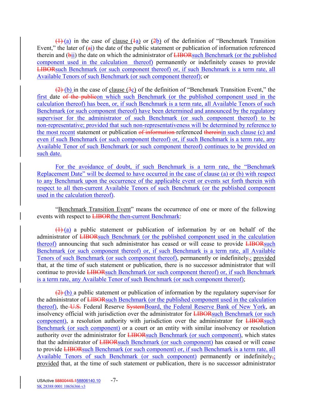 (1) (a) in the case of clause (1a) or (2b) of the definition of “Benchmark Transition Event,” the later of (ai) the date of the public statement or publication of information referenced therein and (bii) the date on which the administrator of LIBORsuch Benchmark (or the published component used in the calculation thereof) permanently or indefinitely ceases to provide LIBORsuch Benchmark (or such component thereof) or, if such Benchmark is a term rate, all Available Tenors of such Benchmark (or such component thereof); or (2) (b) in the case of clause (3c) of the definition of “Benchmark Transition Event,” the first date of the publicon which such Benchmark (or the published component used in the calculation thereof) has been, or, if such Benchmark is a term rate, all Available Tenors of such Benchmark (or such component thereof) have been determined and announced by the regulatory supervisor for the administrator of such Benchmark (or such component thereof) to be non-representative; provided that such non-representativeness will be determined by reference to the most recent statement or publication of information referenced thereinin such clause (c) and even if such Benchmark (or such component thereof) or, if such Benchmark is a term rate, any Available Tenor of such Benchmark (or such component thereof) continues to be provided on such date. For the avoidance of doubt, if such Benchmark is a term rate, the “Benchmark Replacement Date” will be deemed to have occurred in the case of clause (a) or (b) with respect to any Benchmark upon the occurrence of the applicable event or events set forth therein with respect to all then-current Available Tenors of such Benchmark (or the published component used in the calculation thereof). “Benchmark Transition Event” means the occurrence of one or more of the following events with respect to LIBORthe then-current Benchmark: (1) (a) a public statement or publication of information by or on behalf of the administrator of LIBORsuch Benchmark (or the published component used in the calculation thereof) announcing that such administrator has ceased or will cease to provide LIBORsuch Benchmark (or such component thereof) or, if such Benchmark is a term rate, all Available Tenors of such Benchmark (or such component thereof), permanently or indefinitely,; provided that, at the time of such statement or publication, there is no successor administrator that will continue to provide LIBORsuch Benchmark (or such component thereof) or, if such Benchmark is a term rate, any Available Tenor of such Benchmark (or such component thereof); (2) (b) a public statement or publication of information by the regulatory supervisor for the administrator of LIBORsuch Benchmark (or the published component used in the calculation thereof), the U.S. Federal Reserve SystemBoard, the Federal Reserve Bank of New York, an insolvency official with jurisdiction over the administrator for LIBORsuch Benchmark (or such component), a resolution authority with jurisdiction over the administrator for LIBORsuch Benchmark (or such component) or a court or an entity with similar insolvency or resolution authority over the administrator for LIBORsuch Benchmark (or such component), which states that the administrator of LIBORsuch Benchmark (or such component) has ceased or will cease to provide LIBORsuch Benchmark (or such component) or, if such Benchmark is a term rate, all Available Tenors of such Benchmark (or such component) permanently or indefinitely,; provided that, at the time of such statement or publication, there is no successor administrator USActive 58800445.158806140.10 -7- SK 28388 0001 10656366 v3