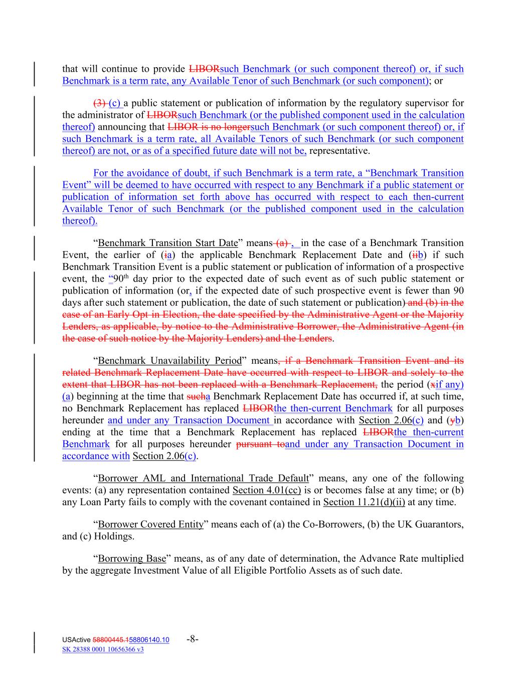 that will continue to provide LIBORsuch Benchmark (or such component thereof) or, if such Benchmark is a term rate, any Available Tenor of such Benchmark (or such component); or (3) (c) a public statement or publication of information by the regulatory supervisor for the administrator of LIBORsuch Benchmark (or the published component used in the calculation thereof) announcing that LIBOR is no longersuch Benchmark (or such component thereof) or, if such Benchmark is a term rate, all Available Tenors of such Benchmark (or such component thereof) are not, or as of a specified future date will not be, representative. For the avoidance of doubt, if such Benchmark is a term rate, a “Benchmark Transition Event” will be deemed to have occurred with respect to any Benchmark if a public statement or publication of information set forth above has occurred with respect to each then-current Available Tenor of such Benchmark (or the published component used in the calculation thereof). “Benchmark Transition Start Date” means (a) , in the case of a Benchmark Transition Event, the earlier of (ia) the applicable Benchmark Replacement Date and (iib) if such Benchmark Transition Event is a public statement or publication of information of a prospective event, the “90th day prior to the expected date of such event as of such public statement or publication of information (or, if the expected date of such prospective event is fewer than 90 days after such statement or publication, the date of such statement or publication) and (b) in the case of an Early Opt in Election, the date specified by the Administrative Agent or the Majority Lenders, as applicable, by notice to the Administrative Borrower, the Administrative Agent (in the case of such notice by the Majority Lenders) and the Lenders. “Benchmark Unavailability Period” means, if a Benchmark Transition Event and its related Benchmark Replacement Date have occurred with respect to LIBOR and solely to the extent that LIBOR has not been replaced with a Benchmark Replacement, the period (xif any) (a) beginning at the time that sucha Benchmark Replacement Date has occurred if, at such time, no Benchmark Replacement has replaced LIBORthe then-current Benchmark for all purposes hereunder and under any Transaction Document in accordance with Section 2.06(c) and (yb) ending at the time that a Benchmark Replacement has replaced LIBORthe then-current Benchmark for all purposes hereunder pursuant toand under any Transaction Document in accordance with Section 2.06(c). “Borrower AML and International Trade Default” means, any one of the following events: (a) any representation contained Section 4.01(cc) is or becomes false at any time; or (b) any Loan Party fails to comply with the covenant contained in Section 11.21(d)(ii) at any time. “Borrower Covered Entity” means each of (a) the Co‐Borrowers, (b) the UK Guarantors, and (c) Holdings. “Borrowing Base” means, as of any date of determination, the Advance Rate multiplied by the aggregate Investment Value of all Eligible Portfolio Assets as of such date. USActive 58800445.158806140.10 -8- SK 28388 0001 10656366 v3