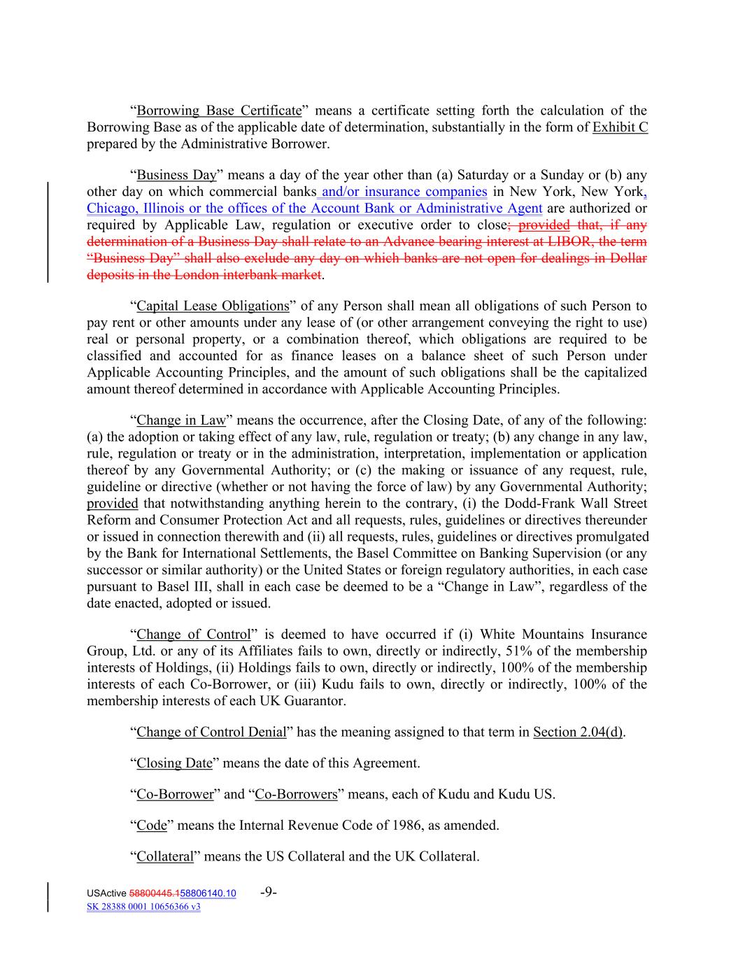 “Borrowing Base Certificate” means a certificate setting forth the calculation of the Borrowing Base as of the applicable date of determination, substantially in the form of Exhibit C prepared by the Administrative Borrower. “Business Day” means a day of the year other than (a) Saturday or a Sunday or (b) any other day on which commercial banks and/or insurance companies in New York, New York, Chicago, Illinois or the offices of the Account Bank or Administrative Agent are authorized or required by Applicable Law, regulation or executive order to close; provided that, if any determination of a Business Day shall relate to an Advance bearing interest at LIBOR, the term “Business Day” shall also exclude any day on which banks are not open for dealings in Dollar deposits in the London interbank market. “Capital Lease Obligations” of any Person shall mean all obligations of such Person to pay rent or other amounts under any lease of (or other arrangement conveying the right to use) real or personal property, or a combination thereof, which obligations are required to be classified and accounted for as finance leases on a balance sheet of such Person under Applicable Accounting Principles, and the amount of such obligations shall be the capitalized amount thereof determined in accordance with Applicable Accounting Principles. “Change in Law” means the occurrence, after the Closing Date, of any of the following: (a) the adoption or taking effect of any law, rule, regulation or treaty; (b) any change in any law, rule, regulation or treaty or in the administration, interpretation, implementation or application thereof by any Governmental Authority; or (c) the making or issuance of any request, rule, guideline or directive (whether or not having the force of law) by any Governmental Authority; provided that notwithstanding anything herein to the contrary, (i) the Dodd‐Frank Wall Street Reform and Consumer Protection Act and all requests, rules, guidelines or directives thereunder or issued in connection therewith and (ii) all requests, rules, guidelines or directives promulgated by the Bank for International Settlements, the Basel Committee on Banking Supervision (or any successor or similar authority) or the United States or foreign regulatory authorities, in each case pursuant to Basel III, shall in each case be deemed to be a “Change in Law”, regardless of the date enacted, adopted or issued. “Change of Control” is deemed to have occurred if (i) White Mountains Insurance Group, Ltd. or any of its Affiliates fails to own, directly or indirectly, 51% of the membership interests of Holdings, (ii) Holdings fails to own, directly or indirectly, 100% of the membership interests of each Co‐Borrower, or (iii) Kudu fails to own, directly or indirectly, 100% of the membership interests of each UK Guarantor. “Change of Control Denial” has the meaning assigned to that term in Section 2.04(d). “Closing Date” means the date of this Agreement. “Co‐Borrower” and “Co‐Borrowers” means, each of Kudu and Kudu US. “Code” means the Internal Revenue Code of 1986, as amended. “Collateral” means the US Collateral and the UK Collateral. USActive 58800445.158806140.10 -9- SK 28388 0001 10656366 v3