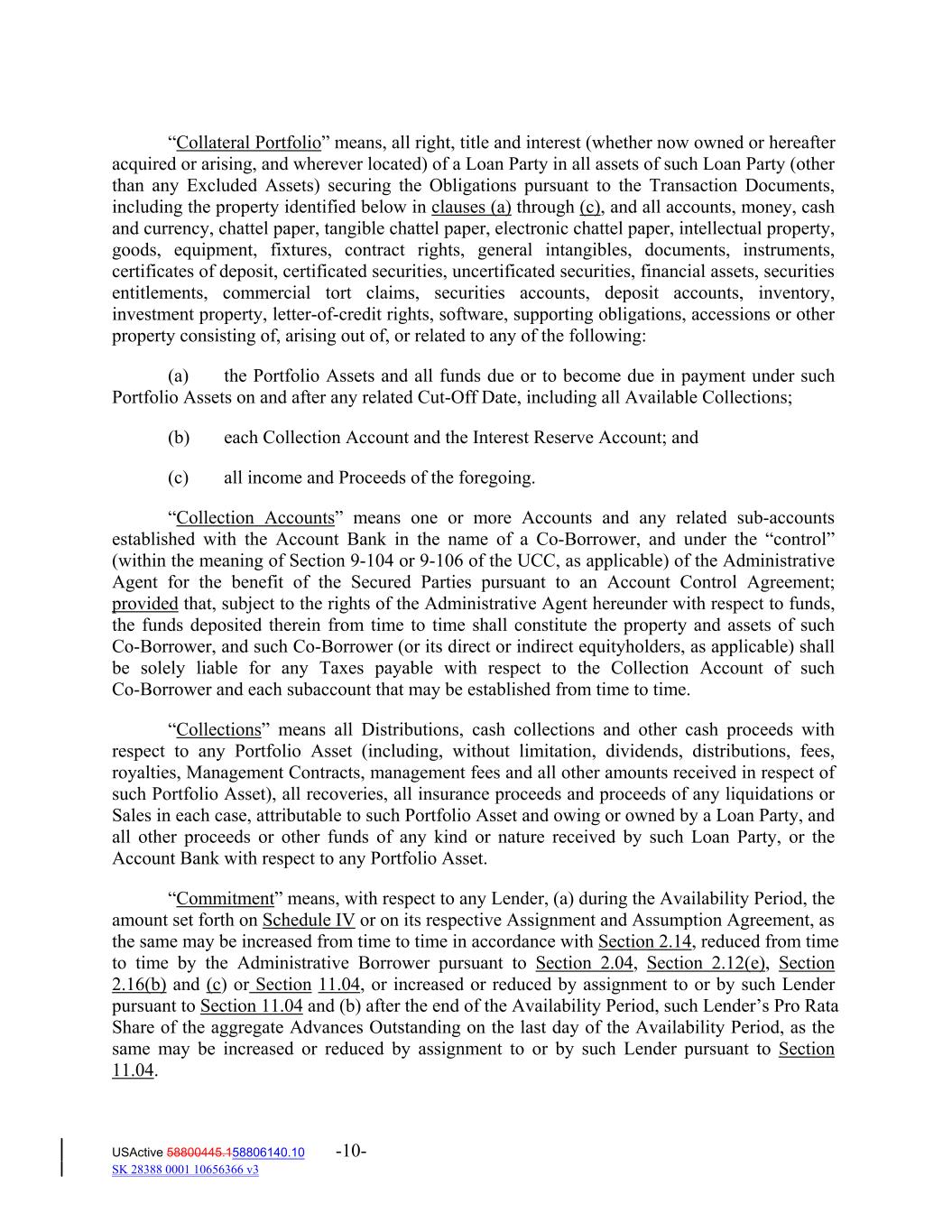 “Collateral Portfolio” means, all right, title and interest (whether now owned or hereafter acquired or arising, and wherever located) of a Loan Party in all assets of such Loan Party (other than any Excluded Assets) securing the Obligations pursuant to the Transaction Documents, including the property identified below in clauses (a) through (c), and all accounts, money, cash and currency, chattel paper, tangible chattel paper, electronic chattel paper, intellectual property, goods, equipment, fixtures, contract rights, general intangibles, documents, instruments, certificates of deposit, certificated securities, uncertificated securities, financial assets, securities entitlements, commercial tort claims, securities accounts, deposit accounts, inventory, investment property, letter‐of‐credit rights, software, supporting obligations, accessions or other property consisting of, arising out of, or related to any of the following: (a) the Portfolio Assets and all funds due or to become due in payment under such Portfolio Assets on and after any related Cut‐Off Date, including all Available Collections; (b) each Collection Account and the Interest Reserve Account; and (c) all income and Proceeds of the foregoing. “Collection Accounts” means one or more Accounts and any related sub‐accounts established with the Account Bank in the name of a Co‐Borrower, and under the “control” (within the meaning of Section 9‐104 or 9‐106 of the UCC, as applicable) of the Administrative Agent for the benefit of the Secured Parties pursuant to an Account Control Agreement; provided that, subject to the rights of the Administrative Agent hereunder with respect to funds, the funds deposited therein from time to time shall constitute the property and assets of such Co‐Borrower, and such Co‐Borrower (or its direct or indirect equityholders, as applicable) shall be solely liable for any Taxes payable with respect to the Collection Account of such Co‐Borrower and each subaccount that may be established from time to time. “Collections” means all Distributions, cash collections and other cash proceeds with respect to any Portfolio Asset (including, without limitation, dividends, distributions, fees, royalties, Management Contracts, management fees and all other amounts received in respect of such Portfolio Asset), all recoveries, all insurance proceeds and proceeds of any liquidations or Sales in each case, attributable to such Portfolio Asset and owing or owned by a Loan Party, and all other proceeds or other funds of any kind or nature received by such Loan Party, or the Account Bank with respect to any Portfolio Asset. “Commitment” means, with respect to any Lender, (a) during the Availability Period, the amount set forth on Schedule IV or on its respective Assignment and Assumption Agreement, as the same may be increased from time to time in accordance with Section 2.14, reduced from time to time by the Administrative Borrower pursuant to Section 2.04, Section 2.12(e), Section 2.16(b) and (c) or Section 11.04, or increased or reduced by assignment to or by such Lender pursuant to Section 11.04 and (b) after the end of the Availability Period, such Lender’s Pro Rata Share of the aggregate Advances Outstanding on the last day of the Availability Period, as the same may be increased or reduced by assignment to or by such Lender pursuant to Section 11.04. USActive 58800445.158806140.10 -10- SK 28388 0001 10656366 v3