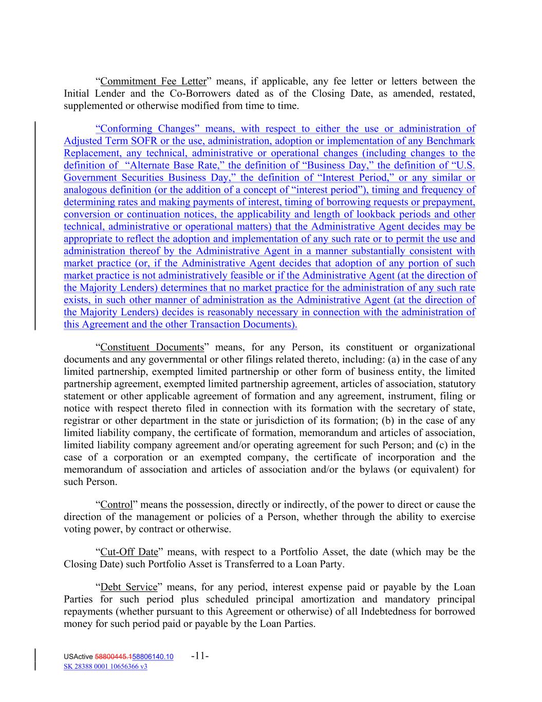 “Commitment Fee Letter” means, if applicable, any fee letter or letters between the Initial Lender and the Co‐Borrowers dated as of the Closing Date, as amended, restated, supplemented or otherwise modified from time to time. “Conforming Changes” means, with respect to either the use or administration of Adjusted Term SOFR or the use, administration, adoption or implementation of any Benchmark Replacement, any technical, administrative or operational changes (including changes to the definition of “Alternate Base Rate,” the definition of “Business Day,” the definition of “U.S. Government Securities Business Day,” the definition of “Interest Period,” or any similar or analogous definition (or the addition of a concept of “interest period”), timing and frequency of determining rates and making payments of interest, timing of borrowing requests or prepayment, conversion or continuation notices, the applicability and length of lookback periods and other technical, administrative or operational matters) that the Administrative Agent decides may be appropriate to reflect the adoption and implementation of any such rate or to permit the use and administration thereof by the Administrative Agent in a manner substantially consistent with market practice (or, if the Administrative Agent decides that adoption of any portion of such market practice is not administratively feasible or if the Administrative Agent (at the direction of the Majority Lenders) determines that no market practice for the administration of any such rate exists, in such other manner of administration as the Administrative Agent (at the direction of the Majority Lenders) decides is reasonably necessary in connection with the administration of this Agreement and the other Transaction Documents). “Constituent Documents” means, for any Person, its constituent or organizational documents and any governmental or other filings related thereto, including: (a) in the case of any limited partnership, exempted limited partnership or other form of business entity, the limited partnership agreement, exempted limited partnership agreement, articles of association, statutory statement or other applicable agreement of formation and any agreement, instrument, filing or notice with respect thereto filed in connection with its formation with the secretary of state, registrar or other department in the state or jurisdiction of its formation; (b) in the case of any limited liability company, the certificate of formation, memorandum and articles of association, limited liability company agreement and/or operating agreement for such Person; and (c) in the case of a corporation or an exempted company, the certificate of incorporation and the memorandum of association and articles of association and/or the bylaws (or equivalent) for such Person. “Control” means the possession, directly or indirectly, of the power to direct or cause the direction of the management or policies of a Person, whether through the ability to exercise voting power, by contract or otherwise. “Cut‐Off Date” means, with respect to a Portfolio Asset, the date (which may be the Closing Date) such Portfolio Asset is Transferred to a Loan Party. “Debt Service” means, for any period, interest expense paid or payable by the Loan Parties for such period plus scheduled principal amortization and mandatory principal repayments (whether pursuant to this Agreement or otherwise) of all Indebtedness for borrowed money for such period paid or payable by the Loan Parties. USActive 58800445.158806140.10 -11- SK 28388 0001 10656366 v3