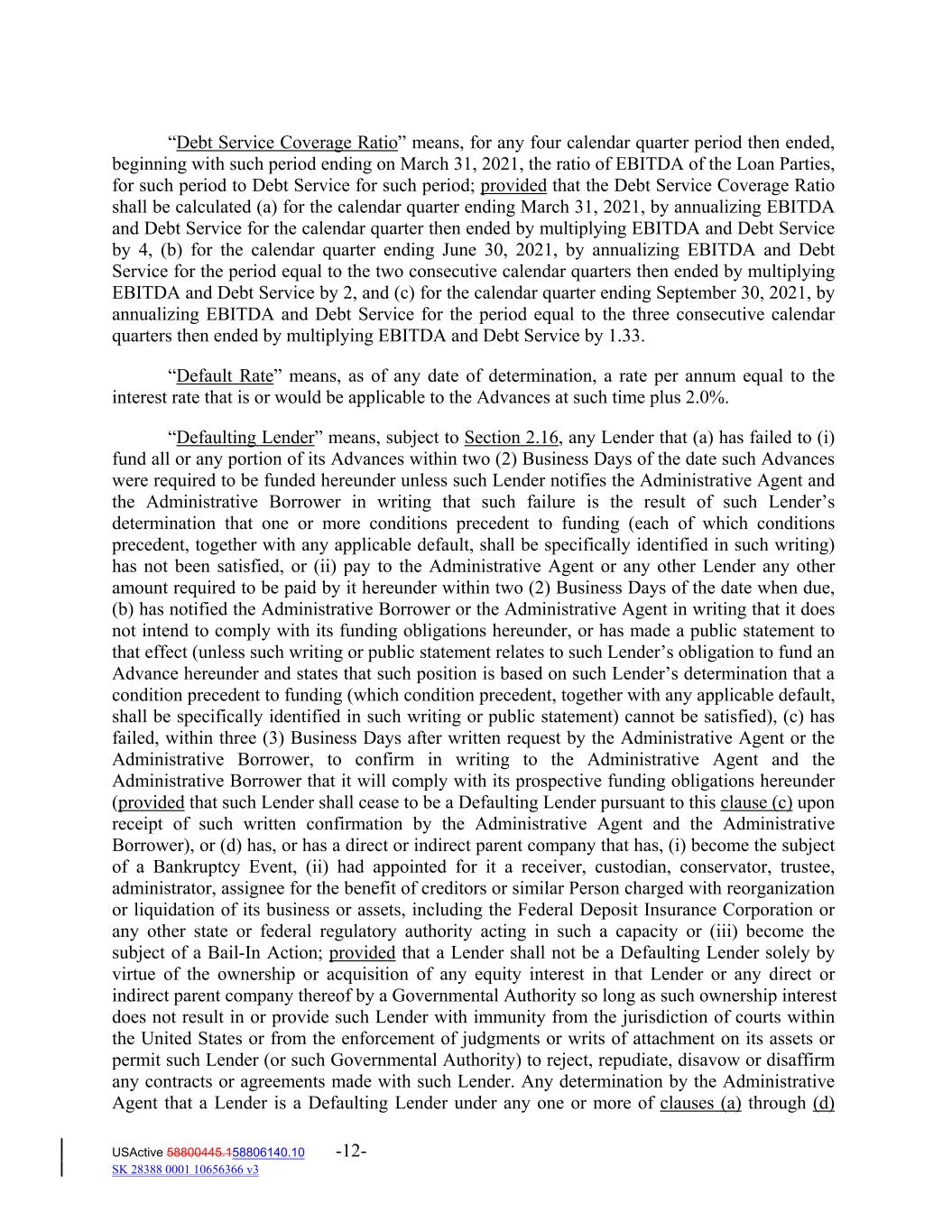 “Debt Service Coverage Ratio” means, for any four calendar quarter period then ended, beginning with such period ending on March 31, 2021, the ratio of EBITDA of the Loan Parties, for such period to Debt Service for such period; provided that the Debt Service Coverage Ratio shall be calculated (a) for the calendar quarter ending March 31, 2021, by annualizing EBITDA and Debt Service for the calendar quarter then ended by multiplying EBITDA and Debt Service by 4, (b) for the calendar quarter ending June 30, 2021, by annualizing EBITDA and Debt Service for the period equal to the two consecutive calendar quarters then ended by multiplying EBITDA and Debt Service by 2, and (c) for the calendar quarter ending September 30, 2021, by annualizing EBITDA and Debt Service for the period equal to the three consecutive calendar quarters then ended by multiplying EBITDA and Debt Service by 1.33. “Default Rate” means, as of any date of determination, a rate per annum equal to the interest rate that is or would be applicable to the Advances at such time plus 2.0%. “Defaulting Lender” means, subject to Section 2.16, any Lender that (a) has failed to (i) fund all or any portion of its Advances within two (2) Business Days of the date such Advances were required to be funded hereunder unless such Lender notifies the Administrative Agent and the Administrative Borrower in writing that such failure is the result of such Lender’s determination that one or more conditions precedent to funding (each of which conditions precedent, together with any applicable default, shall be specifically identified in such writing) has not been satisfied, or (ii) pay to the Administrative Agent or any other Lender any other amount required to be paid by it hereunder within two (2) Business Days of the date when due, (b) has notified the Administrative Borrower or the Administrative Agent in writing that it does not intend to comply with its funding obligations hereunder, or has made a public statement to that effect (unless such writing or public statement relates to such Lender’s obligation to fund an Advance hereunder and states that such position is based on such Lender’s determination that a condition precedent to funding (which condition precedent, together with any applicable default, shall be specifically identified in such writing or public statement) cannot be satisfied), (c) has failed, within three (3) Business Days after written request by the Administrative Agent or the Administrative Borrower, to confirm in writing to the Administrative Agent and the Administrative Borrower that it will comply with its prospective funding obligations hereunder (provided that such Lender shall cease to be a Defaulting Lender pursuant to this clause (c) upon receipt of such written confirmation by the Administrative Agent and the Administrative Borrower), or (d) has, or has a direct or indirect parent company that has, (i) become the subject of a Bankruptcy Event, (ii) had appointed for it a receiver, custodian, conservator, trustee, administrator, assignee for the benefit of creditors or similar Person charged with reorganization or liquidation of its business or assets, including the Federal Deposit Insurance Corporation or any other state or federal regulatory authority acting in such a capacity or (iii) become the subject of a Bail‐In Action; provided that a Lender shall not be a Defaulting Lender solely by virtue of the ownership or acquisition of any equity interest in that Lender or any direct or indirect parent company thereof by a Governmental Authority so long as such ownership interest does not result in or provide such Lender with immunity from the jurisdiction of courts within the United States or from the enforcement of judgments or writs of attachment on its assets or permit such Lender (or such Governmental Authority) to reject, repudiate, disavow or disaffirm any contracts or agreements made with such Lender. Any determination by the Administrative Agent that a Lender is a Defaulting Lender under any one or more of clauses (a) through (d) USActive 58800445.158806140.10 -12- SK 28388 0001 10656366 v3