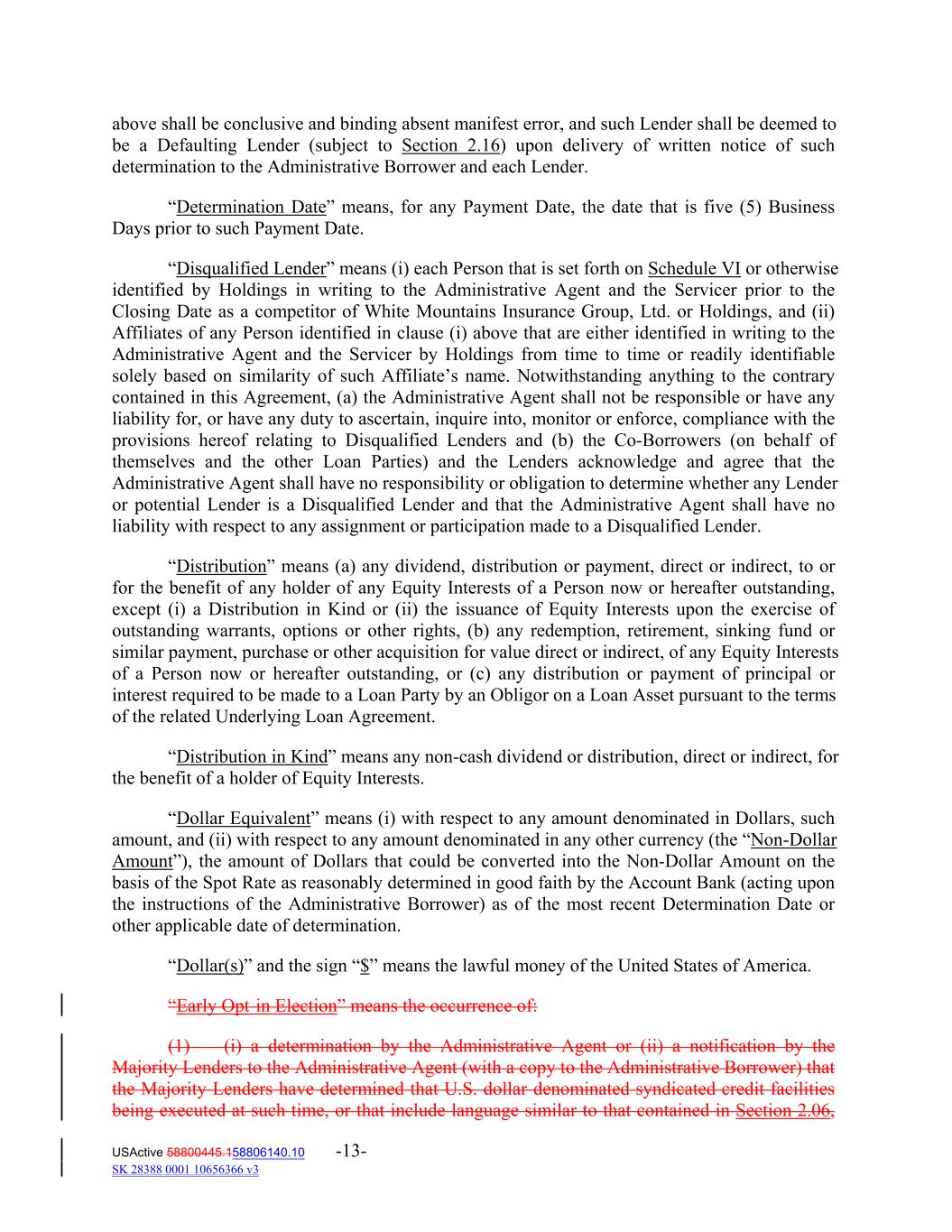 above shall be conclusive and binding absent manifest error, and such Lender shall be deemed to be a Defaulting Lender (subject to Section 2.16) upon delivery of written notice of such determination to the Administrative Borrower and each Lender. “Determination Date” means, for any Payment Date, the date that is five (5) Business Days prior to such Payment Date. “Disqualified Lender” means (i) each Person that is set forth on Schedule VI or otherwise identified by Holdings in writing to the Administrative Agent and the Servicer prior to the Closing Date as a competitor of White Mountains Insurance Group, Ltd. or Holdings, and (ii) Affiliates of any Person identified in clause (i) above that are either identified in writing to the Administrative Agent and the Servicer by Holdings from time to time or readily identifiable solely based on similarity of such Affiliate’s name. Notwithstanding anything to the contrary contained in this Agreement, (a) the Administrative Agent shall not be responsible or have any liability for, or have any duty to ascertain, inquire into, monitor or enforce, compliance with the provisions hereof relating to Disqualified Lenders and (b) the Co‐Borrowers (on behalf of themselves and the other Loan Parties) and the Lenders acknowledge and agree that the Administrative Agent shall have no responsibility or obligation to determine whether any Lender or potential Lender is a Disqualified Lender and that the Administrative Agent shall have no liability with respect to any assignment or participation made to a Disqualified Lender. “Distribution” means (a) any dividend, distribution or payment, direct or indirect, to or for the benefit of any holder of any Equity Interests of a Person now or hereafter outstanding, except (i) a Distribution in Kind or (ii) the issuance of Equity Interests upon the exercise of outstanding warrants, options or other rights, (b) any redemption, retirement, sinking fund or similar payment, purchase or other acquisition for value direct or indirect, of any Equity Interests of a Person now or hereafter outstanding, or (c) any distribution or payment of principal or interest required to be made to a Loan Party by an Obligor on a Loan Asset pursuant to the terms of the related Underlying Loan Agreement. “Distribution in Kind” means any non‐cash dividend or distribution, direct or indirect, for the benefit of a holder of Equity Interests. “Dollar Equivalent” means (i) with respect to any amount denominated in Dollars, such amount, and (ii) with respect to any amount denominated in any other currency (the “Non‐Dollar Amount”), the amount of Dollars that could be converted into the Non‐Dollar Amount on the basis of the Spot Rate as reasonably determined in good faith by the Account Bank (acting upon the instructions of the Administrative Borrower) as of the most recent Determination Date or other applicable date of determination. “Dollar(s)” and the sign “$” means the lawful money of the United States of America. “Early Opt in Election” means the occurrence of: (1) (i) a determination by the Administrative Agent or (ii) a notification by the Majority Lenders to the Administrative Agent (with a copy to the Administrative Borrower) that the Majority Lenders have determined that U.S. dollar denominated syndicated credit facilities being executed at such time, or that include language similar to that contained in Section 2.06, USActive 58800445.158806140.10 -13- SK 28388 0001 10656366 v3
