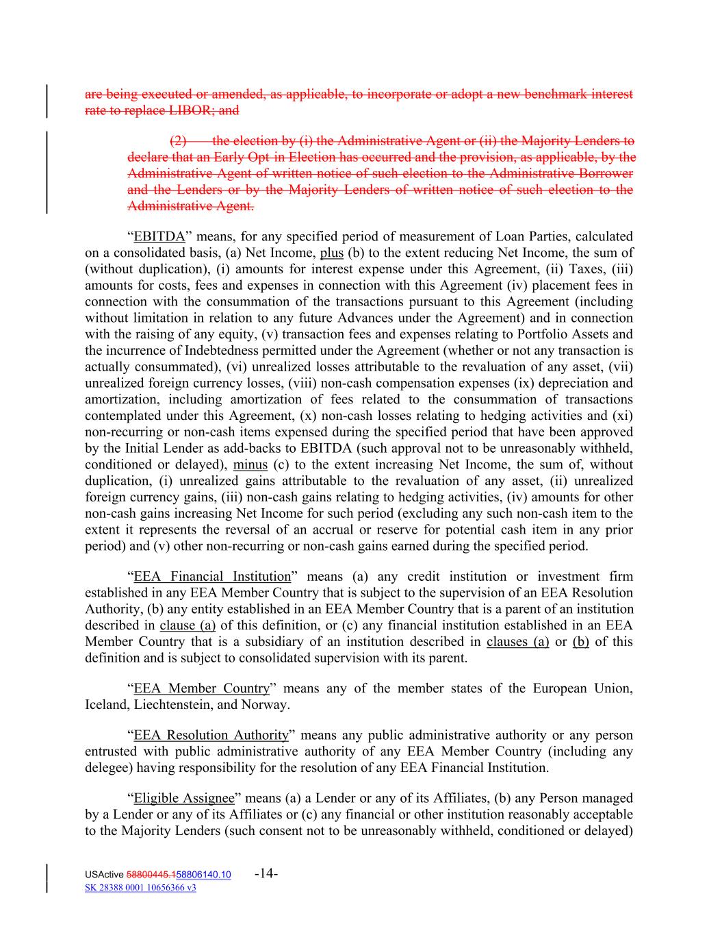 are being executed or amended, as applicable, to incorporate or adopt a new benchmark interest rate to replace LIBOR; and (2) the election by (i) the Administrative Agent or (ii) the Majority Lenders to declare that an Early Opt in Election has occurred and the provision, as applicable, by the Administrative Agent of written notice of such election to the Administrative Borrower and the Lenders or by the Majority Lenders of written notice of such election to the Administrative Agent. “EBITDA” means, for any specified period of measurement of Loan Parties, calculated on a consolidated basis, (a) Net Income, plus (b) to the extent reducing Net Income, the sum of (without duplication), (i) amounts for interest expense under this Agreement, (ii) Taxes, (iii) amounts for costs, fees and expenses in connection with this Agreement (iv) placement fees in connection with the consummation of the transactions pursuant to this Agreement (including without limitation in relation to any future Advances under the Agreement) and in connection with the raising of any equity, (v) transaction fees and expenses relating to Portfolio Assets and the incurrence of Indebtedness permitted under the Agreement (whether or not any transaction is actually consummated), (vi) unrealized losses attributable to the revaluation of any asset, (vii) unrealized foreign currency losses, (viii) non‐cash compensation expenses (ix) depreciation and amortization, including amortization of fees related to the consummation of transactions contemplated under this Agreement, (x) non‐cash losses relating to hedging activities and (xi) non‐recurring or non‐cash items expensed during the specified period that have been approved by the Initial Lender as add‐backs to EBITDA (such approval not to be unreasonably withheld, conditioned or delayed), minus (c) to the extent increasing Net Income, the sum of, without duplication, (i) unrealized gains attributable to the revaluation of any asset, (ii) unrealized foreign currency gains, (iii) non‐cash gains relating to hedging activities, (iv) amounts for other non‐cash gains increasing Net Income for such period (excluding any such non‐cash item to the extent it represents the reversal of an accrual or reserve for potential cash item in any prior period) and (v) other non‐recurring or non‐cash gains earned during the specified period. “EEA Financial Institution” means (a) any credit institution or investment firm established in any EEA Member Country that is subject to the supervision of an EEA Resolution Authority, (b) any entity established in an EEA Member Country that is a parent of an institution described in clause (a) of this definition, or (c) any financial institution established in an EEA Member Country that is a subsidiary of an institution described in clauses (a) or (b) of this definition and is subject to consolidated supervision with its parent. “EEA Member Country” means any of the member states of the European Union, Iceland, Liechtenstein, and Norway. “EEA Resolution Authority” means any public administrative authority or any person entrusted with public administrative authority of any EEA Member Country (including any delegee) having responsibility for the resolution of any EEA Financial Institution. “Eligible Assignee” means (a) a Lender or any of its Affiliates, (b) any Person managed by a Lender or any of its Affiliates or (c) any financial or other institution reasonably acceptable to the Majority Lenders (such consent not to be unreasonably withheld, conditioned or delayed) USActive 58800445.158806140.10 -14- SK 28388 0001 10656366 v3