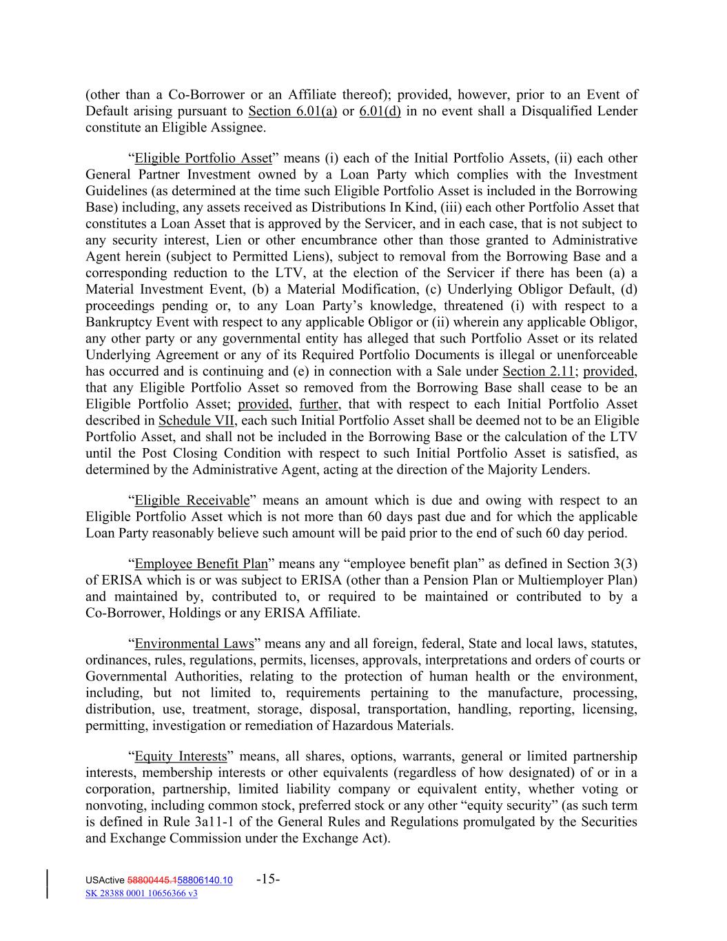 (other than a Co‐Borrower or an Affiliate thereof); provided, however, prior to an Event of Default arising pursuant to Section 6.01(a) or 6.01(d) in no event shall a Disqualified Lender constitute an Eligible Assignee. “Eligible Portfolio Asset” means (i) each of the Initial Portfolio Assets, (ii) each other General Partner Investment owned by a Loan Party which complies with the Investment Guidelines (as determined at the time such Eligible Portfolio Asset is included in the Borrowing Base) including, any assets received as Distributions In Kind, (iii) each other Portfolio Asset that constitutes a Loan Asset that is approved by the Servicer, and in each case, that is not subject to any security interest, Lien or other encumbrance other than those granted to Administrative Agent herein (subject to Permitted Liens), subject to removal from the Borrowing Base and a corresponding reduction to the LTV, at the election of the Servicer if there has been (a) a Material Investment Event, (b) a Material Modification, (c) Underlying Obligor Default, (d) proceedings pending or, to any Loan Party’s knowledge, threatened (i) with respect to a Bankruptcy Event with respect to any applicable Obligor or (ii) wherein any applicable Obligor, any other party or any governmental entity has alleged that such Portfolio Asset or its related Underlying Agreement or any of its Required Portfolio Documents is illegal or unenforceable has occurred and is continuing and (e) in connection with a Sale under Section 2.11; provided, that any Eligible Portfolio Asset so removed from the Borrowing Base shall cease to be an Eligible Portfolio Asset; provided, further, that with respect to each Initial Portfolio Asset described in Schedule VII, each such Initial Portfolio Asset shall be deemed not to be an Eligible Portfolio Asset, and shall not be included in the Borrowing Base or the calculation of the LTV until the Post Closing Condition with respect to such Initial Portfolio Asset is satisfied, as determined by the Administrative Agent, acting at the direction of the Majority Lenders. “Eligible Receivable” means an amount which is due and owing with respect to an Eligible Portfolio Asset which is not more than 60 days past due and for which the applicable Loan Party reasonably believe such amount will be paid prior to the end of such 60 day period. “Employee Benefit Plan” means any “employee benefit plan” as defined in Section 3(3) of ERISA which is or was subject to ERISA (other than a Pension Plan or Multiemployer Plan) and maintained by, contributed to, or required to be maintained or contributed to by a Co‐Borrower, Holdings or any ERISA Affiliate. “Environmental Laws” means any and all foreign, federal, State and local laws, statutes, ordinances, rules, regulations, permits, licenses, approvals, interpretations and orders of courts or Governmental Authorities, relating to the protection of human health or the environment, including, but not limited to, requirements pertaining to the manufacture, processing, distribution, use, treatment, storage, disposal, transportation, handling, reporting, licensing, permitting, investigation or remediation of Hazardous Materials. “Equity Interests” means, all shares, options, warrants, general or limited partnership interests, membership interests or other equivalents (regardless of how designated) of or in a corporation, partnership, limited liability company or equivalent entity, whether voting or nonvoting, including common stock, preferred stock or any other “equity security” (as such term is defined in Rule 3a11‐1 of the General Rules and Regulations promulgated by the Securities and Exchange Commission under the Exchange Act). USActive 58800445.158806140.10 -15- SK 28388 0001 10656366 v3
