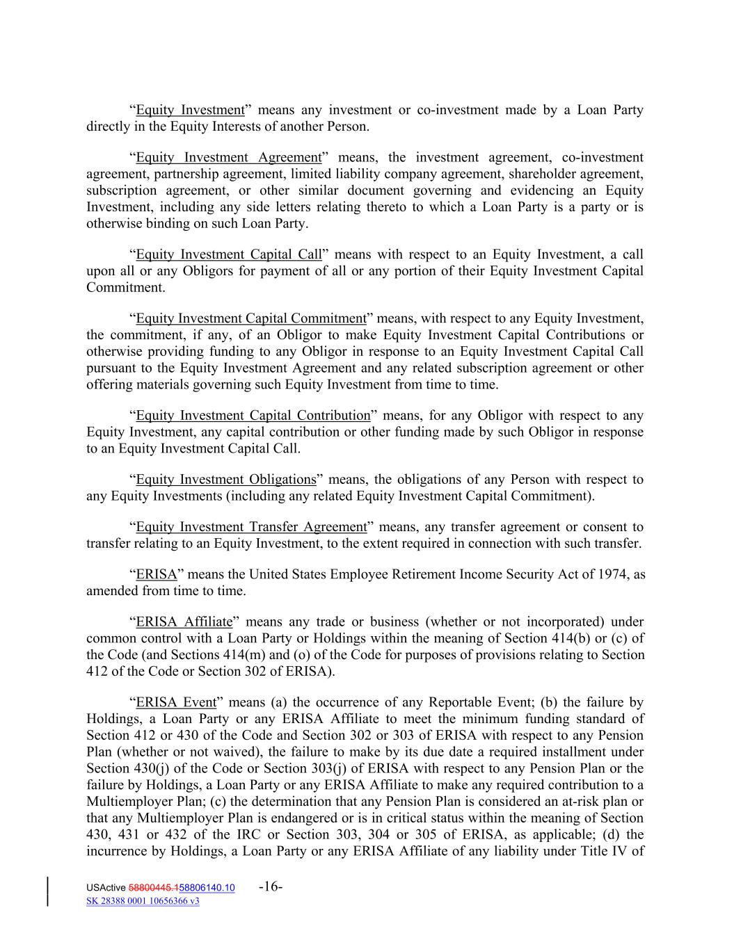 “Equity Investment” means any investment or co‐investment made by a Loan Party directly in the Equity Interests of another Person. “Equity Investment Agreement” means, the investment agreement, co‐investment agreement, partnership agreement, limited liability company agreement, shareholder agreement, subscription agreement, or other similar document governing and evidencing an Equity Investment, including any side letters relating thereto to which a Loan Party is a party or is otherwise binding on such Loan Party. “Equity Investment Capital Call” means with respect to an Equity Investment, a call upon all or any Obligors for payment of all or any portion of their Equity Investment Capital Commitment. “Equity Investment Capital Commitment” means, with respect to any Equity Investment, the commitment, if any, of an Obligor to make Equity Investment Capital Contributions or otherwise providing funding to any Obligor in response to an Equity Investment Capital Call pursuant to the Equity Investment Agreement and any related subscription agreement or other offering materials governing such Equity Investment from time to time. “Equity Investment Capital Contribution” means, for any Obligor with respect to any Equity Investment, any capital contribution or other funding made by such Obligor in response to an Equity Investment Capital Call. “Equity Investment Obligations” means, the obligations of any Person with respect to any Equity Investments (including any related Equity Investment Capital Commitment). “Equity Investment Transfer Agreement” means, any transfer agreement or consent to transfer relating to an Equity Investment, to the extent required in connection with such transfer. “ERISA” means the United States Employee Retirement Income Security Act of 1974, as amended from time to time. “ERISA Affiliate” means any trade or business (whether or not incorporated) under common control with a Loan Party or Holdings within the meaning of Section 414(b) or (c) of the Code (and Sections 414(m) and (o) of the Code for purposes of provisions relating to Section 412 of the Code or Section 302 of ERISA). “ERISA Event” means (a) the occurrence of any Reportable Event; (b) the failure by Holdings, a Loan Party or any ERISA Affiliate to meet the minimum funding standard of Section 412 or 430 of the Code and Section 302 or 303 of ERISA with respect to any Pension Plan (whether or not waived), the failure to make by its due date a required installment under Section 430(j) of the Code or Section 303(j) of ERISA with respect to any Pension Plan or the failure by Holdings, a Loan Party or any ERISA Affiliate to make any required contribution to a Multiemployer Plan; (c) the determination that any Pension Plan is considered an at‐risk plan or that any Multiemployer Plan is endangered or is in critical status within the meaning of Section 430, 431 or 432 of the IRC or Section 303, 304 or 305 of ERISA, as applicable; (d) the incurrence by Holdings, a Loan Party or any ERISA Affiliate of any liability under Title IV of USActive 58800445.158806140.10 -16- SK 28388 0001 10656366 v3