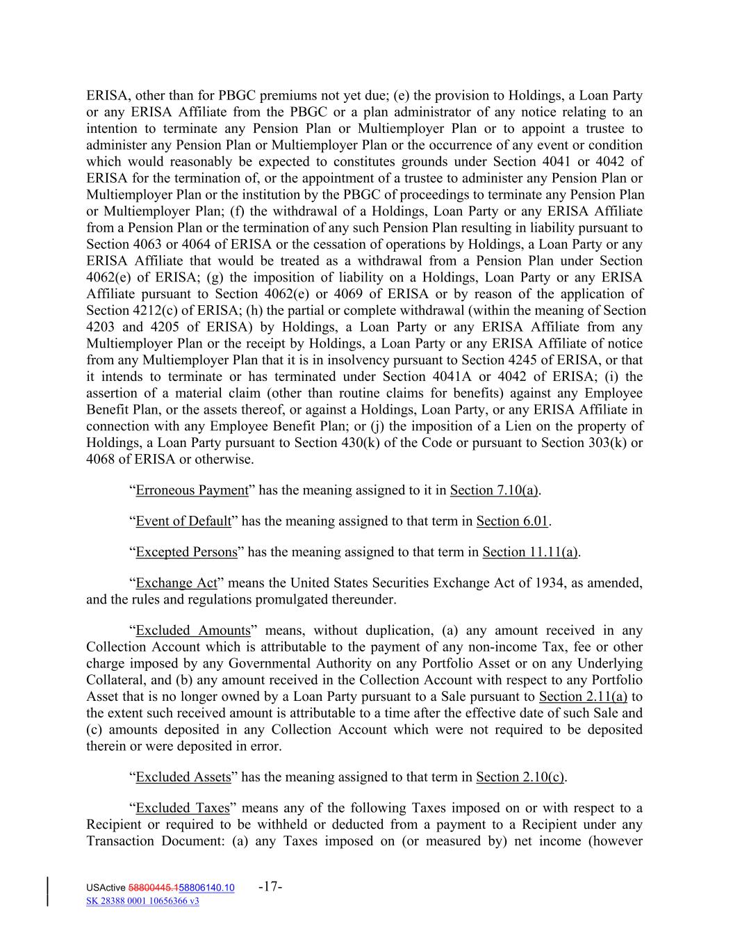 ERISA, other than for PBGC premiums not yet due; (e) the provision to Holdings, a Loan Party or any ERISA Affiliate from the PBGC or a plan administrator of any notice relating to an intention to terminate any Pension Plan or Multiemployer Plan or to appoint a trustee to administer any Pension Plan or Multiemployer Plan or the occurrence of any event or condition which would reasonably be expected to constitutes grounds under Section 4041 or 4042 of ERISA for the termination of, or the appointment of a trustee to administer any Pension Plan or Multiemployer Plan or the institution by the PBGC of proceedings to terminate any Pension Plan or Multiemployer Plan; (f) the withdrawal of a Holdings, Loan Party or any ERISA Affiliate from a Pension Plan or the termination of any such Pension Plan resulting in liability pursuant to Section 4063 or 4064 of ERISA or the cessation of operations by Holdings, a Loan Party or any ERISA Affiliate that would be treated as a withdrawal from a Pension Plan under Section 4062(e) of ERISA; (g) the imposition of liability on a Holdings, Loan Party or any ERISA Affiliate pursuant to Section 4062(e) or 4069 of ERISA or by reason of the application of Section 4212(c) of ERISA; (h) the partial or complete withdrawal (within the meaning of Section 4203 and 4205 of ERISA) by Holdings, a Loan Party or any ERISA Affiliate from any Multiemployer Plan or the receipt by Holdings, a Loan Party or any ERISA Affiliate of notice from any Multiemployer Plan that it is in insolvency pursuant to Section 4245 of ERISA, or that it intends to terminate or has terminated under Section 4041A or 4042 of ERISA; (i) the assertion of a material claim (other than routine claims for benefits) against any Employee Benefit Plan, or the assets thereof, or against a Holdings, Loan Party, or any ERISA Affiliate in connection with any Employee Benefit Plan; or (j) the imposition of a Lien on the property of Holdings, a Loan Party pursuant to Section 430(k) of the Code or pursuant to Section 303(k) or 4068 of ERISA or otherwise. “Erroneous Payment” has the meaning assigned to it in Section 7.10(a). “Event of Default” has the meaning assigned to that term in Section 6.01. “Excepted Persons” has the meaning assigned to that term in Section 11.11(a). “Exchange Act” means the United States Securities Exchange Act of 1934, as amended, and the rules and regulations promulgated thereunder. “Excluded Amounts” means, without duplication, (a) any amount received in any Collection Account which is attributable to the payment of any non‐income Tax, fee or other charge imposed by any Governmental Authority on any Portfolio Asset or on any Underlying Collateral, and (b) any amount received in the Collection Account with respect to any Portfolio Asset that is no longer owned by a Loan Party pursuant to a Sale pursuant to Section 2.11(a) to the extent such received amount is attributable to a time after the effective date of such Sale and (c) amounts deposited in any Collection Account which were not required to be deposited therein or were deposited in error. “Excluded Assets” has the meaning assigned to that term in Section 2.10(c). “Excluded Taxes” means any of the following Taxes imposed on or with respect to a Recipient or required to be withheld or deducted from a payment to a Recipient under any Transaction Document: (a) any Taxes imposed on (or measured by) net income (however USActive 58800445.158806140.10 -17- SK 28388 0001 10656366 v3