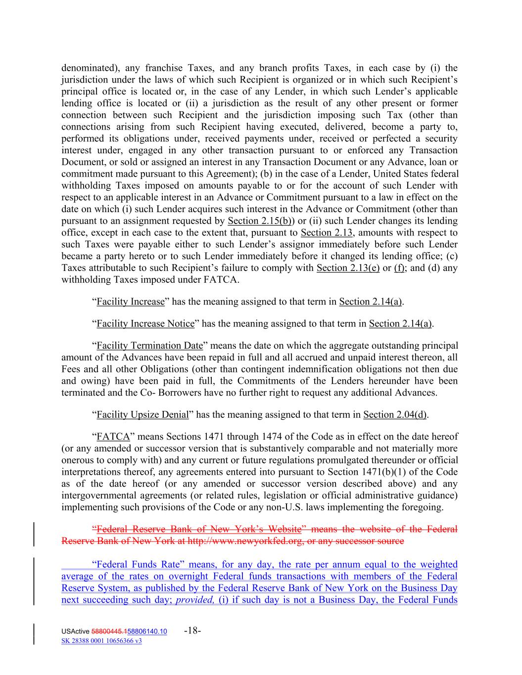 denominated), any franchise Taxes, and any branch profits Taxes, in each case by (i) the jurisdiction under the laws of which such Recipient is organized or in which such Recipient’s principal office is located or, in the case of any Lender, in which such Lender’s applicable lending office is located or (ii) a jurisdiction as the result of any other present or former connection between such Recipient and the jurisdiction imposing such Tax (other than connections arising from such Recipient having executed, delivered, become a party to, performed its obligations under, received payments under, received or perfected a security interest under, engaged in any other transaction pursuant to or enforced any Transaction Document, or sold or assigned an interest in any Transaction Document or any Advance, loan or commitment made pursuant to this Agreement); (b) in the case of a Lender, United States federal withholding Taxes imposed on amounts payable to or for the account of such Lender with respect to an applicable interest in an Advance or Commitment pursuant to a law in effect on the date on which (i) such Lender acquires such interest in the Advance or Commitment (other than pursuant to an assignment requested by Section 2.15(b)) or (ii) such Lender changes its lending office, except in each case to the extent that, pursuant to Section 2.13, amounts with respect to such Taxes were payable either to such Lender’s assignor immediately before such Lender became a party hereto or to such Lender immediately before it changed its lending office; (c) Taxes attributable to such Recipient’s failure to comply with Section 2.13(e) or (f); and (d) any withholding Taxes imposed under FATCA. “Facility Increase” has the meaning assigned to that term in Section 2.14(a). “Facility Increase Notice” has the meaning assigned to that term in Section 2.14(a). “Facility Termination Date” means the date on which the aggregate outstanding principal amount of the Advances have been repaid in full and all accrued and unpaid interest thereon, all Fees and all other Obligations (other than contingent indemnification obligations not then due and owing) have been paid in full, the Commitments of the Lenders hereunder have been terminated and the Co‐ Borrowers have no further right to request any additional Advances. “Facility Upsize Denial” has the meaning assigned to that term in Section 2.04(d). “FATCA” means Sections 1471 through 1474 of the Code as in effect on the date hereof (or any amended or successor version that is substantively comparable and not materially more onerous to comply with) and any current or future regulations promulgated thereunder or official interpretations thereof, any agreements entered into pursuant to Section 1471(b)(1) of the Code as of the date hereof (or any amended or successor version described above) and any intergovernmental agreements (or related rules, legislation or official administrative guidance) implementing such provisions of the Code or any non‐U.S. laws implementing the foregoing. “Federal Reserve Bank of New York’s Website” means the website of the Federal Reserve Bank of New York at http://www.newyorkfed.org, or any successor source “Federal Funds Rate” means, for any day, the rate per annum equal to the weighted average of the rates on overnight Federal funds transactions with members of the Federal Reserve System, as published by the Federal Reserve Bank of New York on the Business Day next succeeding such day; provided, (i) if such day is not a Business Day, the Federal Funds USActive 58800445.158806140.10 -18- SK 28388 0001 10656366 v3