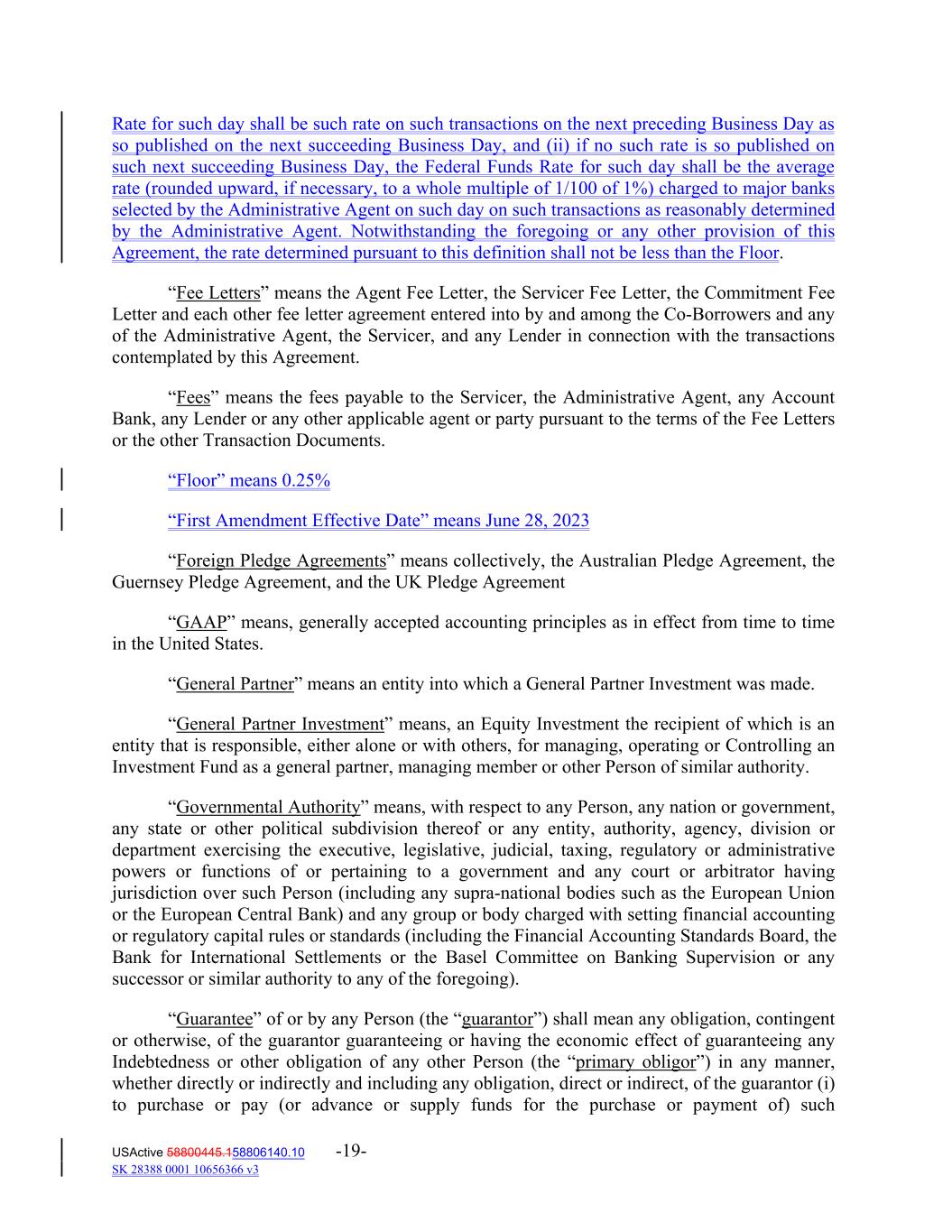 Rate for such day shall be such rate on such transactions on the next preceding Business Day as so published on the next succeeding Business Day, and (ii) if no such rate is so published on such next succeeding Business Day, the Federal Funds Rate for such day shall be the average rate (rounded upward, if necessary, to a whole multiple of 1/100 of 1%) charged to major banks selected by the Administrative Agent on such day on such transactions as reasonably determined by the Administrative Agent. Notwithstanding the foregoing or any other provision of this Agreement, the rate determined pursuant to this definition shall not be less than the Floor. “Fee Letters” means the Agent Fee Letter, the Servicer Fee Letter, the Commitment Fee Letter and each other fee letter agreement entered into by and among the Co‐Borrowers and any of the Administrative Agent, the Servicer, and any Lender in connection with the transactions contemplated by this Agreement. “Fees” means the fees payable to the Servicer, the Administrative Agent, any Account Bank, any Lender or any other applicable agent or party pursuant to the terms of the Fee Letters or the other Transaction Documents. “Floor” means 0.25% “First Amendment Effective Date” means June 28, 2023 “Foreign Pledge Agreements” means collectively, the Australian Pledge Agreement, the Guernsey Pledge Agreement, and the UK Pledge Agreement “GAAP” means, generally accepted accounting principles as in effect from time to time in the United States. “General Partner” means an entity into which a General Partner Investment was made. “General Partner Investment” means, an Equity Investment the recipient of which is an entity that is responsible, either alone or with others, for managing, operating or Controlling an Investment Fund as a general partner, managing member or other Person of similar authority. “Governmental Authority” means, with respect to any Person, any nation or government, any state or other political subdivision thereof or any entity, authority, agency, division or department exercising the executive, legislative, judicial, taxing, regulatory or administrative powers or functions of or pertaining to a government and any court or arbitrator having jurisdiction over such Person (including any supra‐national bodies such as the European Union or the European Central Bank) and any group or body charged with setting financial accounting or regulatory capital rules or standards (including the Financial Accounting Standards Board, the Bank for International Settlements or the Basel Committee on Banking Supervision or any successor or similar authority to any of the foregoing). “Guarantee” of or by any Person (the “guarantor”) shall mean any obligation, contingent or otherwise, of the guarantor guaranteeing or having the economic effect of guaranteeing any Indebtedness or other obligation of any other Person (the “primary obligor”) in any manner, whether directly or indirectly and including any obligation, direct or indirect, of the guarantor (i) to purchase or pay (or advance or supply funds for the purchase or payment of) such USActive 58800445.158806140.10 -19- SK 28388 0001 10656366 v3