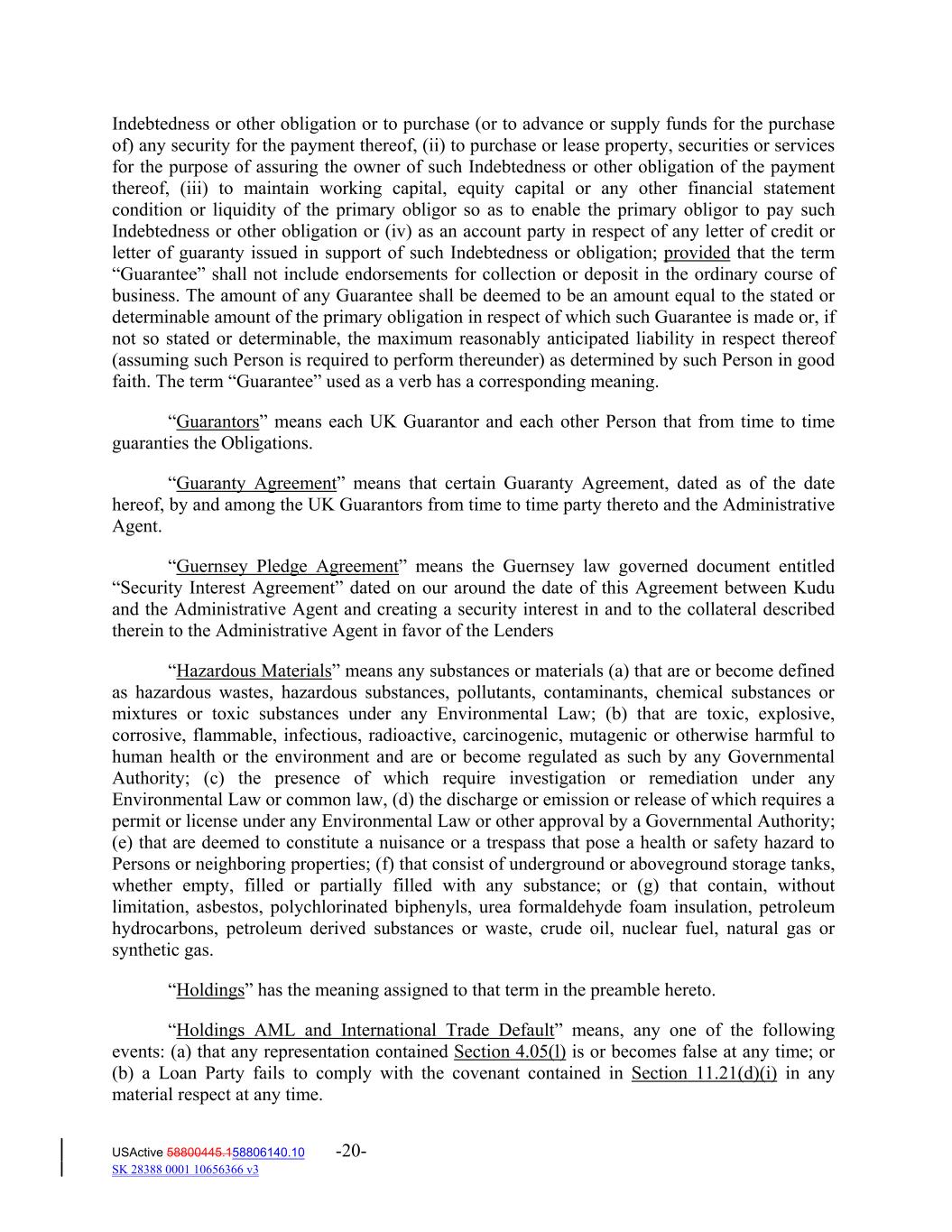 Indebtedness or other obligation or to purchase (or to advance or supply funds for the purchase of) any security for the payment thereof, (ii) to purchase or lease property, securities or services for the purpose of assuring the owner of such Indebtedness or other obligation of the payment thereof, (iii) to maintain working capital, equity capital or any other financial statement condition or liquidity of the primary obligor so as to enable the primary obligor to pay such Indebtedness or other obligation or (iv) as an account party in respect of any letter of credit or letter of guaranty issued in support of such Indebtedness or obligation; provided that the term “Guarantee” shall not include endorsements for collection or deposit in the ordinary course of business. The amount of any Guarantee shall be deemed to be an amount equal to the stated or determinable amount of the primary obligation in respect of which such Guarantee is made or, if not so stated or determinable, the maximum reasonably anticipated liability in respect thereof (assuming such Person is required to perform thereunder) as determined by such Person in good faith. The term “Guarantee” used as a verb has a corresponding meaning. “Guarantors” means each UK Guarantor and each other Person that from time to time guaranties the Obligations. “Guaranty Agreement” means that certain Guaranty Agreement, dated as of the date hereof, by and among the UK Guarantors from time to time party thereto and the Administrative Agent. “Guernsey Pledge Agreement” means the Guernsey law governed document entitled “Security Interest Agreement” dated on our around the date of this Agreement between Kudu and the Administrative Agent and creating a security interest in and to the collateral described therein to the Administrative Agent in favor of the Lenders “Hazardous Materials” means any substances or materials (a) that are or become defined as hazardous wastes, hazardous substances, pollutants, contaminants, chemical substances or mixtures or toxic substances under any Environmental Law; (b) that are toxic, explosive, corrosive, flammable, infectious, radioactive, carcinogenic, mutagenic or otherwise harmful to human health or the environment and are or become regulated as such by any Governmental Authority; (c) the presence of which require investigation or remediation under any Environmental Law or common law, (d) the discharge or emission or release of which requires a permit or license under any Environmental Law or other approval by a Governmental Authority; (e) that are deemed to constitute a nuisance or a trespass that pose a health or safety hazard to Persons or neighboring properties; (f) that consist of underground or aboveground storage tanks, whether empty, filled or partially filled with any substance; or (g) that contain, without limitation, asbestos, polychlorinated biphenyls, urea formaldehyde foam insulation, petroleum hydrocarbons, petroleum derived substances or waste, crude oil, nuclear fuel, natural gas or synthetic gas. “Holdings” has the meaning assigned to that term in the preamble hereto. “Holdings AML and International Trade Default” means, any one of the following events: (a) that any representation contained Section 4.05(l) is or becomes false at any time; or (b) a Loan Party fails to comply with the covenant contained in Section 11.21(d)(i) in any material respect at any time. USActive 58800445.158806140.10 -20- SK 28388 0001 10656366 v3