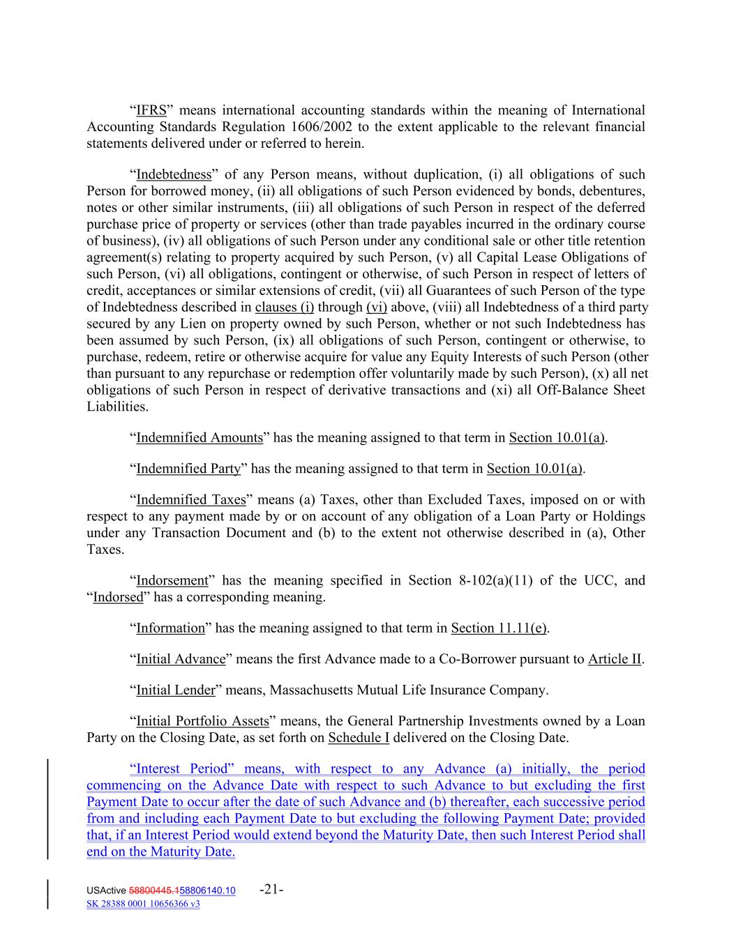 “IFRS” means international accounting standards within the meaning of International Accounting Standards Regulation 1606/2002 to the extent applicable to the relevant financial statements delivered under or referred to herein. “Indebtedness” of any Person means, without duplication, (i) all obligations of such Person for borrowed money, (ii) all obligations of such Person evidenced by bonds, debentures, notes or other similar instruments, (iii) all obligations of such Person in respect of the deferred purchase price of property or services (other than trade payables incurred in the ordinary course of business), (iv) all obligations of such Person under any conditional sale or other title retention agreement(s) relating to property acquired by such Person, (v) all Capital Lease Obligations of such Person, (vi) all obligations, contingent or otherwise, of such Person in respect of letters of credit, acceptances or similar extensions of credit, (vii) all Guarantees of such Person of the type of Indebtedness described in clauses (i) through (vi) above, (viii) all Indebtedness of a third party secured by any Lien on property owned by such Person, whether or not such Indebtedness has been assumed by such Person, (ix) all obligations of such Person, contingent or otherwise, to purchase, redeem, retire or otherwise acquire for value any Equity Interests of such Person (other than pursuant to any repurchase or redemption offer voluntarily made by such Person), (x) all net obligations of such Person in respect of derivative transactions and (xi) all Off‐Balance Sheet Liabilities. “Indemnified Amounts” has the meaning assigned to that term in Section 10.01(a). “Indemnified Party” has the meaning assigned to that term in Section 10.01(a). “Indemnified Taxes” means (a) Taxes, other than Excluded Taxes, imposed on or with respect to any payment made by or on account of any obligation of a Loan Party or Holdings under any Transaction Document and (b) to the extent not otherwise described in (a), Other Taxes. “Indorsement” has the meaning specified in Section 8‐102(a)(11) of the UCC, and “Indorsed” has a corresponding meaning. “Information” has the meaning assigned to that term in Section 11.11(e). “Initial Advance” means the first Advance made to a Co‐Borrower pursuant to Article II. “Initial Lender” means, Massachusetts Mutual Life Insurance Company. “Initial Portfolio Assets” means, the General Partnership Investments owned by a Loan Party on the Closing Date, as set forth on Schedule I delivered on the Closing Date. “Interest Period” means, with respect to any Advance (a) initially, the period commencing on the Advance Date with respect to such Advance to but excluding the first Payment Date to occur after the date of such Advance and (b) thereafter, each successive period from and including each Payment Date to but excluding the following Payment Date; provided that, if an Interest Period would extend beyond the Maturity Date, then such Interest Period shall end on the Maturity Date. USActive 58800445.158806140.10 -21- SK 28388 0001 10656366 v3