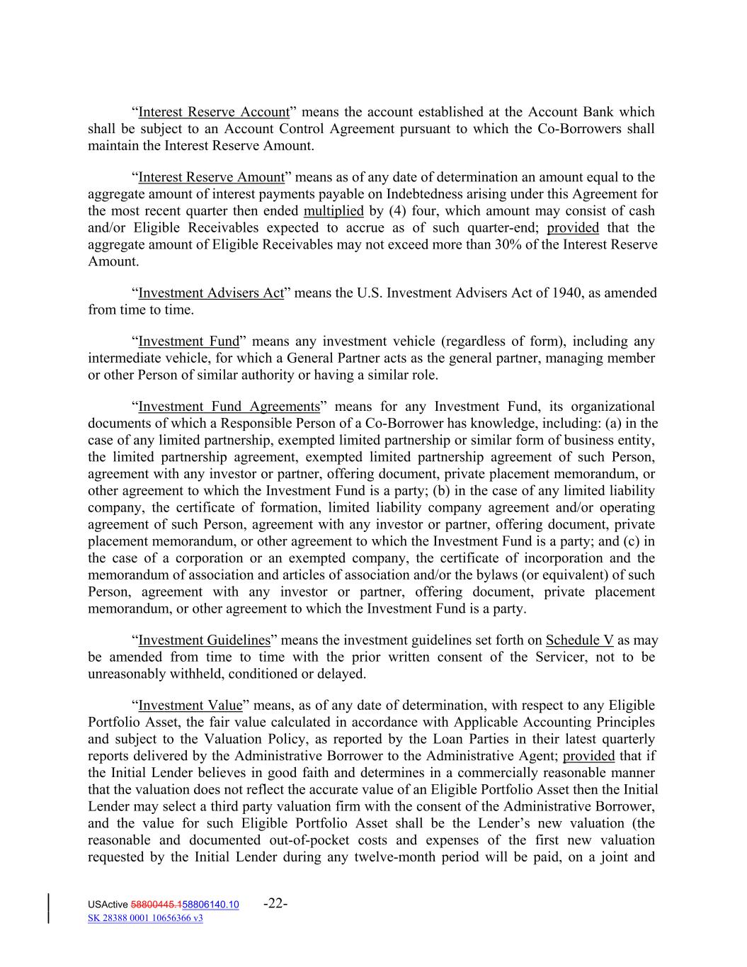 “Interest Reserve Account” means the account established at the Account Bank which shall be subject to an Account Control Agreement pursuant to which the Co‐Borrowers shall maintain the Interest Reserve Amount. “Interest Reserve Amount” means as of any date of determination an amount equal to the aggregate amount of interest payments payable on Indebtedness arising under this Agreement for the most recent quarter then ended multiplied by (4) four, which amount may consist of cash and/or Eligible Receivables expected to accrue as of such quarter‐end; provided that the aggregate amount of Eligible Receivables may not exceed more than 30% of the Interest Reserve Amount. “Investment Advisers Act” means the U.S. Investment Advisers Act of 1940, as amended from time to time. “Investment Fund” means any investment vehicle (regardless of form), including any intermediate vehicle, for which a General Partner acts as the general partner, managing member or other Person of similar authority or having a similar role. “Investment Fund Agreements” means for any Investment Fund, its organizational documents of which a Responsible Person of a Co‐Borrower has knowledge, including: (a) in the case of any limited partnership, exempted limited partnership or similar form of business entity, the limited partnership agreement, exempted limited partnership agreement of such Person, agreement with any investor or partner, offering document, private placement memorandum, or other agreement to which the Investment Fund is a party; (b) in the case of any limited liability company, the certificate of formation, limited liability company agreement and/or operating agreement of such Person, agreement with any investor or partner, offering document, private placement memorandum, or other agreement to which the Investment Fund is a party; and (c) in the case of a corporation or an exempted company, the certificate of incorporation and the memorandum of association and articles of association and/or the bylaws (or equivalent) of such Person, agreement with any investor or partner, offering document, private placement memorandum, or other agreement to which the Investment Fund is a party. “Investment Guidelines” means the investment guidelines set forth on Schedule V as may be amended from time to time with the prior written consent of the Servicer, not to be unreasonably withheld, conditioned or delayed. “Investment Value” means, as of any date of determination, with respect to any Eligible Portfolio Asset, the fair value calculated in accordance with Applicable Accounting Principles and subject to the Valuation Policy, as reported by the Loan Parties in their latest quarterly reports delivered by the Administrative Borrower to the Administrative Agent; provided that if the Initial Lender believes in good faith and determines in a commercially reasonable manner that the valuation does not reflect the accurate value of an Eligible Portfolio Asset then the Initial Lender may select a third party valuation firm with the consent of the Administrative Borrower, and the value for such Eligible Portfolio Asset shall be the Lender’s new valuation (the reasonable and documented out‐of‐pocket costs and expenses of the first new valuation requested by the Initial Lender during any twelve‐month period will be paid, on a joint and USActive 58800445.158806140.10 -22- SK 28388 0001 10656366 v3