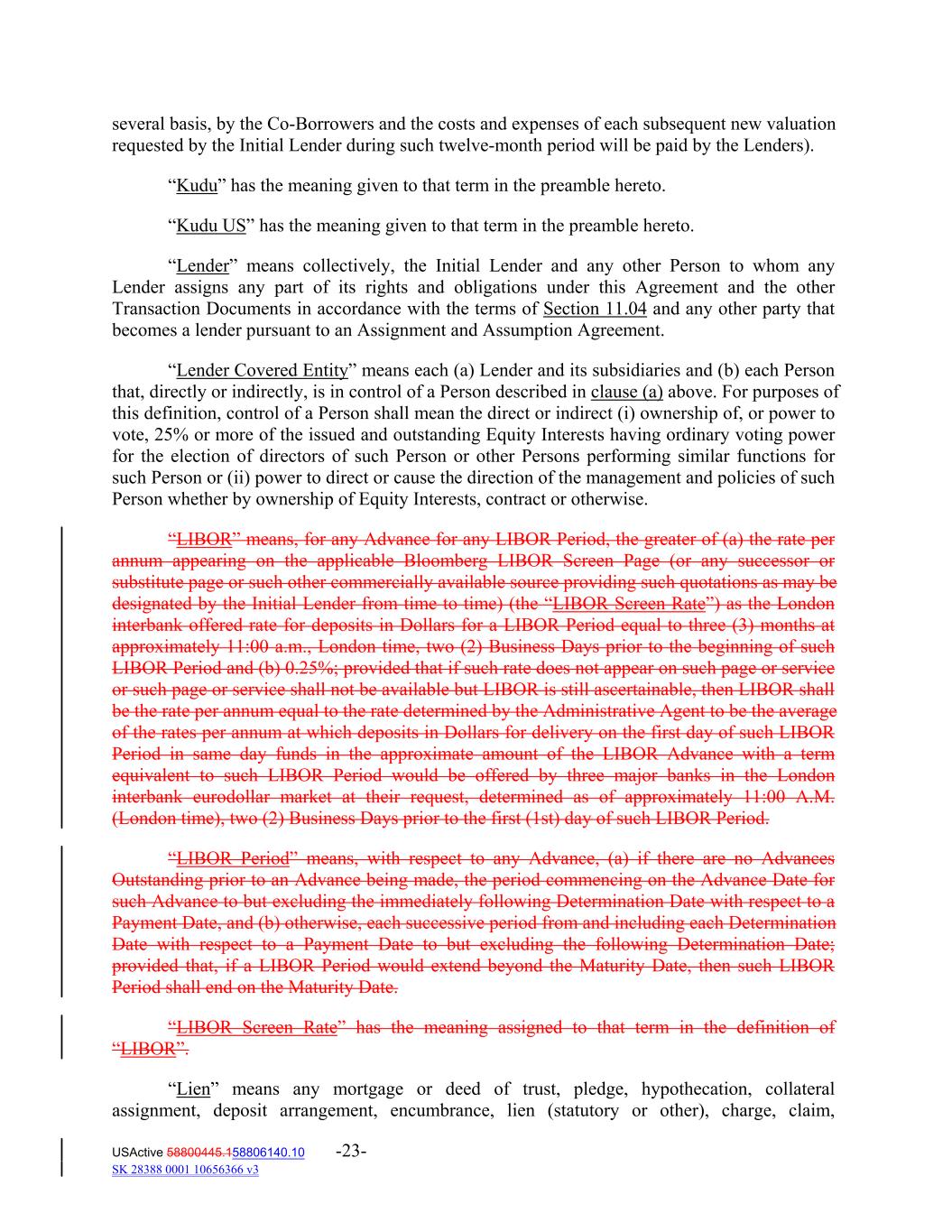 several basis, by the Co‐Borrowers and the costs and expenses of each subsequent new valuation requested by the Initial Lender during such twelve‐month period will be paid by the Lenders). “Kudu” has the meaning given to that term in the preamble hereto. “Kudu US” has the meaning given to that term in the preamble hereto. “Lender” means collectively, the Initial Lender and any other Person to whom any Lender assigns any part of its rights and obligations under this Agreement and the other Transaction Documents in accordance with the terms of Section 11.04 and any other party that becomes a lender pursuant to an Assignment and Assumption Agreement. “Lender Covered Entity” means each (a) Lender and its subsidiaries and (b) each Person that, directly or indirectly, is in control of a Person described in clause (a) above. For purposes of this definition, control of a Person shall mean the direct or indirect (i) ownership of, or power to vote, 25% or more of the issued and outstanding Equity Interests having ordinary voting power for the election of directors of such Person or other Persons performing similar functions for such Person or (ii) power to direct or cause the direction of the management and policies of such Person whether by ownership of Equity Interests, contract or otherwise. “LIBOR” means, for any Advance for any LIBOR Period, the greater of (a) the rate per annum appearing on the applicable Bloomberg LIBOR Screen Page (or any successor or substitute page or such other commercially available source providing such quotations as may be designated by the Initial Lender from time to time) (the “LIBOR Screen Rate”) as the London interbank offered rate for deposits in Dollars for a LIBOR Period equal to three (3) months at approximately 11:00 a.m., London time, two (2) Business Days prior to the beginning of such LIBOR Period and (b) 0.25%; provided that if such rate does not appear on such page or service or such page or service shall not be available but LIBOR is still ascertainable, then LIBOR shall be the rate per annum equal to the rate determined by the Administrative Agent to be the average of the rates per annum at which deposits in Dollars for delivery on the first day of such LIBOR Period in same day funds in the approximate amount of the LIBOR Advance with a term equivalent to such LIBOR Period would be offered by three major banks in the London interbank eurodollar market at their request, determined as of approximately 11:00 A.M. (London time), two (2) Business Days prior to the first (1st) day of such LIBOR Period. “LIBOR Period” means, with respect to any Advance, (a) if there are no Advances Outstanding prior to an Advance being made, the period commencing on the Advance Date for such Advance to but excluding the immediately following Determination Date with respect to a Payment Date, and (b) otherwise, each successive period from and including each Determination Date with respect to a Payment Date to but excluding the following Determination Date; provided that, if a LIBOR Period would extend beyond the Maturity Date, then such LIBOR Period shall end on the Maturity Date. “LIBOR Screen Rate” has the meaning assigned to that term in the definition of “LIBOR”. “Lien” means any mortgage or deed of trust, pledge, hypothecation, collateral assignment, deposit arrangement, encumbrance, lien (statutory or other), charge, claim, USActive 58800445.158806140.10 -23- SK 28388 0001 10656366 v3