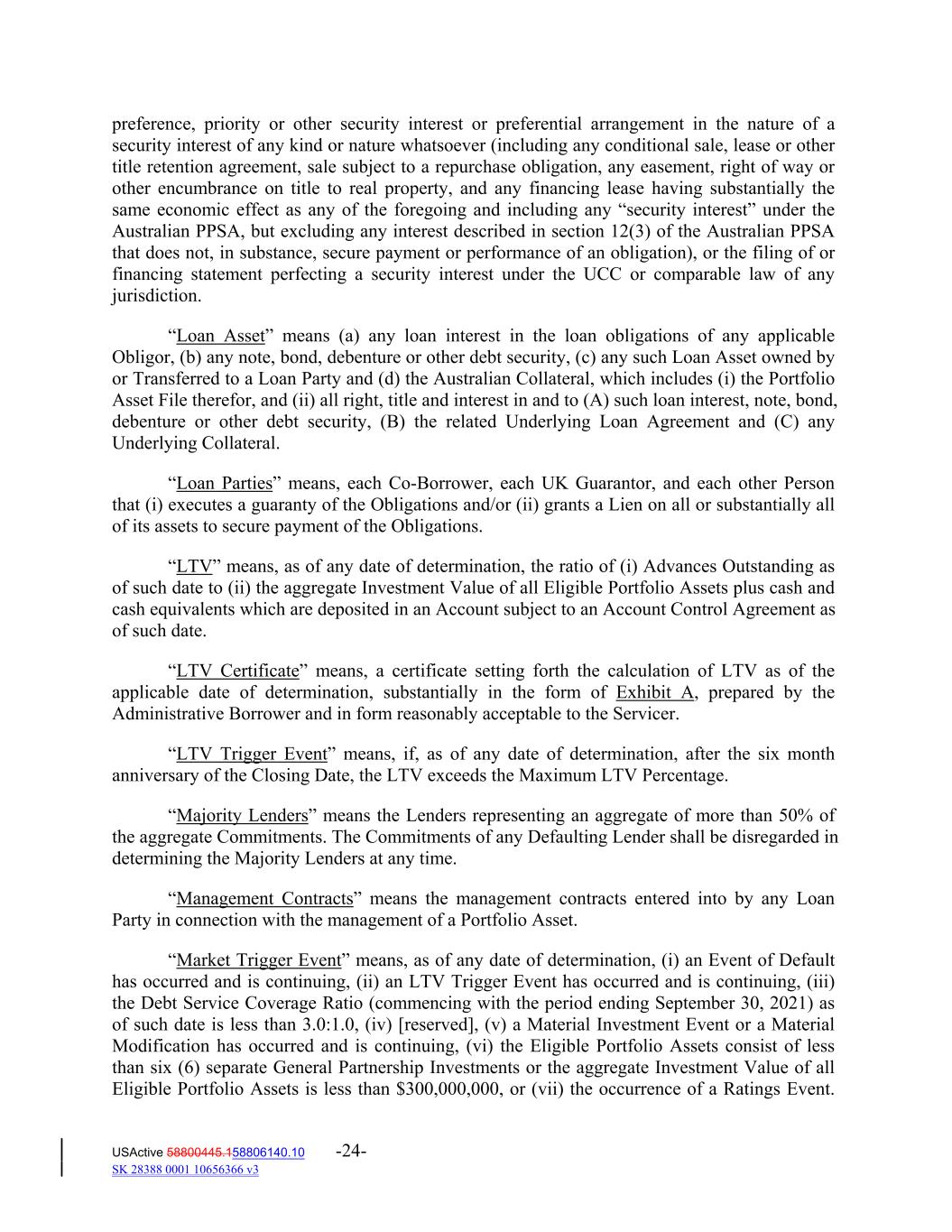 preference, priority or other security interest or preferential arrangement in the nature of a security interest of any kind or nature whatsoever (including any conditional sale, lease or other title retention agreement, sale subject to a repurchase obligation, any easement, right of way or other encumbrance on title to real property, and any financing lease having substantially the same economic effect as any of the foregoing and including any “security interest” under the Australian PPSA, but excluding any interest described in section 12(3) of the Australian PPSA that does not, in substance, secure payment or performance of an obligation), or the filing of or financing statement perfecting a security interest under the UCC or comparable law of any jurisdiction. “Loan Asset” means (a) any loan interest in the loan obligations of any applicable Obligor, (b) any note, bond, debenture or other debt security, (c) any such Loan Asset owned by or Transferred to a Loan Party and (d) the Australian Collateral, which includes (i) the Portfolio Asset File therefor, and (ii) all right, title and interest in and to (A) such loan interest, note, bond, debenture or other debt security, (B) the related Underlying Loan Agreement and (C) any Underlying Collateral. “Loan Parties” means, each Co‐Borrower, each UK Guarantor, and each other Person that (i) executes a guaranty of the Obligations and/or (ii) grants a Lien on all or substantially all of its assets to secure payment of the Obligations. “LTV” means, as of any date of determination, the ratio of (i) Advances Outstanding as of such date to (ii) the aggregate Investment Value of all Eligible Portfolio Assets plus cash and cash equivalents which are deposited in an Account subject to an Account Control Agreement as of such date. “LTV Certificate” means, a certificate setting forth the calculation of LTV as of the applicable date of determination, substantially in the form of Exhibit A, prepared by the Administrative Borrower and in form reasonably acceptable to the Servicer. “LTV Trigger Event” means, if, as of any date of determination, after the six month anniversary of the Closing Date, the LTV exceeds the Maximum LTV Percentage. “Majority Lenders” means the Lenders representing an aggregate of more than 50% of the aggregate Commitments. The Commitments of any Defaulting Lender shall be disregarded in determining the Majority Lenders at any time. “Management Contracts” means the management contracts entered into by any Loan Party in connection with the management of a Portfolio Asset. “Market Trigger Event” means, as of any date of determination, (i) an Event of Default has occurred and is continuing, (ii) an LTV Trigger Event has occurred and is continuing, (iii) the Debt Service Coverage Ratio (commencing with the period ending September 30, 2021) as of such date is less than 3.0:1.0, (iv) [reserved], (v) a Material Investment Event or a Material Modification has occurred and is continuing, (vi) the Eligible Portfolio Assets consist of less than six (6) separate General Partnership Investments or the aggregate Investment Value of all Eligible Portfolio Assets is less than $300,000,000, or (vii) the occurrence of a Ratings Event. USActive 58800445.158806140.10 -24- SK 28388 0001 10656366 v3