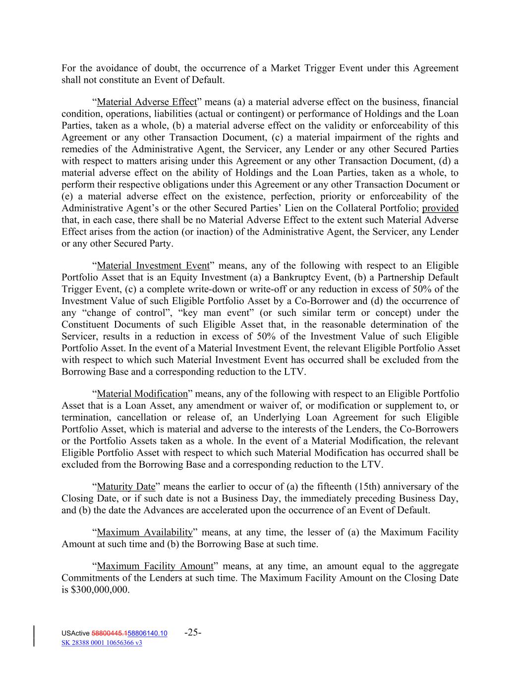 For the avoidance of doubt, the occurrence of a Market Trigger Event under this Agreement shall not constitute an Event of Default. “Material Adverse Effect” means (a) a material adverse effect on the business, financial condition, operations, liabilities (actual or contingent) or performance of Holdings and the Loan Parties, taken as a whole, (b) a material adverse effect on the validity or enforceability of this Agreement or any other Transaction Document, (c) a material impairment of the rights and remedies of the Administrative Agent, the Servicer, any Lender or any other Secured Parties with respect to matters arising under this Agreement or any other Transaction Document, (d) a material adverse effect on the ability of Holdings and the Loan Parties, taken as a whole, to perform their respective obligations under this Agreement or any other Transaction Document or (e) a material adverse effect on the existence, perfection, priority or enforceability of the Administrative Agent’s or the other Secured Parties’ Lien on the Collateral Portfolio; provided that, in each case, there shall be no Material Adverse Effect to the extent such Material Adverse Effect arises from the action (or inaction) of the Administrative Agent, the Servicer, any Lender or any other Secured Party. “Material Investment Event” means, any of the following with respect to an Eligible Portfolio Asset that is an Equity Investment (a) a Bankruptcy Event, (b) a Partnership Default Trigger Event, (c) a complete write‐down or write‐off or any reduction in excess of 50% of the Investment Value of such Eligible Portfolio Asset by a Co‐Borrower and (d) the occurrence of any “change of control”, “key man event” (or such similar term or concept) under the Constituent Documents of such Eligible Asset that, in the reasonable determination of the Servicer, results in a reduction in excess of 50% of the Investment Value of such Eligible Portfolio Asset. In the event of a Material Investment Event, the relevant Eligible Portfolio Asset with respect to which such Material Investment Event has occurred shall be excluded from the Borrowing Base and a corresponding reduction to the LTV. “Material Modification” means, any of the following with respect to an Eligible Portfolio Asset that is a Loan Asset, any amendment or waiver of, or modification or supplement to, or termination, cancellation or release of, an Underlying Loan Agreement for such Eligible Portfolio Asset, which is material and adverse to the interests of the Lenders, the Co‐Borrowers or the Portfolio Assets taken as a whole. In the event of a Material Modification, the relevant Eligible Portfolio Asset with respect to which such Material Modification has occurred shall be excluded from the Borrowing Base and a corresponding reduction to the LTV. “Maturity Date” means the earlier to occur of (a) the fifteenth (15th) anniversary of the Closing Date, or if such date is not a Business Day, the immediately preceding Business Day, and (b) the date the Advances are accelerated upon the occurrence of an Event of Default. “Maximum Availability” means, at any time, the lesser of (a) the Maximum Facility Amount at such time and (b) the Borrowing Base at such time. “Maximum Facility Amount” means, at any time, an amount equal to the aggregate Commitments of the Lenders at such time. The Maximum Facility Amount on the Closing Date is $300,000,000. USActive 58800445.158806140.10 -25- SK 28388 0001 10656366 v3