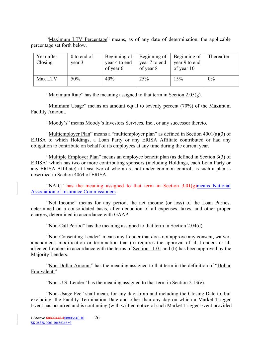 USActive 58800445.158806140.10 -26- SK 28388 0001 10656366 v3 Thereafter0 to end of year 3 Max LTV “Maximum LTV Percentage” means, as of any date of determination, the applicable percentage set forth below. 50% Beginning of year 4 to end of year 6 40% 25% Beginning of year 7 to end of year 8 15% 0% Beginning of year 9 to end of year 10 “Maximum Rate” has the meaning assigned to that term in Section 2.05(g). “Minimum Usage” means an amount equal to seventy percent (70%) of the Maximum Facility Amount. “Moody’s” means Moody’s Investors Services, Inc., or any successor thereto. “Multiemployer Plan” means a “multiemployer plan” as defined in Section 4001(a)(3) of ERISA to which Holdings, a Loan Party or any ERISA Affiliate contributed or had any obligation to contribute on behalf of its employees at any time during the current year. “Multiple Employer Plan” means an employee benefit plan (as defined in Section 3(3) of ERISA) which has two or more contributing sponsors (including Holdings, each Loan Party or any ERISA Affiliate) at least two of whom are not under common control, as such a plan is described in Section 4064 of ERISA. “NAIC” has the meaning assigned to that term in Section 3.01(g)means National Association of Insurance Commissioners. “Net Income” means for any period, the net income (or loss) of the Loan Parties, determined on a consolidated basis, after deduction of all expenses, taxes, and other proper charges, determined in accordance with GAAP. “Non‐Call Period” has the meaning assigned to that term in Section 2.04(d). “Non‐Consenting Lender” means any Lender that does not approve any consent, waiver, amendment, modification or termination that (a) requires the approval of all Lenders or all affected Lenders in accordance with the terms of Section 11.01 and (b) has been approved by the Majority Lenders. “Non‐Dollar Amount” has the meaning assigned to that term in the definition of “Dollar Equivalent.” “Non‐U.S. Lender” has the meaning assigned to that term in Section 2.13(e). “Non‐Usage Fee” shall mean, for any day, from and including the Closing Date to, but excluding, the Facility Termination Date and other than any day on which a Market Trigger Event has occurred and is continuing (with written notice of such Market Trigger Event provided Year after Closing