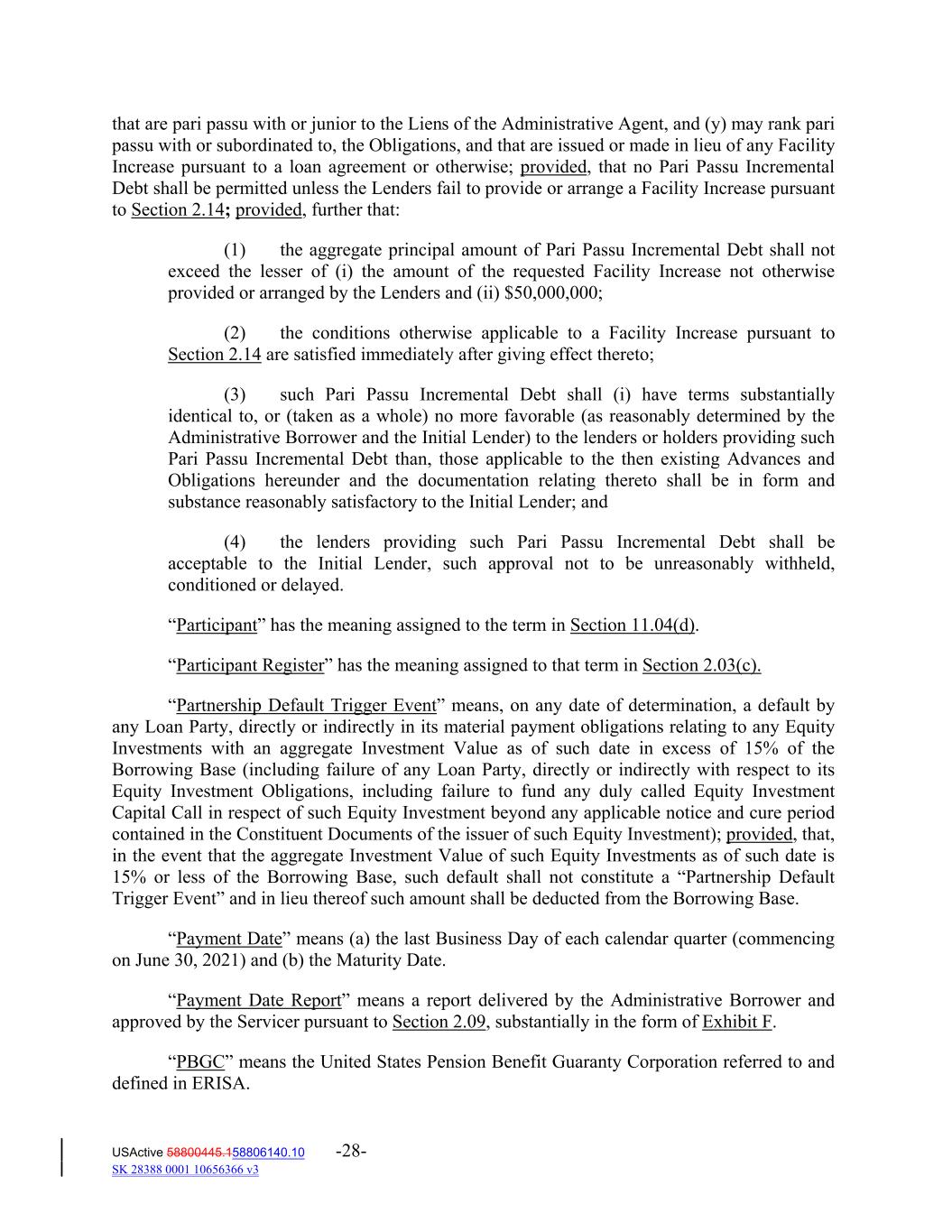 that are pari passu with or junior to the Liens of the Administrative Agent, and (y) may rank pari passu with or subordinated to, the Obligations, and that are issued or made in lieu of any Facility Increase pursuant to a loan agreement or otherwise; provided, that no Pari Passu Incremental Debt shall be permitted unless the Lenders fail to provide or arrange a Facility Increase pursuant to Section 2.14; provided, further that: (1) the aggregate principal amount of Pari Passu Incremental Debt shall not exceed the lesser of (i) the amount of the requested Facility Increase not otherwise provided or arranged by the Lenders and (ii) $50,000,000; (2) the conditions otherwise applicable to a Facility Increase pursuant to Section 2.14 are satisfied immediately after giving effect thereto; (3) such Pari Passu Incremental Debt shall (i) have terms substantially identical to, or (taken as a whole) no more favorable (as reasonably determined by the Administrative Borrower and the Initial Lender) to the lenders or holders providing such Pari Passu Incremental Debt than, those applicable to the then existing Advances and Obligations hereunder and the documentation relating thereto shall be in form and substance reasonably satisfactory to the Initial Lender; and (4) the lenders providing such Pari Passu Incremental Debt shall be acceptable to the Initial Lender, such approval not to be unreasonably withheld, conditioned or delayed. “Participant” has the meaning assigned to the term in Section 11.04(d). “Participant Register” has the meaning assigned to that term in Section 2.03(c). “Partnership Default Trigger Event” means, on any date of determination, a default by any Loan Party, directly or indirectly in its material payment obligations relating to any Equity Investments with an aggregate Investment Value as of such date in excess of 15% of the Borrowing Base (including failure of any Loan Party, directly or indirectly with respect to its Equity Investment Obligations, including failure to fund any duly called Equity Investment Capital Call in respect of such Equity Investment beyond any applicable notice and cure period contained in the Constituent Documents of the issuer of such Equity Investment); provided, that, in the event that the aggregate Investment Value of such Equity Investments as of such date is 15% or less of the Borrowing Base, such default shall not constitute a “Partnership Default Trigger Event” and in lieu thereof such amount shall be deducted from the Borrowing Base. “Payment Date” means (a) the last Business Day of each calendar quarter (commencing on June 30, 2021) and (b) the Maturity Date. “Payment Date Report” means a report delivered by the Administrative Borrower and approved by the Servicer pursuant to Section 2.09, substantially in the form of Exhibit F. “PBGC” means the United States Pension Benefit Guaranty Corporation referred to and defined in ERISA. USActive 58800445.158806140.10 -28- SK 28388 0001 10656366 v3