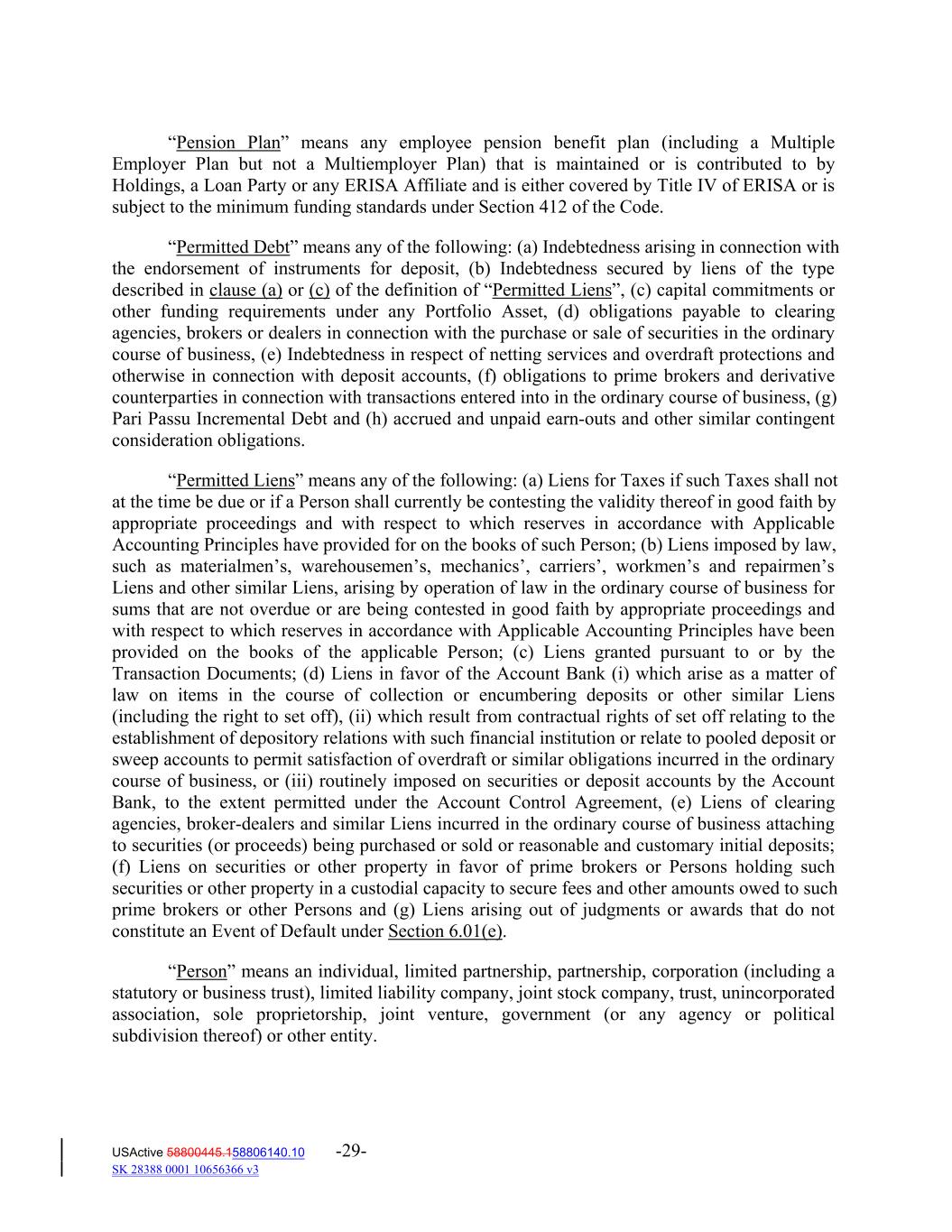 “Pension Plan” means any employee pension benefit plan (including a Multiple Employer Plan but not a Multiemployer Plan) that is maintained or is contributed to by Holdings, a Loan Party or any ERISA Affiliate and is either covered by Title IV of ERISA or is subject to the minimum funding standards under Section 412 of the Code. “Permitted Debt” means any of the following: (a) Indebtedness arising in connection with the endorsement of instruments for deposit, (b) Indebtedness secured by liens of the type described in clause (a) or (c) of the definition of “Permitted Liens”, (c) capital commitments or other funding requirements under any Portfolio Asset, (d) obligations payable to clearing agencies, brokers or dealers in connection with the purchase or sale of securities in the ordinary course of business, (e) Indebtedness in respect of netting services and overdraft protections and otherwise in connection with deposit accounts, (f) obligations to prime brokers and derivative counterparties in connection with transactions entered into in the ordinary course of business, (g) Pari Passu Incremental Debt and (h) accrued and unpaid earn‐outs and other similar contingent consideration obligations. “Permitted Liens” means any of the following: (a) Liens for Taxes if such Taxes shall not at the time be due or if a Person shall currently be contesting the validity thereof in good faith by appropriate proceedings and with respect to which reserves in accordance with Applicable Accounting Principles have provided for on the books of such Person; (b) Liens imposed by law, such as materialmen’s, warehousemen’s, mechanics’, carriers’, workmen’s and repairmen’s Liens and other similar Liens, arising by operation of law in the ordinary course of business for sums that are not overdue or are being contested in good faith by appropriate proceedings and with respect to which reserves in accordance with Applicable Accounting Principles have been provided on the books of the applicable Person; (c) Liens granted pursuant to or by the Transaction Documents; (d) Liens in favor of the Account Bank (i) which arise as a matter of law on items in the course of collection or encumbering deposits or other similar Liens (including the right to set off), (ii) which result from contractual rights of set off relating to the establishment of depository relations with such financial institution or relate to pooled deposit or sweep accounts to permit satisfaction of overdraft or similar obligations incurred in the ordinary course of business, or (iii) routinely imposed on securities or deposit accounts by the Account Bank, to the extent permitted under the Account Control Agreement, (e) Liens of clearing agencies, broker‐dealers and similar Liens incurred in the ordinary course of business attaching to securities (or proceeds) being purchased or sold or reasonable and customary initial deposits; (f) Liens on securities or other property in favor of prime brokers or Persons holding such securities or other property in a custodial capacity to secure fees and other amounts owed to such prime brokers or other Persons and (g) Liens arising out of judgments or awards that do not constitute an Event of Default under Section 6.01(e). “Person” means an individual, limited partnership, partnership, corporation (including a statutory or business trust), limited liability company, joint stock company, trust, unincorporated association, sole proprietorship, joint venture, government (or any agency or political subdivision thereof) or other entity. USActive 58800445.158806140.10 -29- SK 28388 0001 10656366 v3