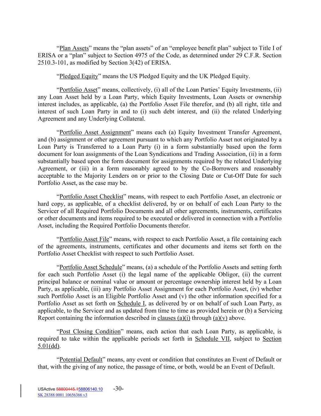 “Plan Assets” means the “plan assets” of an “employee benefit plan” subject to Title I of ERISA or a “plan” subject to Section 4975 of the Code, as determined under 29 C.F.R. Section 2510.3‐101, as modified by Section 3(42) of ERISA. “Pledged Equity” means the US Pledged Equity and the UK Pledged Equity. “Portfolio Asset” means, collectively, (i) all of the Loan Parties’ Equity Investments, (ii) any Loan Asset held by a Loan Party, which Equity Investments, Loan Assets or ownership interest includes, as applicable, (a) the Portfolio Asset File therefor, and (b) all right, title and interest of such Loan Party in and to (i) such debt interest, and (ii) the related Underlying Agreement and any Underlying Collateral. “Portfolio Asset Assignment” means each (a) Equity Investment Transfer Agreement, and (b) assignment or other agreement pursuant to which any Portfolio Asset not originated by a Loan Party is Transferred to a Loan Party (i) in a form substantially based upon the form document for loan assignments of the Loan Syndications and Trading Association, (ii) in a form substantially based upon the form document for assignments required by the related Underlying Agreement, or (iii) in a form reasonably agreed to by the Co‐Borrowers and reasonably acceptable to the Majority Lenders on or prior to the Closing Date or Cut‐Off Date for such Portfolio Asset, as the case may be. “Portfolio Asset Checklist” means, with respect to each Portfolio Asset, an electronic or hard copy, as applicable, of a checklist delivered, by or on behalf of each Loan Party to the Servicer of all Required Portfolio Documents and all other agreements, instruments, certificates or other documents and items required to be executed or delivered in connection with a Portfolio Asset, including the Required Portfolio Documents therefor. “Portfolio Asset File” means, with respect to each Portfolio Asset, a file containing each of the agreements, instruments, certificates and other documents and items set forth on the Portfolio Asset Checklist with respect to such Portfolio Asset. “Portfolio Asset Schedule” means, (a) a schedule of the Portfolio Assets and setting forth for each such Portfolio Asset (i) the legal name of the applicable Obligor, (ii) the current principal balance or nominal value or amount or percentage ownership interest held by a Loan Party, as applicable, (iii) any Portfolio Asset Assignment for each Portfolio Asset, (iv) whether such Portfolio Asset is an Eligible Portfolio Asset and (v) the other information specified for a Portfolio Asset as set forth on Schedule I, as delivered by or on behalf of such Loan Party, as applicable, to the Servicer and as updated from time to time as provided herein or (b) a Servicing Report containing the information described in clauses (a)(i) through (a)(v) above. “Post Closing Condition” means, each action that each Loan Party, as applicable, is required to take within the applicable periods set forth in Schedule VII, subject to Section 5.01(dd). “Potential Default” means, any event or condition that constitutes an Event of Default or that, with the giving of any notice, the passage of time, or both, would be an Event of Default. USActive 58800445.158806140.10 -30- SK 28388 0001 10656366 v3