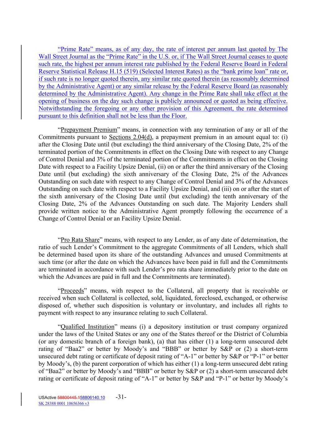 “Prime Rate” means, as of any day, the rate of interest per annum last quoted by The Wall Street Journal as the “Prime Rate” in the U.S. or, if The Wall Street Journal ceases to quote such rate, the highest per annum interest rate published by the Federal Reserve Board in Federal Reserve Statistical Release H.15 (519) (Selected Interest Rates) as the “bank prime loan” rate or, if such rate is no longer quoted therein, any similar rate quoted therein (as reasonably determined by the Administrative Agent) or any similar release by the Federal Reserve Board (as reasonably determined by the Administrative Agent). Any change in the Prime Rate shall take effect at the opening of business on the day such change is publicly announced or quoted as being effective. Notwithstanding the foregoing or any other provision of this Agreement, the rate determined pursuant to this definition shall not be less than the Floor. “Prepayment Premium” means, in connection with any termination of any or all of the Commitments pursuant to Sections 2.04(d), a prepayment premium in an amount equal to: (i) after the Closing Date until (but excluding) the third anniversary of the Closing Date, 2% of the terminated portion of the Commitments in effect on the Closing Date with respect to any Change of Control Denial and 3% of the terminated portion of the Commitments in effect on the Closing Date with respect to a Facility Upsize Denial, (ii) on or after the third anniversary of the Closing Date until (but excluding) the sixth anniversary of the Closing Date, 2% of the Advances Outstanding on such date with respect to any Change of Control Denial and 3% of the Advances Outstanding on such date with respect to a Facility Upsize Denial, and (iii) on or after the start of the sixth anniversary of the Closing Date until (but excluding) the tenth anniversary of the Closing Date, 2% of the Advances Outstanding on such date. The Majority Lenders shall provide written notice to the Administrative Agent promptly following the occurrence of a Change of Control Denial or an Facility Upsize Denial. “Pro Rata Share” means, with respect to any Lender, as of any date of determination, the ratio of such Lender’s Commitment to the aggregate Commitments of all Lenders, which shall be determined based upon its share of the outstanding Advances and unused Commitments at such time (or after the date on which the Advances have been paid in full and the Commitments are terminated in accordance with such Lender’s pro rata share immediately prior to the date on which the Advances are paid in full and the Commitments are terminated). “Proceeds” means, with respect to the Collateral, all property that is receivable or received when such Collateral is collected, sold, liquidated, foreclosed, exchanged, or otherwise disposed of, whether such disposition is voluntary or involuntary, and includes all rights to payment with respect to any insurance relating to such Collateral. “Qualified Institution” means (i) a depository institution or trust company organized under the laws of the United States or any one of the States thereof or the District of Columbia (or any domestic branch of a foreign bank), (a) that has either (1) a long‐term unsecured debt rating of “Baa2” or better by Moody’s and “BBB” or better by S&P or (2) a short‐term unsecured debt rating or certificate of deposit rating of “A‐1” or better by S&P or “P‐1” or better by Moody’s, (b) the parent corporation of which has either (1) a long‐term unsecured debt rating of “Baa2” or better by Moody’s and “BBB” or better by S&P or (2) a short‐term unsecured debt rating or certificate of deposit rating of “A‐1” or better by S&P and “P‐1” or better by Moody’s USActive 58800445.158806140.10 -31- SK 28388 0001 10656366 v3