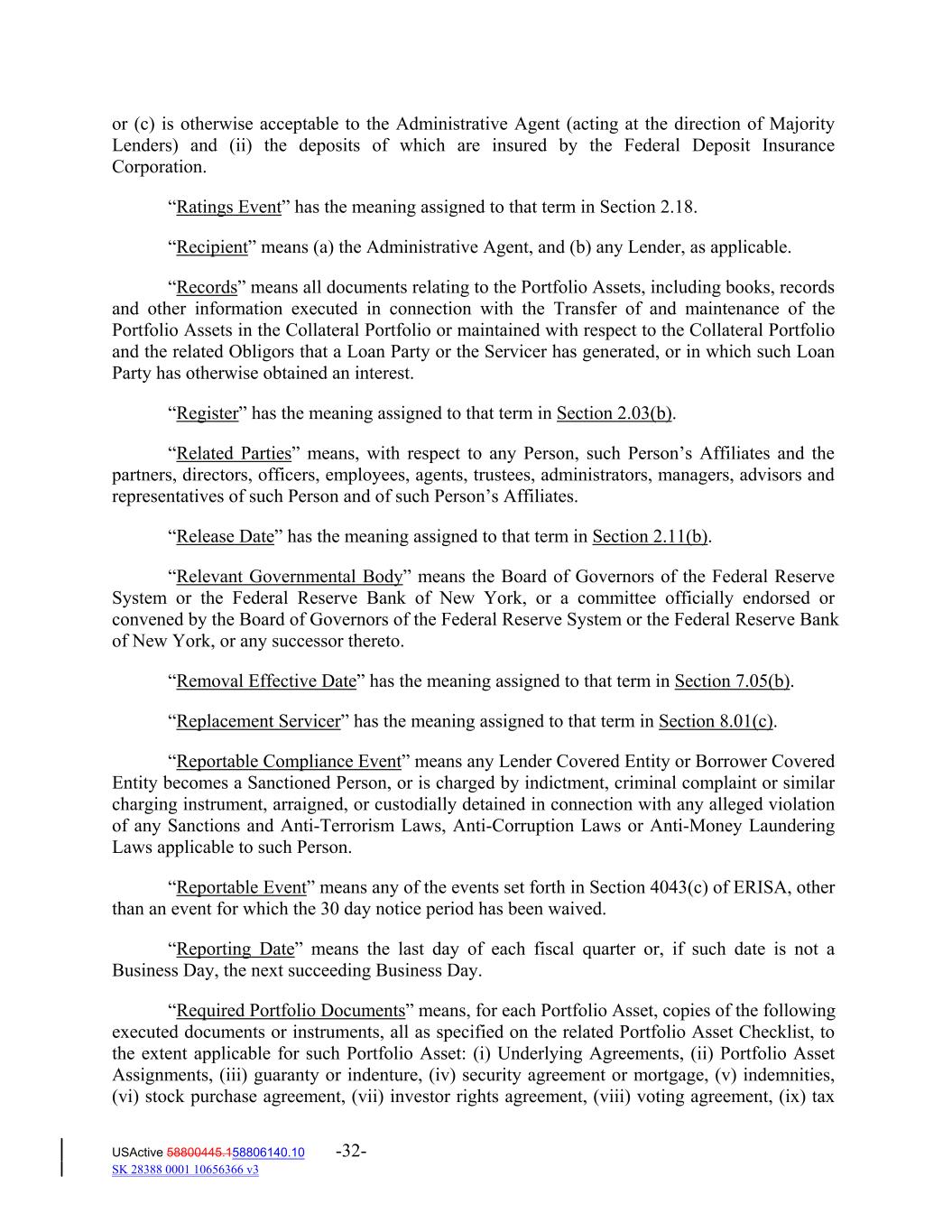 or (c) is otherwise acceptable to the Administrative Agent (acting at the direction of Majority Lenders) and (ii) the deposits of which are insured by the Federal Deposit Insurance Corporation. “Ratings Event” has the meaning assigned to that term in Section 2.18. “Recipient” means (a) the Administrative Agent, and (b) any Lender, as applicable. “Records” means all documents relating to the Portfolio Assets, including books, records and other information executed in connection with the Transfer of and maintenance of the Portfolio Assets in the Collateral Portfolio or maintained with respect to the Collateral Portfolio and the related Obligors that a Loan Party or the Servicer has generated, or in which such Loan Party has otherwise obtained an interest. “Register” has the meaning assigned to that term in Section 2.03(b). “Related Parties” means, with respect to any Person, such Person’s Affiliates and the partners, directors, officers, employees, agents, trustees, administrators, managers, advisors and representatives of such Person and of such Person’s Affiliates. “Release Date” has the meaning assigned to that term in Section 2.11(b). “Relevant Governmental Body” means the Board of Governors of the Federal Reserve System or the Federal Reserve Bank of New York, or a committee officially endorsed or convened by the Board of Governors of the Federal Reserve System or the Federal Reserve Bank of New York, or any successor thereto. “Removal Effective Date” has the meaning assigned to that term in Section 7.05(b). “Replacement Servicer” has the meaning assigned to that term in Section 8.01(c). “Reportable Compliance Event” means any Lender Covered Entity or Borrower Covered Entity becomes a Sanctioned Person, or is charged by indictment, criminal complaint or similar charging instrument, arraigned, or custodially detained in connection with any alleged violation of any Sanctions and Anti‐Terrorism Laws, Anti‐Corruption Laws or Anti‐Money Laundering Laws applicable to such Person. “Reportable Event” means any of the events set forth in Section 4043(c) of ERISA, other than an event for which the 30 day notice period has been waived. “Reporting Date” means the last day of each fiscal quarter or, if such date is not a Business Day, the next succeeding Business Day. “Required Portfolio Documents” means, for each Portfolio Asset, copies of the following executed documents or instruments, all as specified on the related Portfolio Asset Checklist, to the extent applicable for such Portfolio Asset: (i) Underlying Agreements, (ii) Portfolio Asset Assignments, (iii) guaranty or indenture, (iv) security agreement or mortgage, (v) indemnities, (vi) stock purchase agreement, (vii) investor rights agreement, (viii) voting agreement, (ix) tax USActive 58800445.158806140.10 -32- SK 28388 0001 10656366 v3