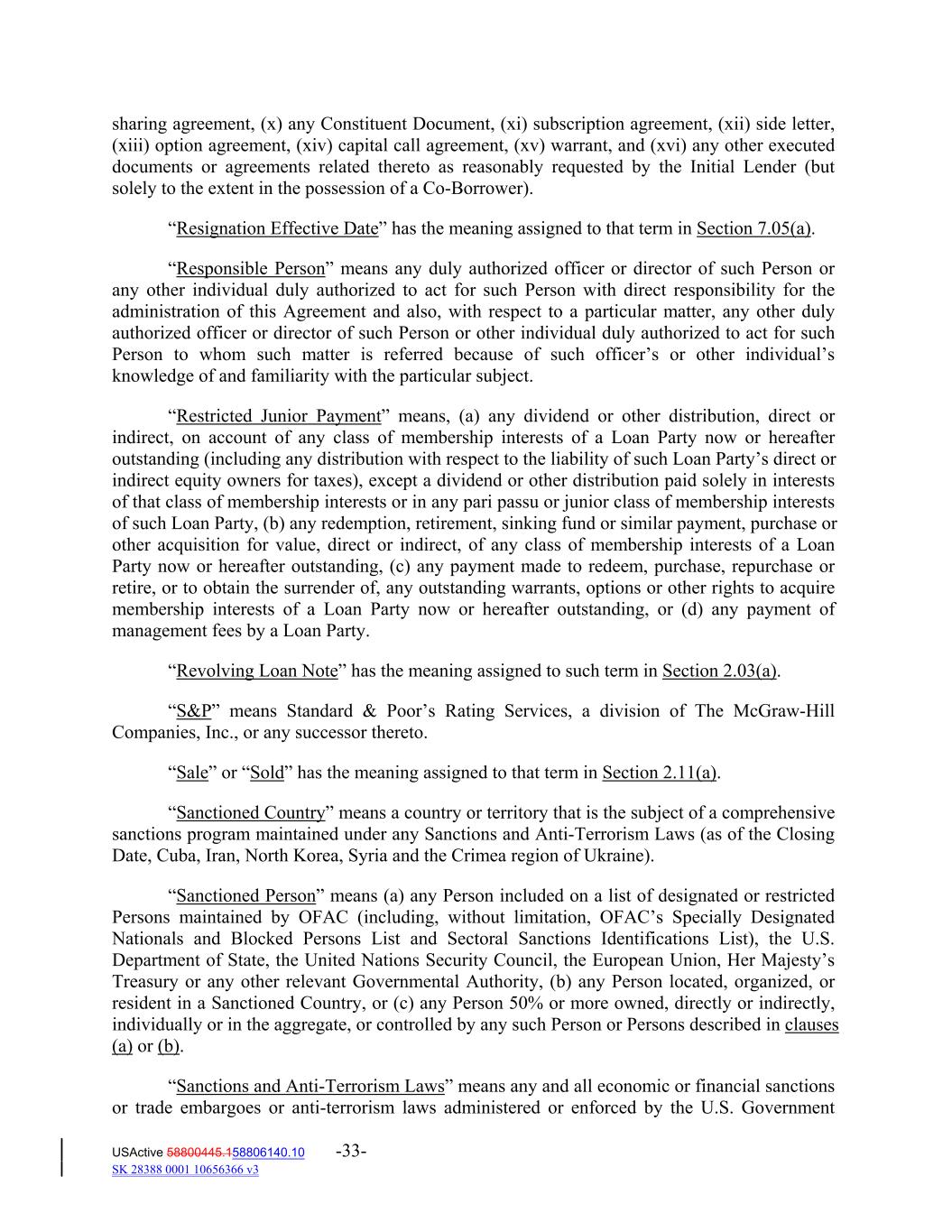 sharing agreement, (x) any Constituent Document, (xi) subscription agreement, (xii) side letter, (xiii) option agreement, (xiv) capital call agreement, (xv) warrant, and (xvi) any other executed documents or agreements related thereto as reasonably requested by the Initial Lender (but solely to the extent in the possession of a Co‐Borrower). “Resignation Effective Date” has the meaning assigned to that term in Section 7.05(a). “Responsible Person” means any duly authorized officer or director of such Person or any other individual duly authorized to act for such Person with direct responsibility for the administration of this Agreement and also, with respect to a particular matter, any other duly authorized officer or director of such Person or other individual duly authorized to act for such Person to whom such matter is referred because of such officer’s or other individual’s knowledge of and familiarity with the particular subject. “Restricted Junior Payment” means, (a) any dividend or other distribution, direct or indirect, on account of any class of membership interests of a Loan Party now or hereafter outstanding (including any distribution with respect to the liability of such Loan Party’s direct or indirect equity owners for taxes), except a dividend or other distribution paid solely in interests of that class of membership interests or in any pari passu or junior class of membership interests of such Loan Party, (b) any redemption, retirement, sinking fund or similar payment, purchase or other acquisition for value, direct or indirect, of any class of membership interests of a Loan Party now or hereafter outstanding, (c) any payment made to redeem, purchase, repurchase or retire, or to obtain the surrender of, any outstanding warrants, options or other rights to acquire membership interests of a Loan Party now or hereafter outstanding, or (d) any payment of management fees by a Loan Party. “Revolving Loan Note” has the meaning assigned to such term in Section 2.03(a). “S&P” means Standard & Poor’s Rating Services, a division of The McGraw‐Hill Companies, Inc., or any successor thereto. “Sale” or “Sold” has the meaning assigned to that term in Section 2.11(a). “Sanctioned Country” means a country or territory that is the subject of a comprehensive sanctions program maintained under any Sanctions and Anti‐Terrorism Laws (as of the Closing Date, Cuba, Iran, North Korea, Syria and the Crimea region of Ukraine). “Sanctioned Person” means (a) any Person included on a list of designated or restricted Persons maintained by OFAC (including, without limitation, OFAC’s Specially Designated Nationals and Blocked Persons List and Sectoral Sanctions Identifications List), the U.S. Department of State, the United Nations Security Council, the European Union, Her Majesty’s Treasury or any other relevant Governmental Authority, (b) any Person located, organized, or resident in a Sanctioned Country, or (c) any Person 50% or more owned, directly or indirectly, individually or in the aggregate, or controlled by any such Person or Persons described in clauses (a) or (b). “Sanctions and Anti‐Terrorism Laws” means any and all economic or financial sanctions or trade embargoes or anti‐terrorism laws administered or enforced by the U.S. Government USActive 58800445.158806140.10 -33- SK 28388 0001 10656366 v3