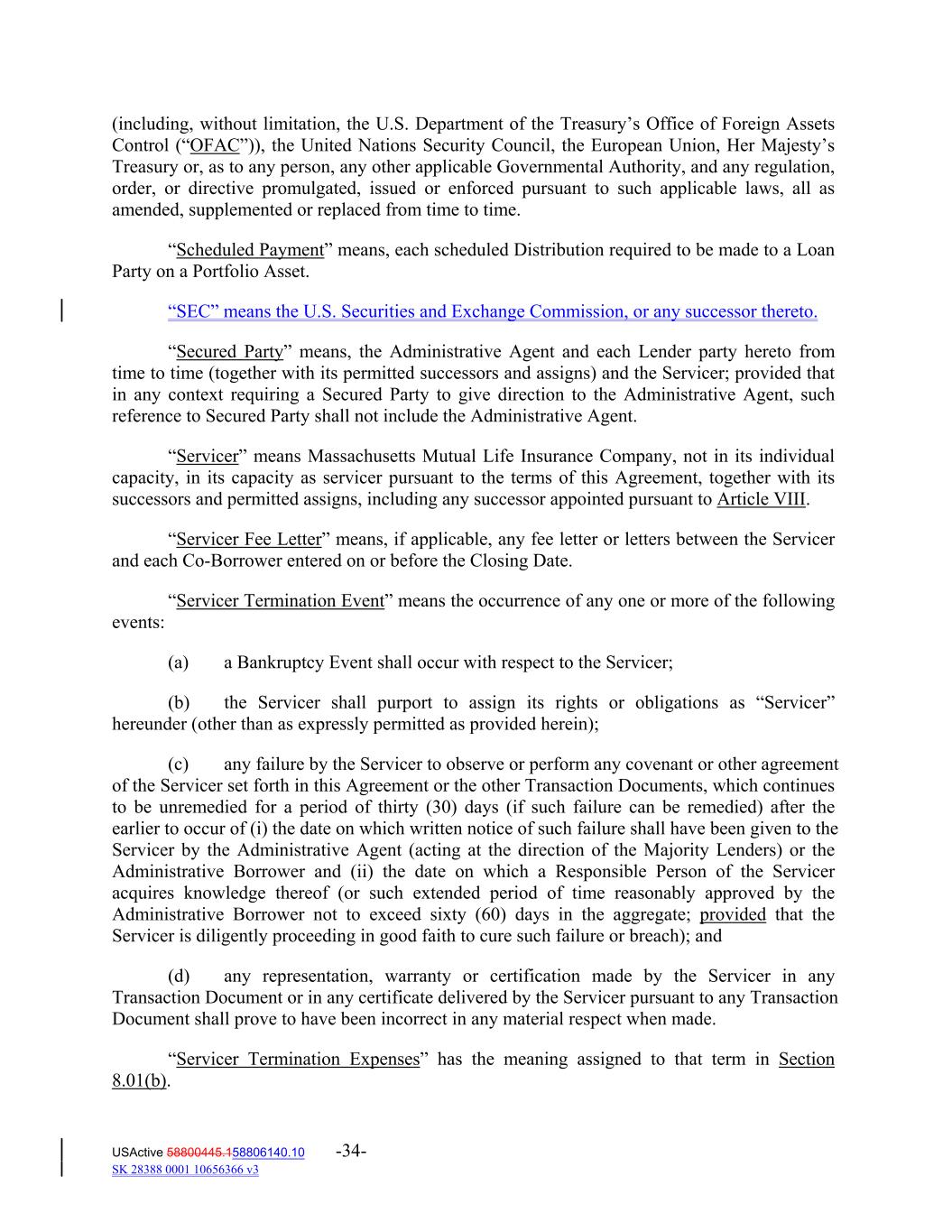 (including, without limitation, the U.S. Department of the Treasury’s Office of Foreign Assets Control (“OFAC”)), the United Nations Security Council, the European Union, Her Majesty’s Treasury or, as to any person, any other applicable Governmental Authority, and any regulation, order, or directive promulgated, issued or enforced pursuant to such applicable laws, all as amended, supplemented or replaced from time to time. “Scheduled Payment” means, each scheduled Distribution required to be made to a Loan Party on a Portfolio Asset. “SEC” means the U.S. Securities and Exchange Commission, or any successor thereto. “Secured Party” means, the Administrative Agent and each Lender party hereto from time to time (together with its permitted successors and assigns) and the Servicer; provided that in any context requiring a Secured Party to give direction to the Administrative Agent, such reference to Secured Party shall not include the Administrative Agent. “Servicer” means Massachusetts Mutual Life Insurance Company, not in its individual capacity, in its capacity as servicer pursuant to the terms of this Agreement, together with its successors and permitted assigns, including any successor appointed pursuant to Article VIII. “Servicer Fee Letter” means, if applicable, any fee letter or letters between the Servicer and each Co‐Borrower entered on or before the Closing Date. “Servicer Termination Event” means the occurrence of any one or more of the following events: (a) a Bankruptcy Event shall occur with respect to the Servicer; (b) the Servicer shall purport to assign its rights or obligations as “Servicer” hereunder (other than as expressly permitted as provided herein); (c) any failure by the Servicer to observe or perform any covenant or other agreement of the Servicer set forth in this Agreement or the other Transaction Documents, which continues to be unremedied for a period of thirty (30) days (if such failure can be remedied) after the earlier to occur of (i) the date on which written notice of such failure shall have been given to the Servicer by the Administrative Agent (acting at the direction of the Majority Lenders) or the Administrative Borrower and (ii) the date on which a Responsible Person of the Servicer acquires knowledge thereof (or such extended period of time reasonably approved by the Administrative Borrower not to exceed sixty (60) days in the aggregate; provided that the Servicer is diligently proceeding in good faith to cure such failure or breach); and (d) any representation, warranty or certification made by the Servicer in any Transaction Document or in any certificate delivered by the Servicer pursuant to any Transaction Document shall prove to have been incorrect in any material respect when made. “Servicer Termination Expenses” has the meaning assigned to that term in Section 8.01(b). USActive 58800445.158806140.10 -34- SK 28388 0001 10656366 v3