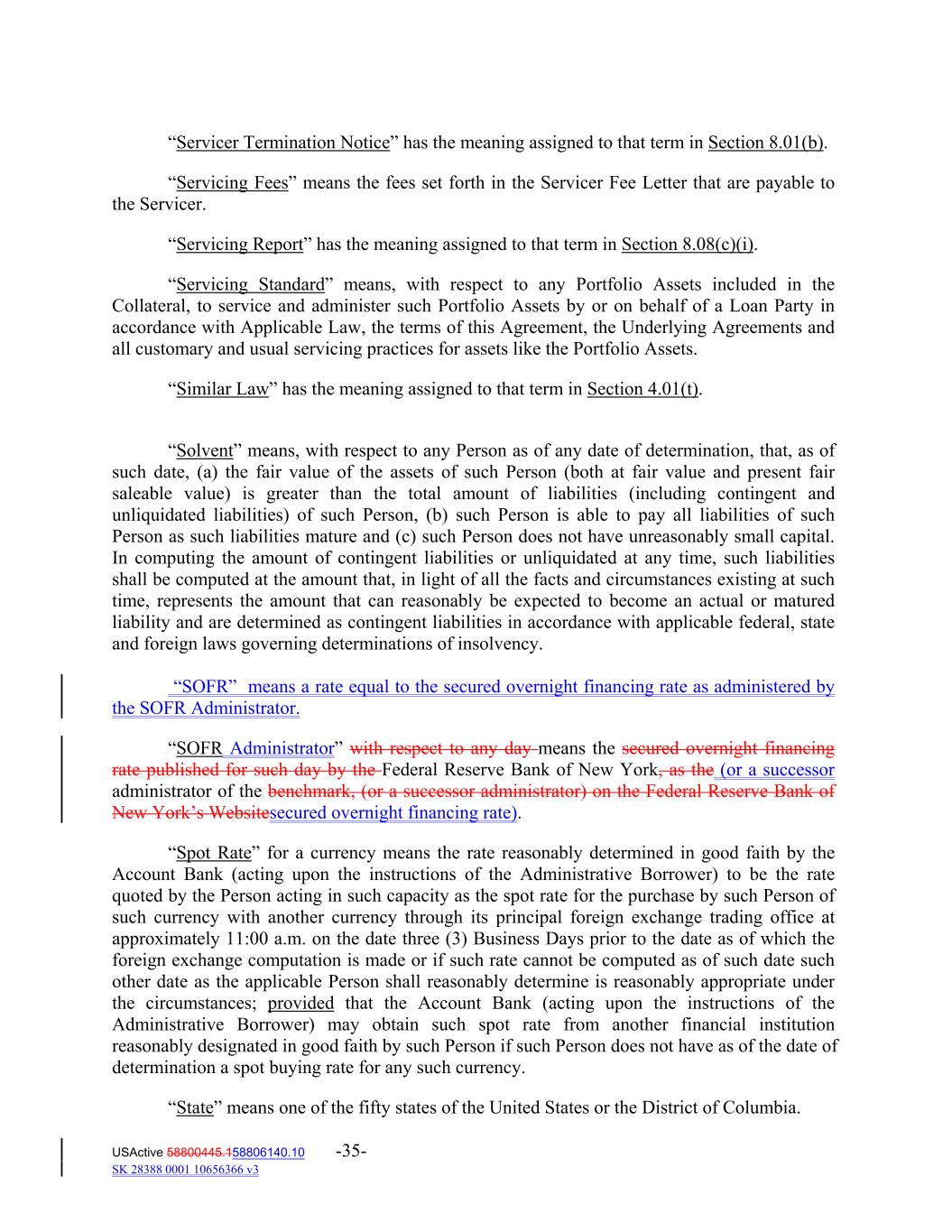 “Servicer Termination Notice” has the meaning assigned to that term in Section 8.01(b). “Servicing Fees” means the fees set forth in the Servicer Fee Letter that are payable to the Servicer. “Servicing Report” has the meaning assigned to that term in Section 8.08(c)(i). “Servicing Standard” means, with respect to any Portfolio Assets included in the Collateral, to service and administer such Portfolio Assets by or on behalf of a Loan Party in accordance with Applicable Law, the terms of this Agreement, the Underlying Agreements and all customary and usual servicing practices for assets like the Portfolio Assets. “Similar Law” has the meaning assigned to that term in Section 4.01(t). “Solvent” means, with respect to any Person as of any date of determination, that, as of such date, (a) the fair value of the assets of such Person (both at fair value and present fair saleable value) is greater than the total amount of liabilities (including contingent and unliquidated liabilities) of such Person, (b) such Person is able to pay all liabilities of such Person as such liabilities mature and (c) such Person does not have unreasonably small capital. In computing the amount of contingent liabilities or unliquidated at any time, such liabilities shall be computed at the amount that, in light of all the facts and circumstances existing at such time, represents the amount that can reasonably be expected to become an actual or matured liability and are determined as contingent liabilities in accordance with applicable federal, state and foreign laws governing determinations of insolvency. “SOFR” means a rate equal to the secured overnight financing rate as administered by the SOFR Administrator. “SOFR Administrator” with respect to any day means the secured overnight financing rate published for such day by the Federal Reserve Bank of New York, as the (or a successor administrator of the benchmark, (or a successor administrator) on the Federal Reserve Bank of New York’s Websitesecured overnight financing rate). “Spot Rate” for a currency means the rate reasonably determined in good faith by the Account Bank (acting upon the instructions of the Administrative Borrower) to be the rate quoted by the Person acting in such capacity as the spot rate for the purchase by such Person of such currency with another currency through its principal foreign exchange trading office at approximately 11:00 a.m. on the date three (3) Business Days prior to the date as of which the foreign exchange computation is made or if such rate cannot be computed as of such date such other date as the applicable Person shall reasonably determine is reasonably appropriate under the circumstances; provided that the Account Bank (acting upon the instructions of the Administrative Borrower) may obtain such spot rate from another financial institution reasonably designated in good faith by such Person if such Person does not have as of the date of determination a spot buying rate for any such currency. “State” means one of the fifty states of the United States or the District of Columbia. USActive 58800445.158806140.10 -35- SK 28388 0001 10656366 v3