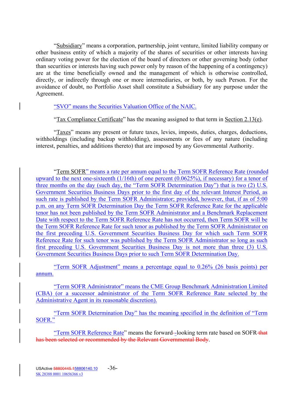 “Subsidiary” means a corporation, partnership, joint venture, limited liability company or other business entity of which a majority of the shares of securities or other interests having ordinary voting power for the election of the board of directors or other governing body (other than securities or interests having such power only by reason of the happening of a contingency) are at the time beneficially owned and the management of which is otherwise controlled, directly, or indirectly through one or more intermediaries, or both, by such Person. For the avoidance of doubt, no Portfolio Asset shall constitute a Subsidiary for any purpose under the Agreement. “SVO” means the Securities Valuation Office of the NAIC. “Tax Compliance Certificate” has the meaning assigned to that term in Section 2.13(e). “Taxes” means any present or future taxes, levies, imposts, duties, charges, deductions, withholdings (including backup withholding), assessments or fees of any nature (including interest, penalties, and additions thereto) that are imposed by any Governmental Authority. “Term SOFR” means a rate per annum equal to the Term SOFR Reference Rate (rounded upward to the next one-sixteenth (1/16th) of one percent (0.0625%), if necessary) for a tenor of three months on the day (such day, the “Term SOFR Determination Day”) that is two (2) U.S. Government Securities Business Days prior to the first day of the relevant Interest Period, as such rate is published by the Term SOFR Administrator; provided, however, that, if as of 5:00 p.m. on any Term SOFR Determination Day the Term SOFR Reference Rate for the applicable tenor has not been published by the Term SOFR Administrator and a Benchmark Replacement Date with respect to the Term SOFR Reference Rate has not occurred, then Term SOFR will be the Term SOFR Reference Rate for such tenor as published by the Term SOFR Administrator on the first preceding U.S. Government Securities Business Day for which such Term SOFR Reference Rate for such tenor was published by the Term SOFR Administrator so long as such first preceding U.S. Government Securities Business Day is not more than three (3) U.S. Government Securities Business Days prior to such Term SOFR Determination Day. “Term SOFR Adjustment” means a percentage equal to 0.26% (26 basis points) per annum. “Term SOFR Administrator” means the CME Group Benchmark Administration Limited (CBA) (or a successor administrator of the Term SOFR Reference Rate selected by the Administrative Agent in its reasonable discretion). “Term SOFR Determination Day” has the meaning specified in the definition of “Term SOFR.” “Term SOFR Reference Rate” means the forward -looking term rate based on SOFR that has been selected or recommended by the Relevant Governmental Body. USActive 58800445.158806140.10 -36- SK 28388 0001 10656366 v3