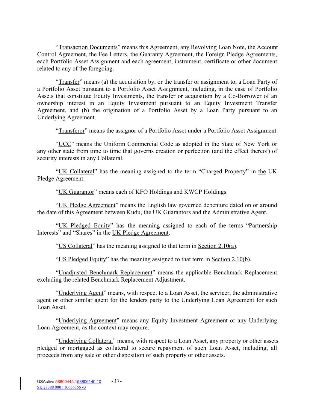 “Transaction Documents” means this Agreement, any Revolving Loan Note, the Account Control Agreement, the Fee Letters, the Guaranty Agreement, the Foreign Pledge Agreements, each Portfolio Asset Assignment and each agreement, instrument, certificate or other document related to any of the foregoing. “Transfer” means (a) the acquisition by, or the transfer or assignment to, a Loan Party of a Portfolio Asset pursuant to a Portfolio Asset Assignment, including, in the case of Portfolio Assets that constitute Equity Investments, the transfer or acquisition by a Co‐Borrower of an ownership interest in an Equity Investment pursuant to an Equity Investment Transfer Agreement, and (b) the origination of a Portfolio Asset by a Loan Party pursuant to an Underlying Agreement. “Transferor” means the assignor of a Portfolio Asset under a Portfolio Asset Assignment. “UCC” means the Uniform Commercial Code as adopted in the State of New York or any other state from time to time that governs creation or perfection (and the effect thereof) of security interests in any Collateral. “UK Collateral” has the meaning assigned to the term “Charged Property” in the UK Pledge Agreement. “UK Guarantor” means each of KFO Holdings and KWCP Holdings. “UK Pledge Agreement” means the English law governed debenture dated on or around the date of this Agreement between Kudu, the UK Guarantors and the Administrative Agent. “UK Pledged Equity” has the meaning assigned to each of the terms “Partnership Interests” and “Shares” in the UK Pledge Agreement. “US Collateral” has the meaning assigned to that term in Section 2.10(a). “US Pledged Equity” has the meaning assigned to that term in Section 2.10(b). “Unadjusted Benchmark Replacement” means the applicable Benchmark Replacement excluding the related Benchmark Replacement Adjustment. “Underlying Agent” means, with respect to a Loan Asset, the servicer, the administrative agent or other similar agent for the lenders party to the Underlying Loan Agreement for such Loan Asset. “Underlying Agreement” means any Equity Investment Agreement or any Underlying Loan Agreement, as the context may require. “Underlying Collateral” means, with respect to a Loan Asset, any property or other assets pledged or mortgaged as collateral to secure repayment of such Loan Asset, including, all proceeds from any sale or other disposition of such property or other assets. USActive 58800445.158806140.10 -37- SK 28388 0001 10656366 v3