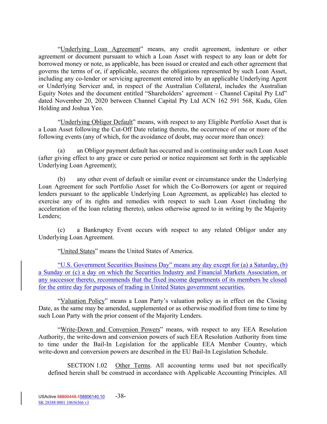 “Underlying Loan Agreement” means, any credit agreement, indenture or other agreement or document pursuant to which a Loan Asset with respect to any loan or debt for borrowed money or note, as applicable, has been issued or created and each other agreement that governs the terms of or, if applicable, secures the obligations represented by such Loan Asset, including any co‐lender or servicing agreement entered into by an applicable Underlying Agent or Underlying Servicer and, in respect of the Australian Collateral, includes the Australian Equity Notes and the document entitled “Shareholders’ agreement – Channel Capital Pty Ltd” dated November 20, 2020 between Channel Capital Pty Ltd ACN 162 591 568, Kudu, Glen Holding and Joshua Yeo. “Underlying Obligor Default” means, with respect to any Eligible Portfolio Asset that is a Loan Asset following the Cut‐Off Date relating thereto, the occurrence of one or more of the following events (any of which, for the avoidance of doubt, may occur more than once): (a) an Obligor payment default has occurred and is continuing under such Loan Asset (after giving effect to any grace or cure period or notice requirement set forth in the applicable Underlying Loan Agreement); (b) any other event of default or similar event or circumstance under the Underlying Loan Agreement for such Portfolio Asset for which the Co‐Borrowers (or agent or required lenders pursuant to the applicable Underlying Loan Agreement, as applicable) has elected to exercise any of its rights and remedies with respect to such Loan Asset (including the acceleration of the loan relating thereto), unless otherwise agreed to in writing by the Majority Lenders; (c) a Bankruptcy Event occurs with respect to any related Obligor under any Underlying Loan Agreement. “United States” means the United States of America. “U.S. Government Securities Business Day” means any day except for (a) a Saturday, (b) a Sunday or (c) a day on which the Securities Industry and Financial Markets Association, or any successor thereto, recommends that the fixed income departments of its members be closed for the entire day for purposes of trading in United States government securities. “Valuation Policy” means a Loan Party’s valuation policy as in effect on the Closing Date, as the same may be amended, supplemented or as otherwise modified from time to time by such Loan Party with the prior consent of the Majority Lenders. “Write‐Down and Conversion Powers” means, with respect to any EEA Resolution Authority, the write‐down and conversion powers of such EEA Resolution Authority from time to time under the Bail‐In Legislation for the applicable EEA Member Country, which write‐down and conversion powers are described in the EU Bail‐In Legislation Schedule. SECTION 1.02 Other Terms. All accounting terms used but not specifically defined herein shall be construed in accordance with Applicable Accounting Principles. All USActive 58800445.158806140.10 -38- SK 28388 0001 10656366 v3
