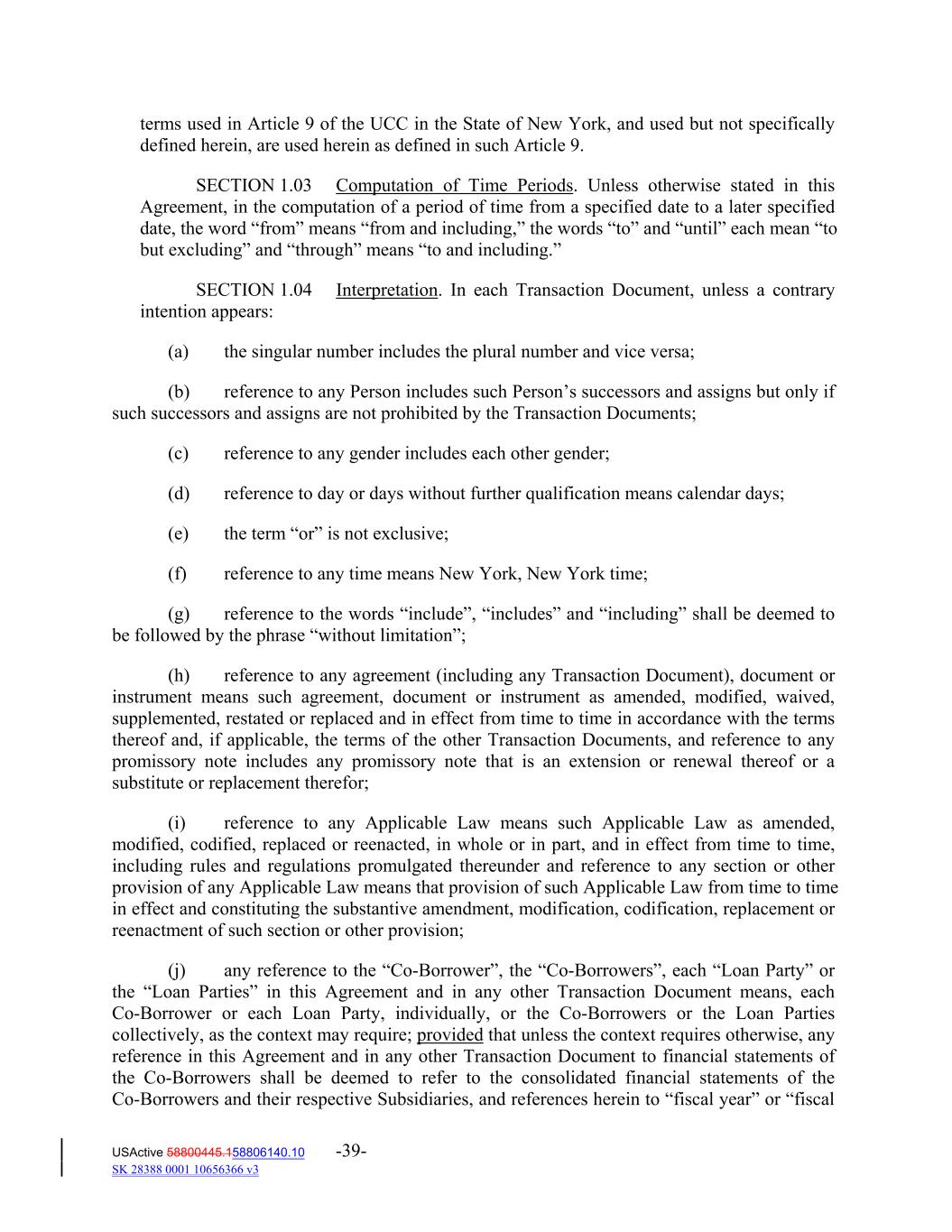 terms used in Article 9 of the UCC in the State of New York, and used but not specifically defined herein, are used herein as defined in such Article 9. SECTION 1.03 Computation of Time Periods. Unless otherwise stated in this Agreement, in the computation of a period of time from a specified date to a later specified date, the word “from” means “from and including,” the words “to” and “until” each mean “to but excluding” and “through” means “to and including.” SECTION 1.04 Interpretation. In each Transaction Document, unless a contrary intention appears: (a) the singular number includes the plural number and vice versa; (b) reference to any Person includes such Person’s successors and assigns but only if such successors and assigns are not prohibited by the Transaction Documents; (c) reference to any gender includes each other gender; (d) reference to day or days without further qualification means calendar days; (e) the term “or” is not exclusive; (f) reference to any time means New York, New York time; (g) reference to the words “include”, “includes” and “including” shall be deemed to be followed by the phrase “without limitation”; (h) reference to any agreement (including any Transaction Document), document or instrument means such agreement, document or instrument as amended, modified, waived, supplemented, restated or replaced and in effect from time to time in accordance with the terms thereof and, if applicable, the terms of the other Transaction Documents, and reference to any promissory note includes any promissory note that is an extension or renewal thereof or a substitute or replacement therefor; (i) reference to any Applicable Law means such Applicable Law as amended, modified, codified, replaced or reenacted, in whole or in part, and in effect from time to time, including rules and regulations promulgated thereunder and reference to any section or other provision of any Applicable Law means that provision of such Applicable Law from time to time in effect and constituting the substantive amendment, modification, codification, replacement or reenactment of such section or other provision; (j) any reference to the “Co‐Borrower”, the “Co‐Borrowers”, each “Loan Party” or the “Loan Parties” in this Agreement and in any other Transaction Document means, each Co‐Borrower or each Loan Party, individually, or the Co‐Borrowers or the Loan Parties collectively, as the context may require; provided that unless the context requires otherwise, any reference in this Agreement and in any other Transaction Document to financial statements of the Co‐Borrowers shall be deemed to refer to the consolidated financial statements of the Co‐Borrowers and their respective Subsidiaries, and references herein to “fiscal year” or “fiscal USActive 58800445.158806140.10 -39- SK 28388 0001 10656366 v3