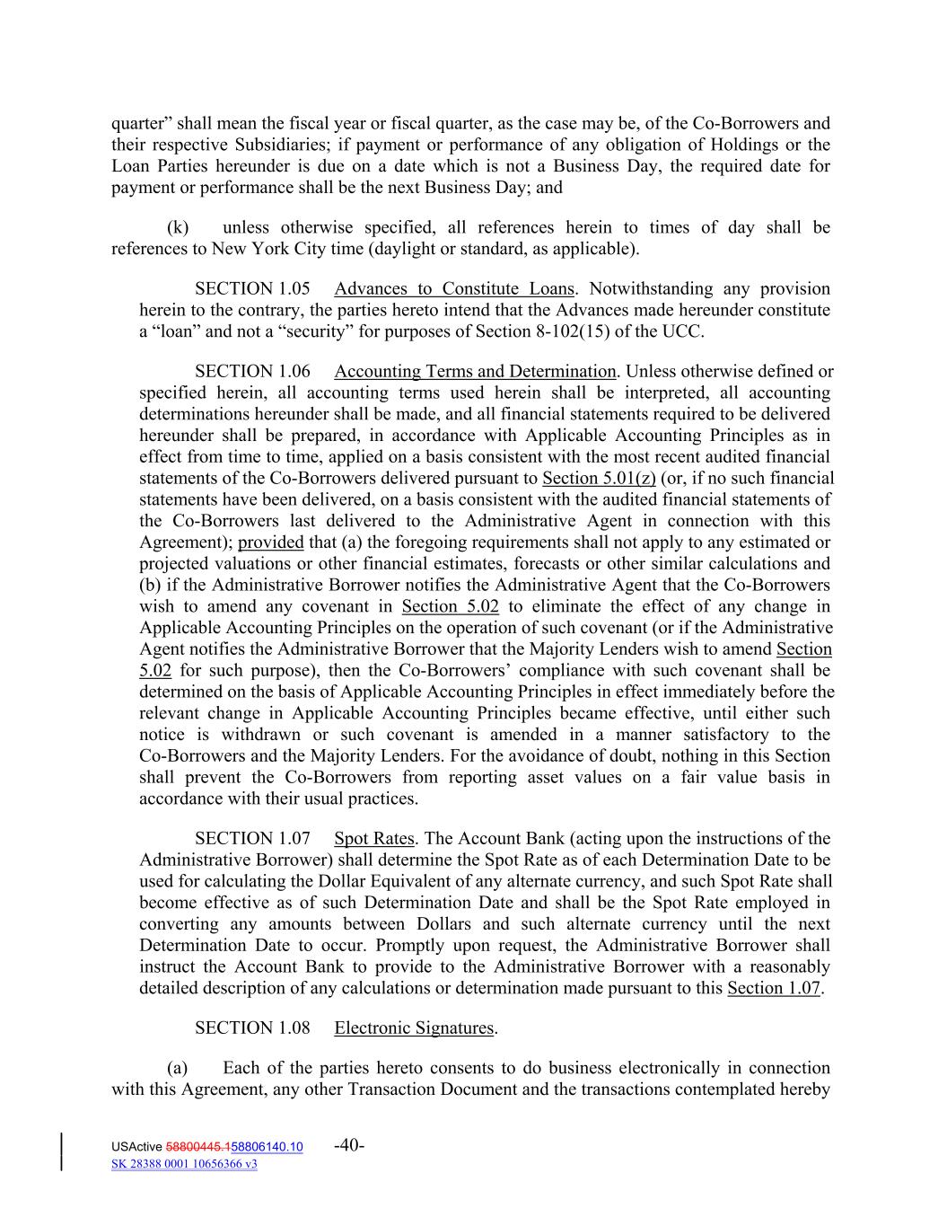 quarter” shall mean the fiscal year or fiscal quarter, as the case may be, of the Co‐Borrowers and their respective Subsidiaries; if payment or performance of any obligation of Holdings or the Loan Parties hereunder is due on a date which is not a Business Day, the required date for payment or performance shall be the next Business Day; and (k) unless otherwise specified, all references herein to times of day shall be references to New York City time (daylight or standard, as applicable). SECTION 1.05 Advances to Constitute Loans. Notwithstanding any provision herein to the contrary, the parties hereto intend that the Advances made hereunder constitute a “loan” and not a “security” for purposes of Section 8‐102(15) of the UCC. SECTION 1.06 Accounting Terms and Determination. Unless otherwise defined or specified herein, all accounting terms used herein shall be interpreted, all accounting determinations hereunder shall be made, and all financial statements required to be delivered hereunder shall be prepared, in accordance with Applicable Accounting Principles as in effect from time to time, applied on a basis consistent with the most recent audited financial statements of the Co‐Borrowers delivered pursuant to Section 5.01(z) (or, if no such financial statements have been delivered, on a basis consistent with the audited financial statements of the Co‐Borrowers last delivered to the Administrative Agent in connection with this Agreement); provided that (a) the foregoing requirements shall not apply to any estimated or projected valuations or other financial estimates, forecasts or other similar calculations and (b) if the Administrative Borrower notifies the Administrative Agent that the Co‐Borrowers wish to amend any covenant in Section 5.02 to eliminate the effect of any change in Applicable Accounting Principles on the operation of such covenant (or if the Administrative Agent notifies the Administrative Borrower that the Majority Lenders wish to amend Section 5.02 for such purpose), then the Co‐Borrowers’ compliance with such covenant shall be determined on the basis of Applicable Accounting Principles in effect immediately before the relevant change in Applicable Accounting Principles became effective, until either such notice is withdrawn or such covenant is amended in a manner satisfactory to the Co‐Borrowers and the Majority Lenders. For the avoidance of doubt, nothing in this Section shall prevent the Co‐Borrowers from reporting asset values on a fair value basis in accordance with their usual practices. SECTION 1.07 Spot Rates. The Account Bank (acting upon the instructions of the Administrative Borrower) shall determine the Spot Rate as of each Determination Date to be used for calculating the Dollar Equivalent of any alternate currency, and such Spot Rate shall become effective as of such Determination Date and shall be the Spot Rate employed in converting any amounts between Dollars and such alternate currency until the next Determination Date to occur. Promptly upon request, the Administrative Borrower shall instruct the Account Bank to provide to the Administrative Borrower with a reasonably detailed description of any calculations or determination made pursuant to this Section 1.07. SECTION 1.08 Electronic Signatures. (a) Each of the parties hereto consents to do business electronically in connection with this Agreement, any other Transaction Document and the transactions contemplated hereby USActive 58800445.158806140.10 -40- SK 28388 0001 10656366 v3
