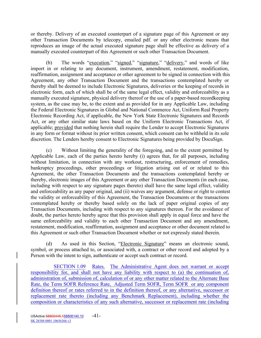 or thereby. Delivery of an executed counterpart of a signature page of this Agreement or any other Transaction Documents by telecopy, emailed pdf. or any other electronic means that reproduces an image of the actual executed signature page shall be effective as delivery of a manually executed counterpart of this Agreement or such other Transaction Document. (b) The words “execution,” “signed,” “signature,” “delivery,” and words of like import in or relating to any document, instrument, amendment, restatement, modification, reaffirmation, assignment and acceptance or other agreement to be signed in connection with this Agreement, any other Transaction Document and the transactions contemplated hereby or thereby shall be deemed to include Electronic Signatures, deliveries or the keeping of records in electronic form, each of which shall be of the same legal effect, validity and enforceability as a manually executed signature, physical delivery thereof or the use of a paper‐based recordkeeping system, as the case may be, to the extent and as provided for in any Applicable Law, including the Federal Electronic Signatures in Global and National Commerce Act, Uniform Real Property Electronic Recording Act, if applicable, the New York State Electronic Signatures and Records Act, or any other similar state laws based on the Uniform Electronic Transactions Act, if applicable; provided that nothing herein shall require the Lender to accept Electronic Signatures in any form or format without its prior written consent, which consent can be withheld in its sole discretion. The Lenders hereby consent to Electronic Signatures being provided by DocuSign. (c) Without limiting the generality of the foregoing, and to the extent permitted by Applicable Law, each of the parties hereto hereby (i) agrees that, for all purposes, including without limitation, in connection with any workout, restructuring, enforcement of remedies, bankruptcy proceedings, other proceedings or litigation arising out of or related to this Agreement, the other Transaction Documents and the transactions contemplated hereby or thereby, electronic images of this Agreement or any other Transaction Documents (in each case, including with respect to any signature pages thereto) shall have the same legal effect, validity and enforceability as any paper original, and (ii) waives any argument, defense or right to contest the validity or enforceability of this Agreement, the Transaction Documents or the transactions contemplated hereby or thereby based solely on the lack of paper original copies of any Transaction Documents, including with respect to any signatures thereon. For the avoidance of doubt, the parties hereto hereby agree that this provision shall apply in equal force and have the same enforceability and validity to each other Transaction Document and any amendment, restatement, modification, reaffirmation, assignment and acceptance or other document related to this Agreement or such other Transaction Document whether or not expressly stated therein. (d) As used in this Section, “Electronic Signature” means an electronic sound, symbol, or process attached to, or associated with, a contract or other record and adopted by a Person with the intent to sign, authenticate or accept such contract or record. SECTION 1.09 Rates. The Administrative Agent does not warrant or accept responsibility for, and shall not have any liability with respect to (a) the continuation of, administration of, submission of, calculation of or any other matter related to the Alternate Base Rate, the Term SOFR Reference Rate, Adjusted Term SOFR, Term SOFR or any component definition thereof or rates referred to in the definition thereof, or any alternative, successor or replacement rate thereto (including any Benchmark Replacement), including whether the composition or characteristics of any such alternative, successor or replacement rate (including USActive 58800445.158806140.10 -41- SK 28388 0001 10656366 v3