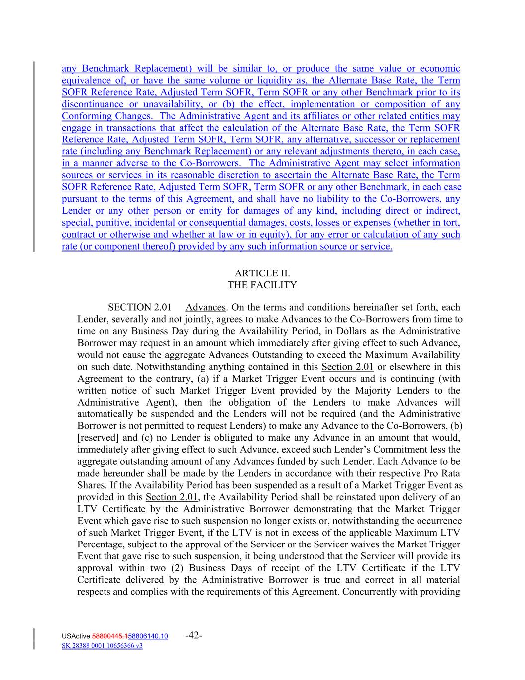 any Benchmark Replacement) will be similar to, or produce the same value or economic equivalence of, or have the same volume or liquidity as, the Alternate Base Rate, the Term SOFR Reference Rate, Adjusted Term SOFR, Term SOFR or any other Benchmark prior to its discontinuance or unavailability, or (b) the effect, implementation or composition of any Conforming Changes. The Administrative Agent and its affiliates or other related entities may engage in transactions that affect the calculation of the Alternate Base Rate, the Term SOFR Reference Rate, Adjusted Term SOFR, Term SOFR, any alternative, successor or replacement rate (including any Benchmark Replacement) or any relevant adjustments thereto, in each case, in a manner adverse to the Co-Borrowers. The Administrative Agent may select information sources or services in its reasonable discretion to ascertain the Alternate Base Rate, the Term SOFR Reference Rate, Adjusted Term SOFR, Term SOFR or any other Benchmark, in each case pursuant to the terms of this Agreement, and shall have no liability to the Co-Borrowers, any Lender or any other person or entity for damages of any kind, including direct or indirect, special, punitive, incidental or consequential damages, costs, losses or expenses (whether in tort, contract or otherwise and whether at law or in equity), for any error or calculation of any such rate (or component thereof) provided by any such information source or service. ARTICLE II. THE FACILITY SECTION 2.01 Advances. On the terms and conditions hereinafter set forth, each Lender, severally and not jointly, agrees to make Advances to the Co‐Borrowers from time to time on any Business Day during the Availability Period, in Dollars as the Administrative Borrower may request in an amount which immediately after giving effect to such Advance, would not cause the aggregate Advances Outstanding to exceed the Maximum Availability on such date. Notwithstanding anything contained in this Section 2.01 or elsewhere in this Agreement to the contrary, (a) if a Market Trigger Event occurs and is continuing (with written notice of such Market Trigger Event provided by the Majority Lenders to the Administrative Agent), then the obligation of the Lenders to make Advances will automatically be suspended and the Lenders will not be required (and the Administrative Borrower is not permitted to request Lenders) to make any Advance to the Co‐Borrowers, (b) [reserved] and (c) no Lender is obligated to make any Advance in an amount that would, immediately after giving effect to such Advance, exceed such Lender’s Commitment less the aggregate outstanding amount of any Advances funded by such Lender. Each Advance to be made hereunder shall be made by the Lenders in accordance with their respective Pro Rata Shares. If the Availability Period has been suspended as a result of a Market Trigger Event as provided in this Section 2.01, the Availability Period shall be reinstated upon delivery of an LTV Certificate by the Administrative Borrower demonstrating that the Market Trigger Event which gave rise to such suspension no longer exists or, notwithstanding the occurrence of such Market Trigger Event, if the LTV is not in excess of the applicable Maximum LTV Percentage, subject to the approval of the Servicer or the Servicer waives the Market Trigger Event that gave rise to such suspension, it being understood that the Servicer will provide its approval within two (2) Business Days of receipt of the LTV Certificate if the LTV Certificate delivered by the Administrative Borrower is true and correct in all material respects and complies with the requirements of this Agreement. Concurrently with providing USActive 58800445.158806140.10 -42- SK 28388 0001 10656366 v3